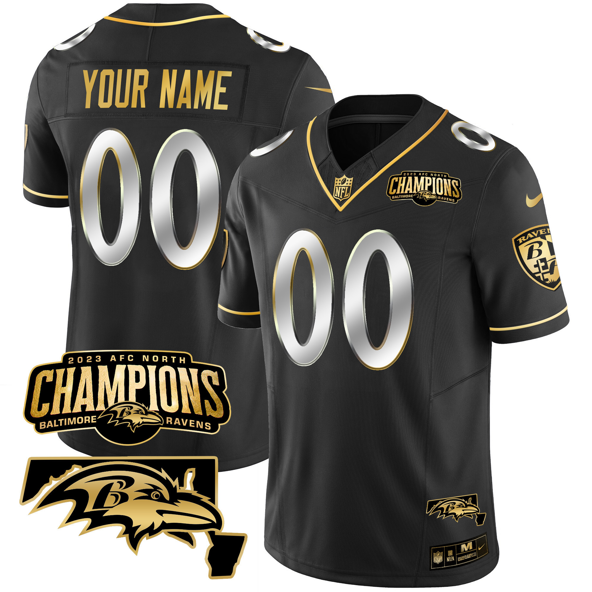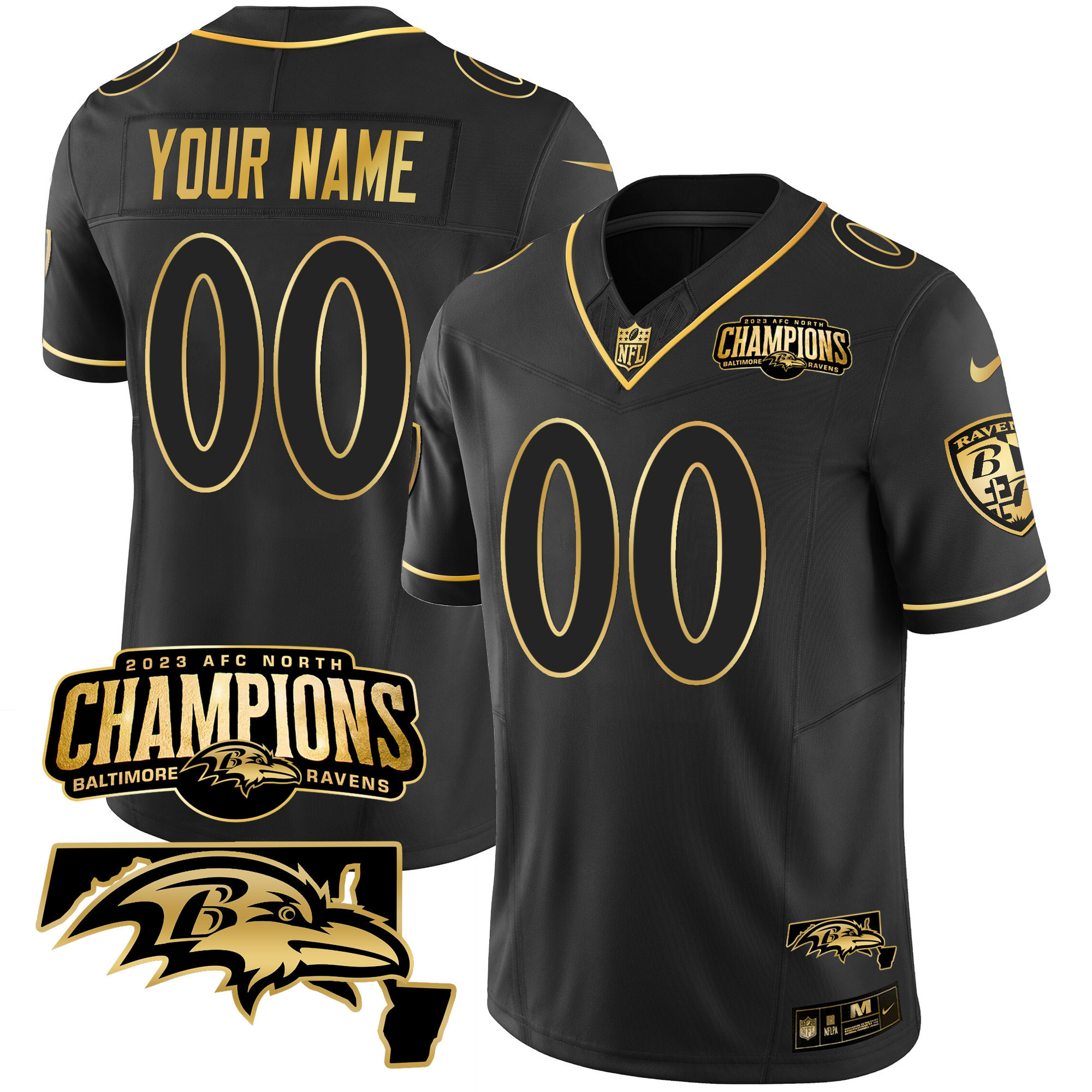 Baltimore Ravens 2023 AFC North Champions & Maryland Patch Gold Vapor Custom Jersey – All Stitched