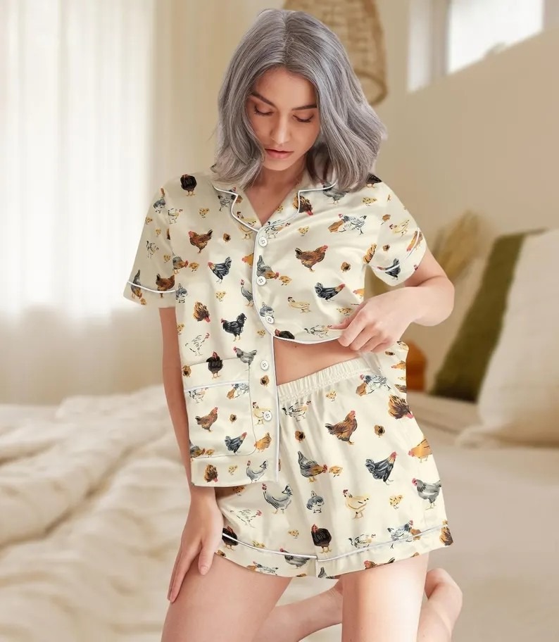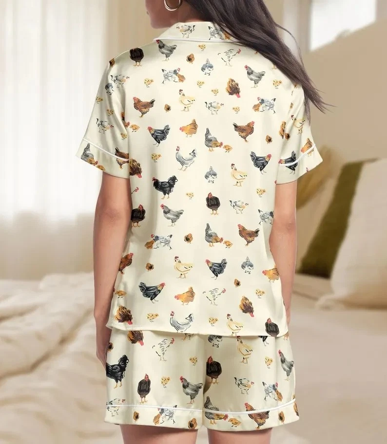 Chicken Print Satin Pajamas Set, Cute Farm Animal Sleepwear