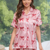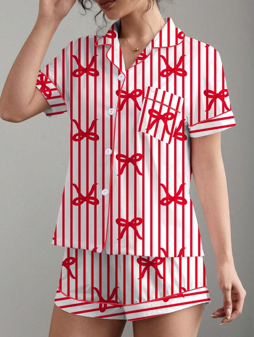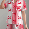 Christmas Red Striped Bow Print Satin Pajama Set For Women
