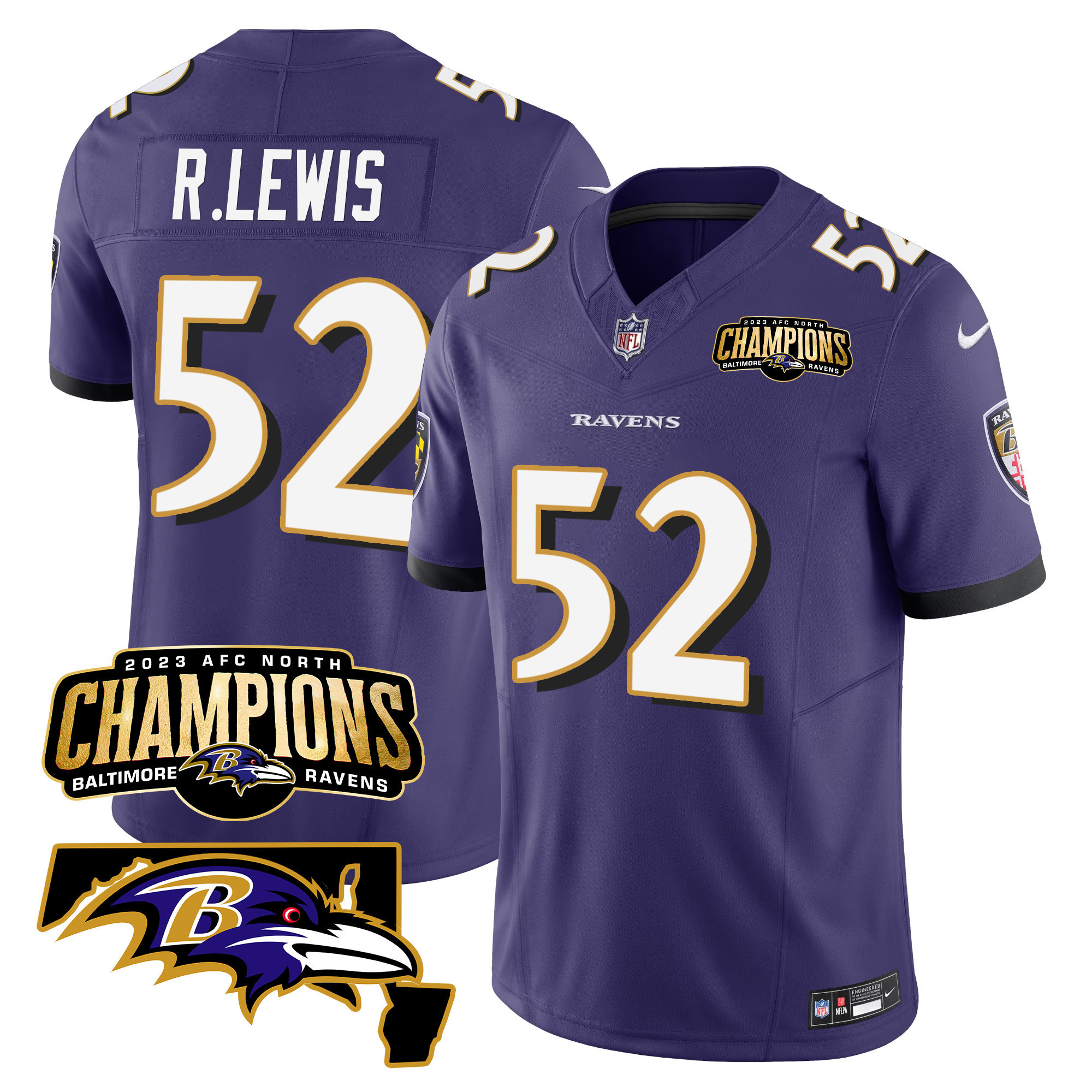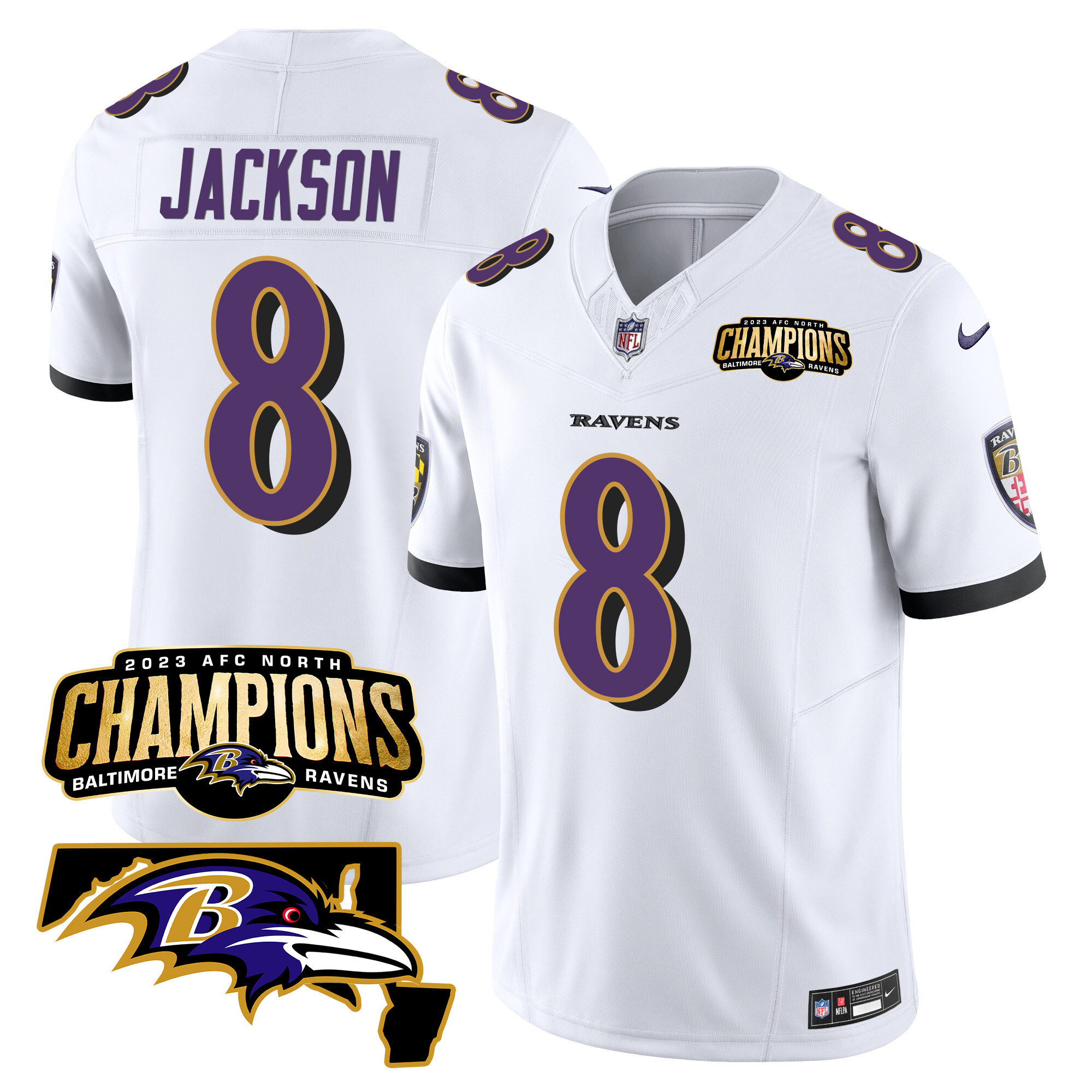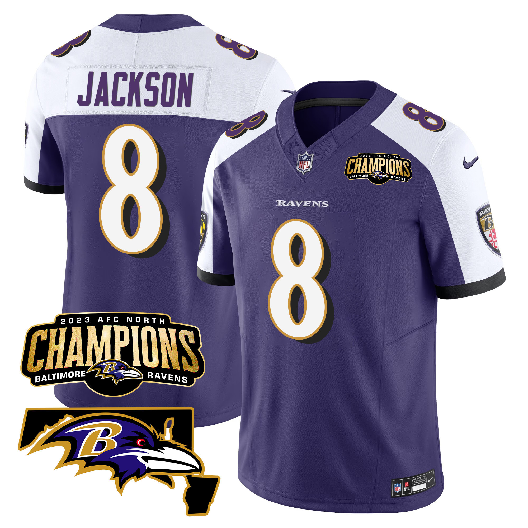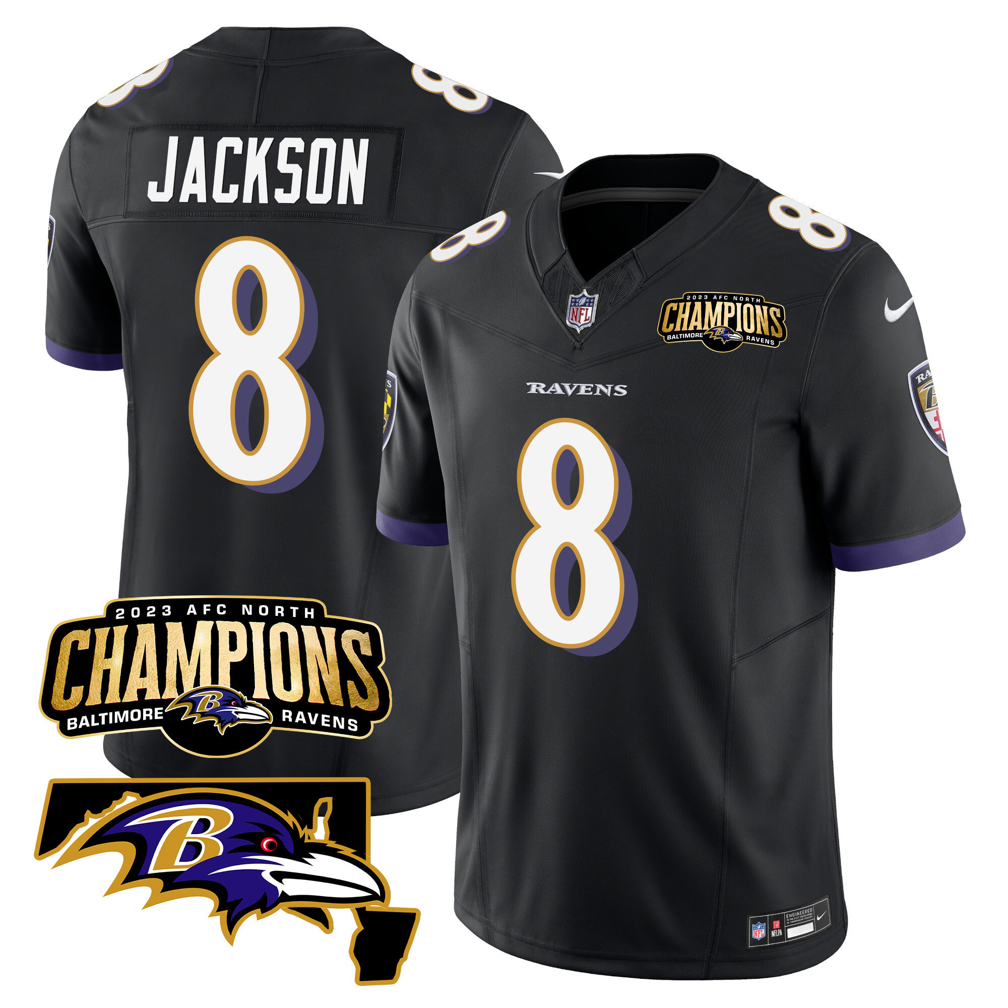 Men’s Baltimore Ravens 2023 AFC North Champions & Maryland Patch Vapor Jersey – All Stitched