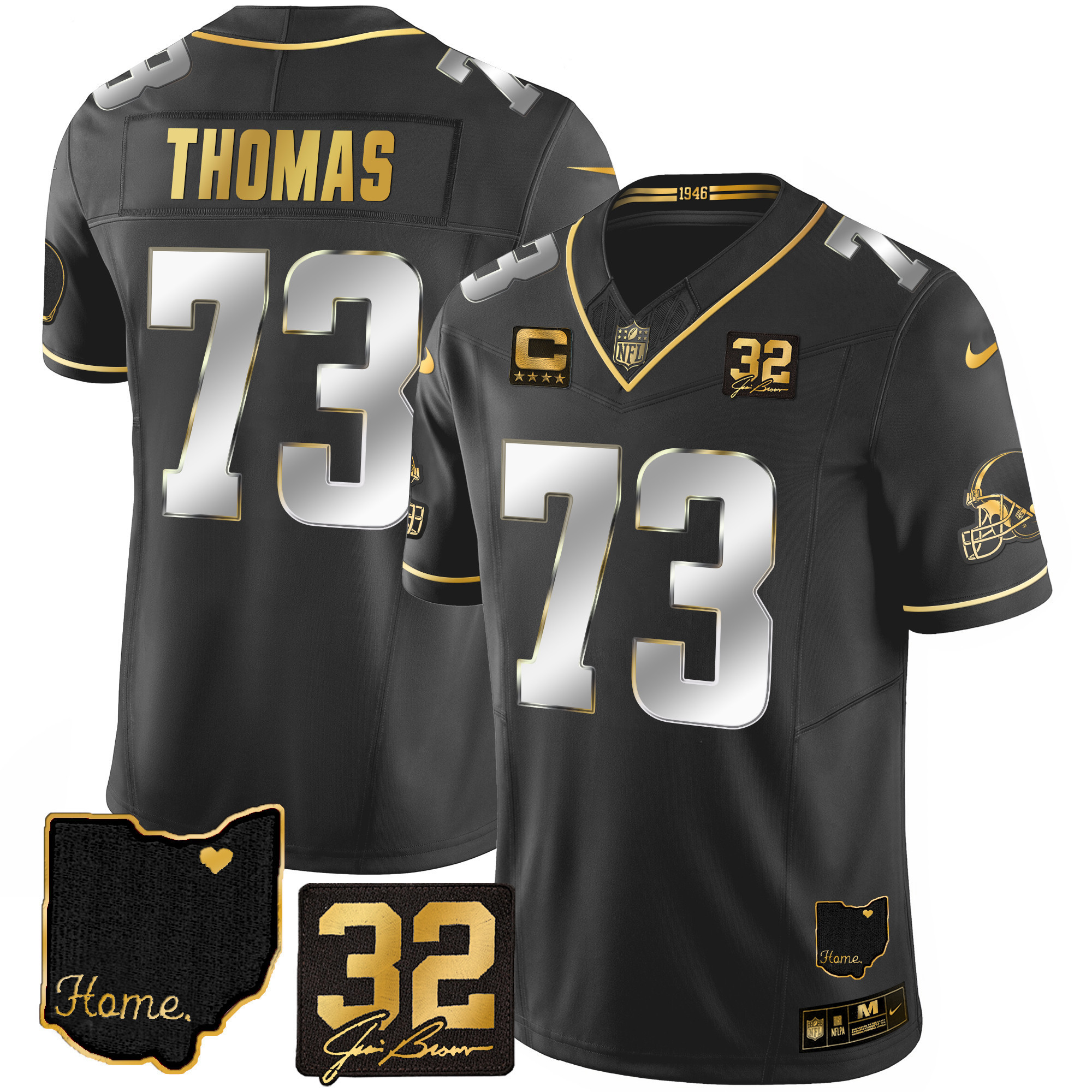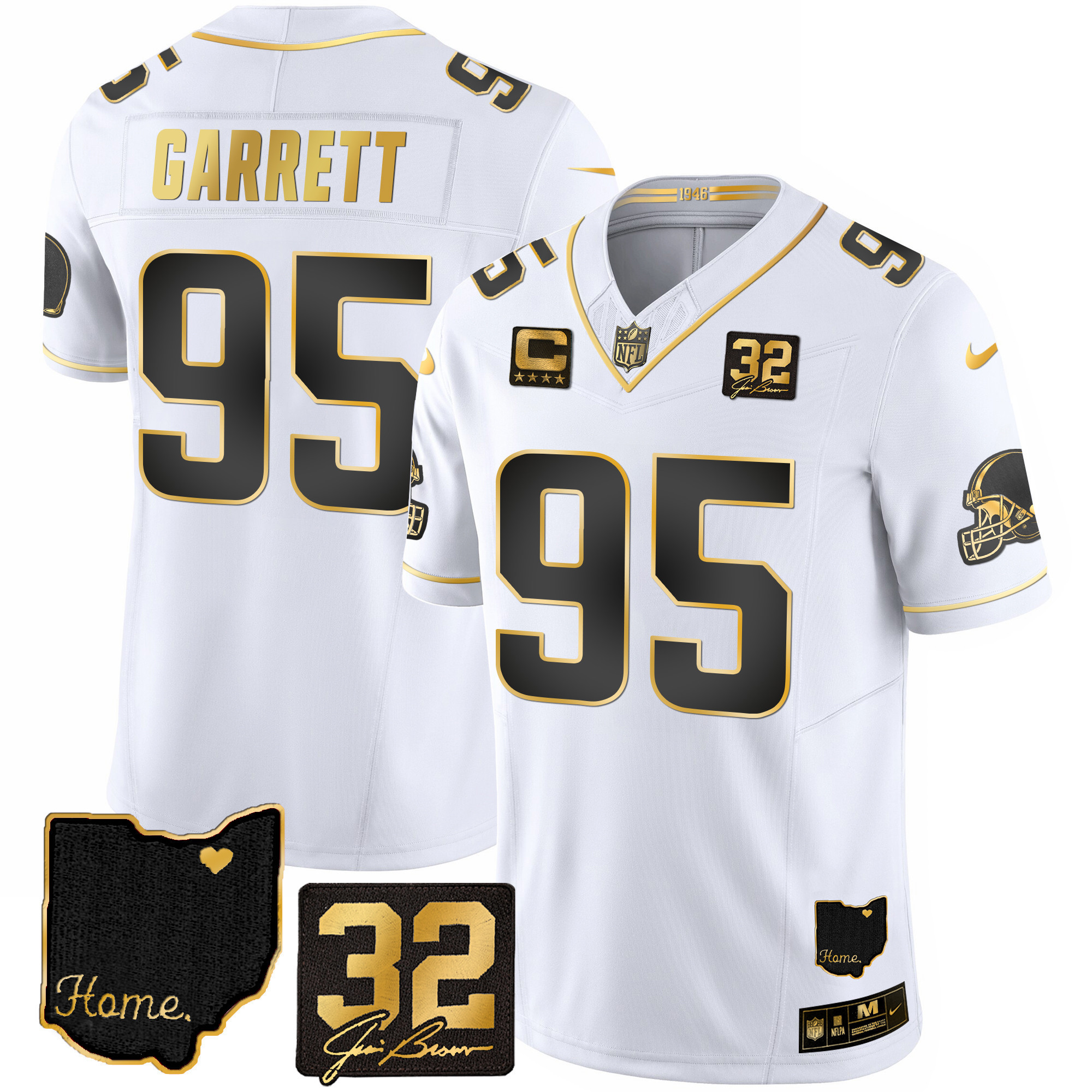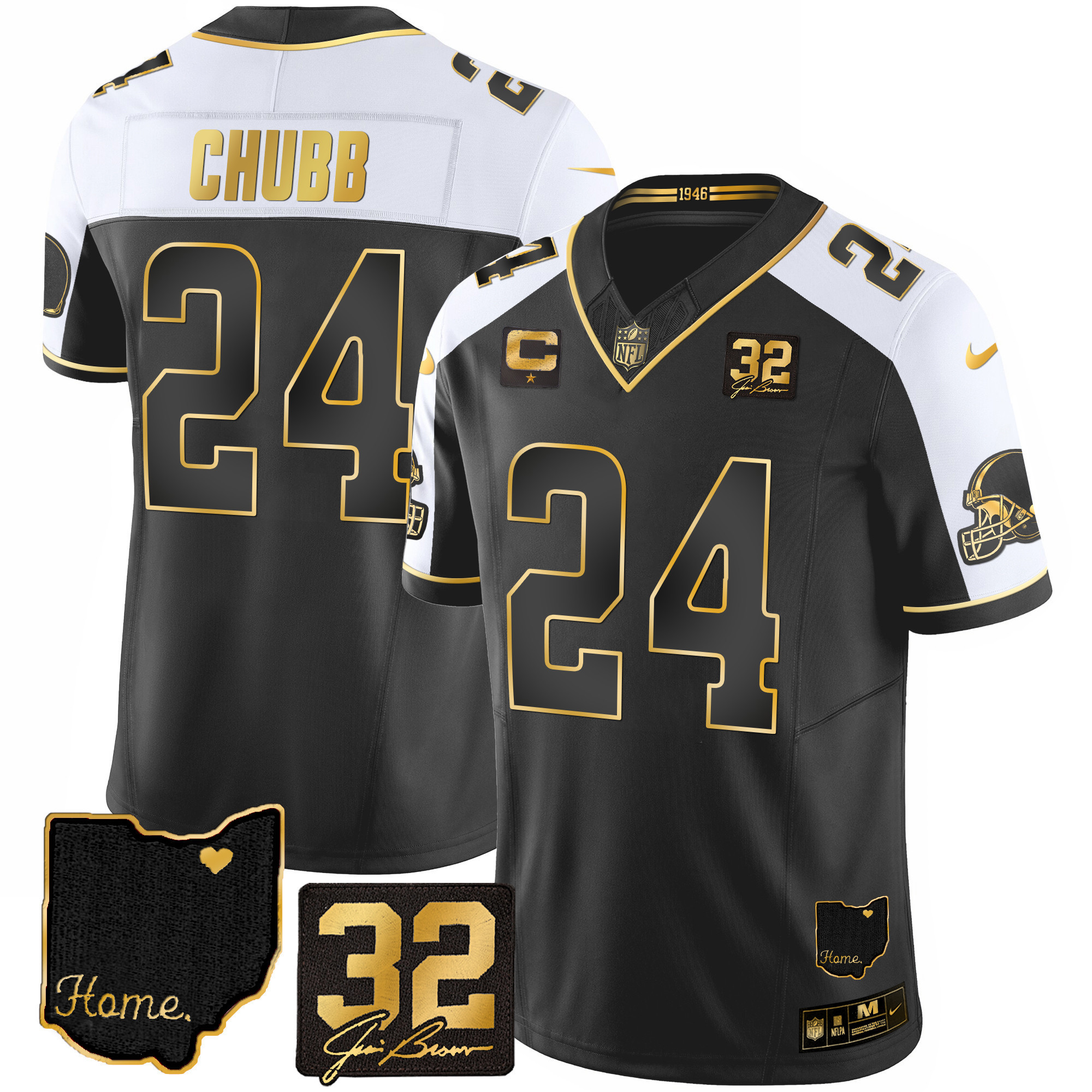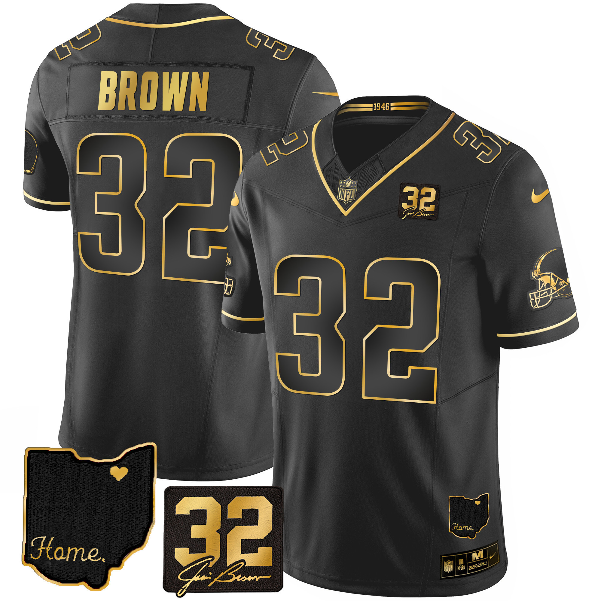 Men’s Cleveland Browns #32 Jim Brown Memorial & Home Patch Gold Jersey – All Stitched