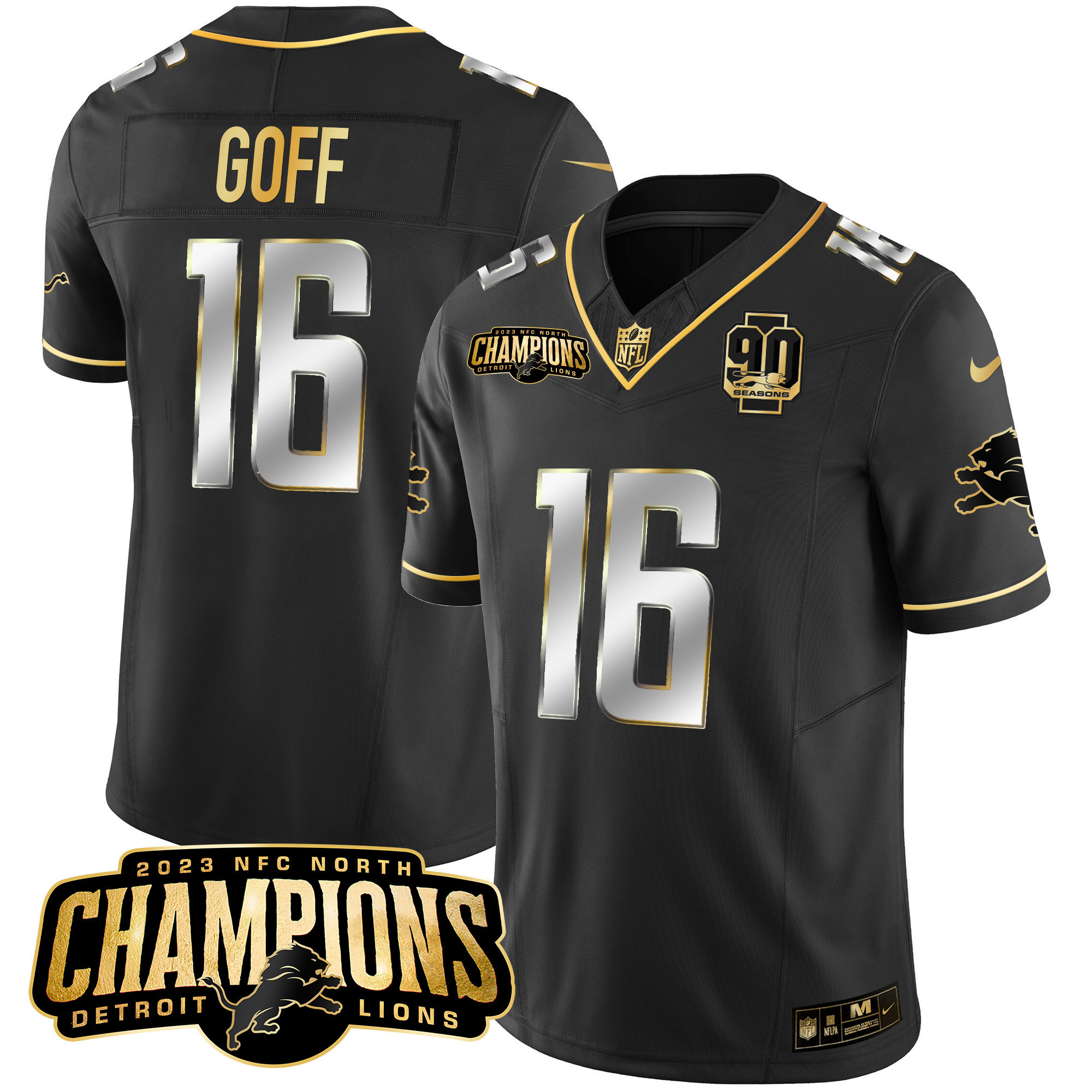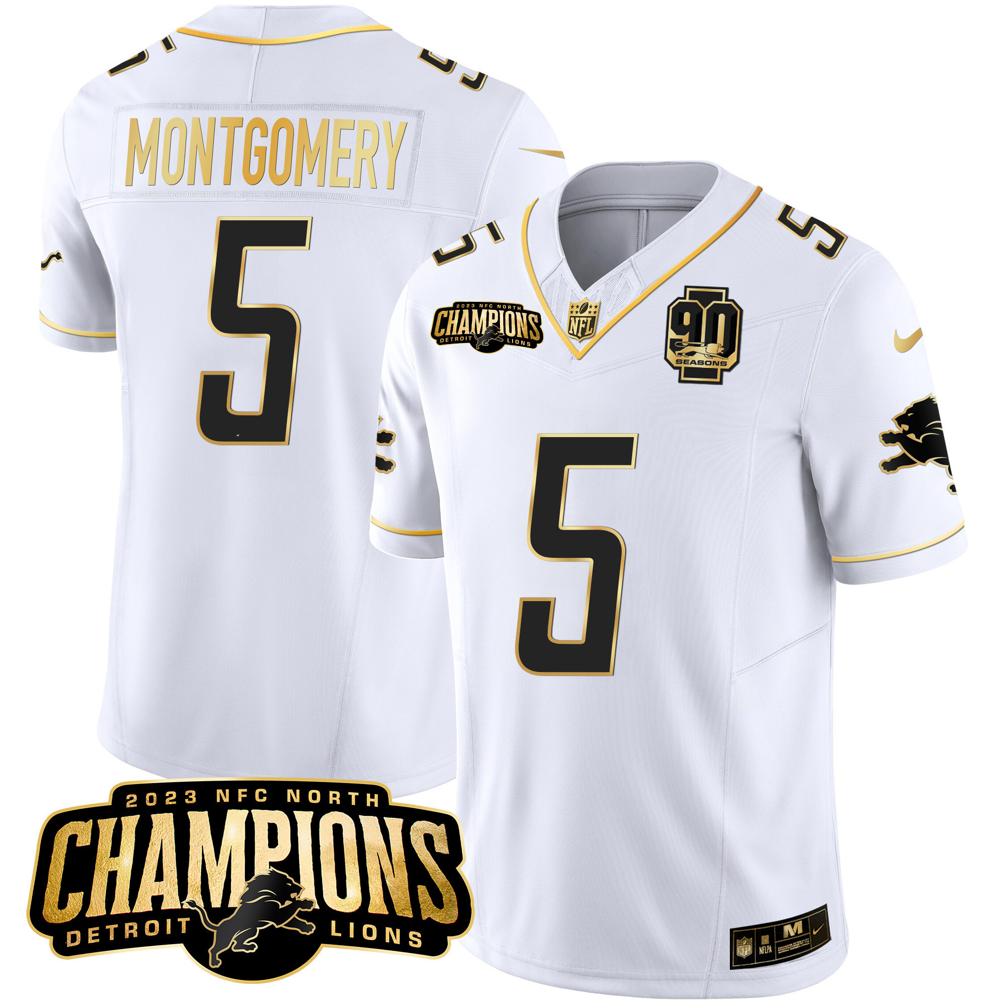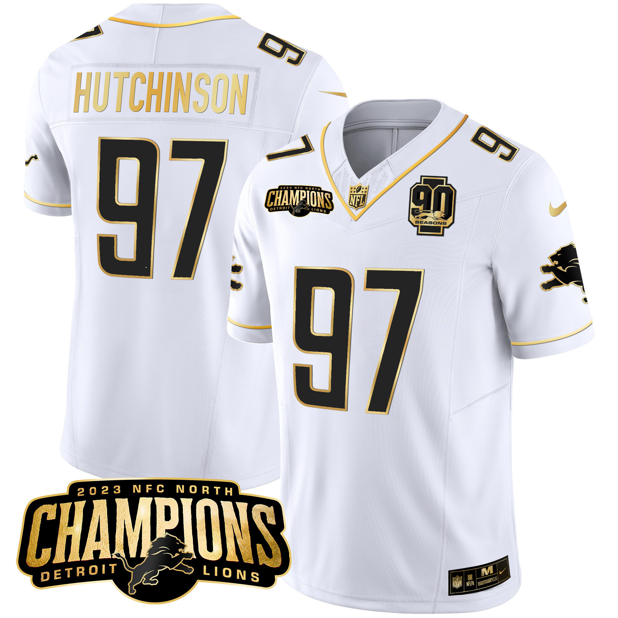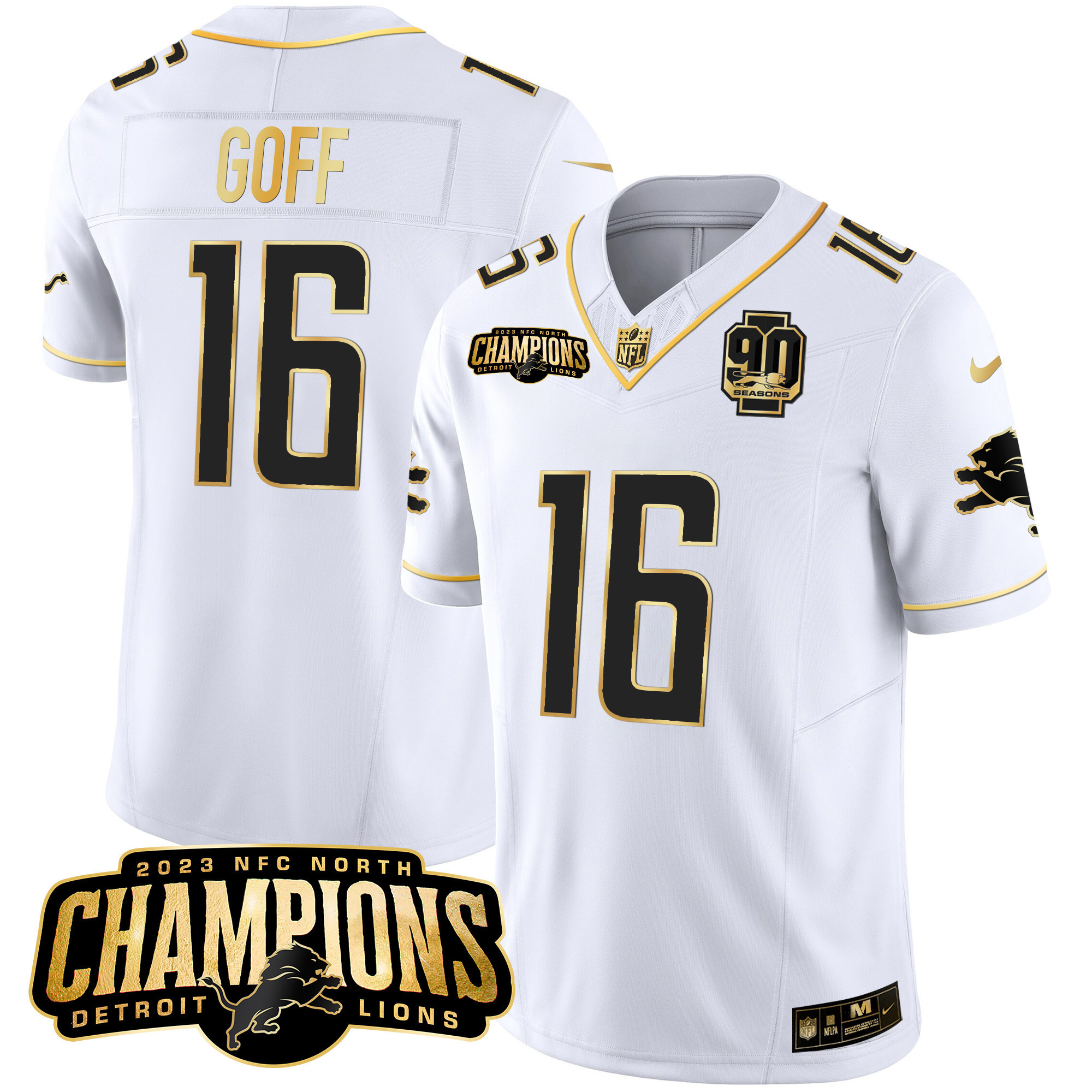 Men’s Detroit Lions 2023 NFC North Champions Patch Gold Vapor Jersey V2 – All Stitched