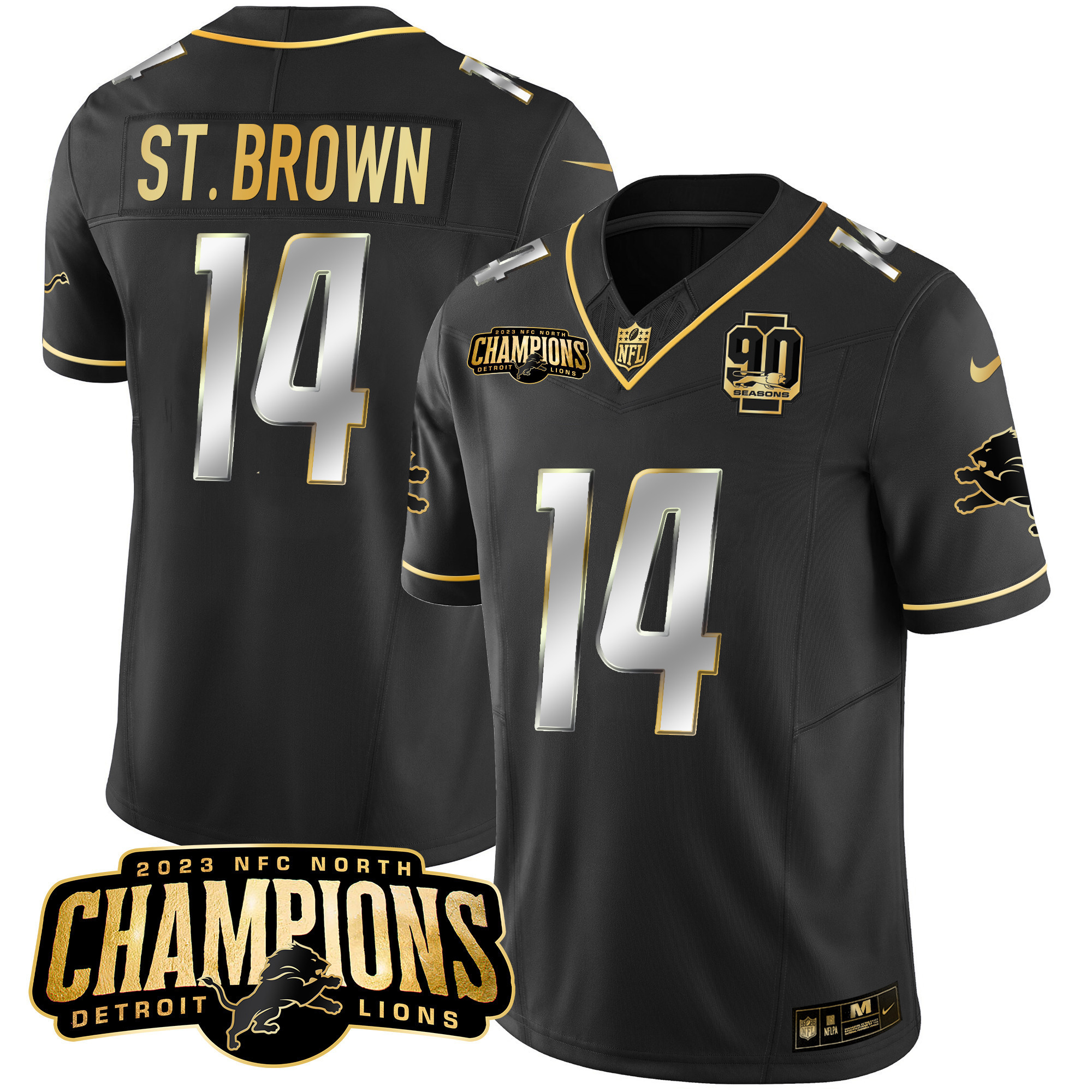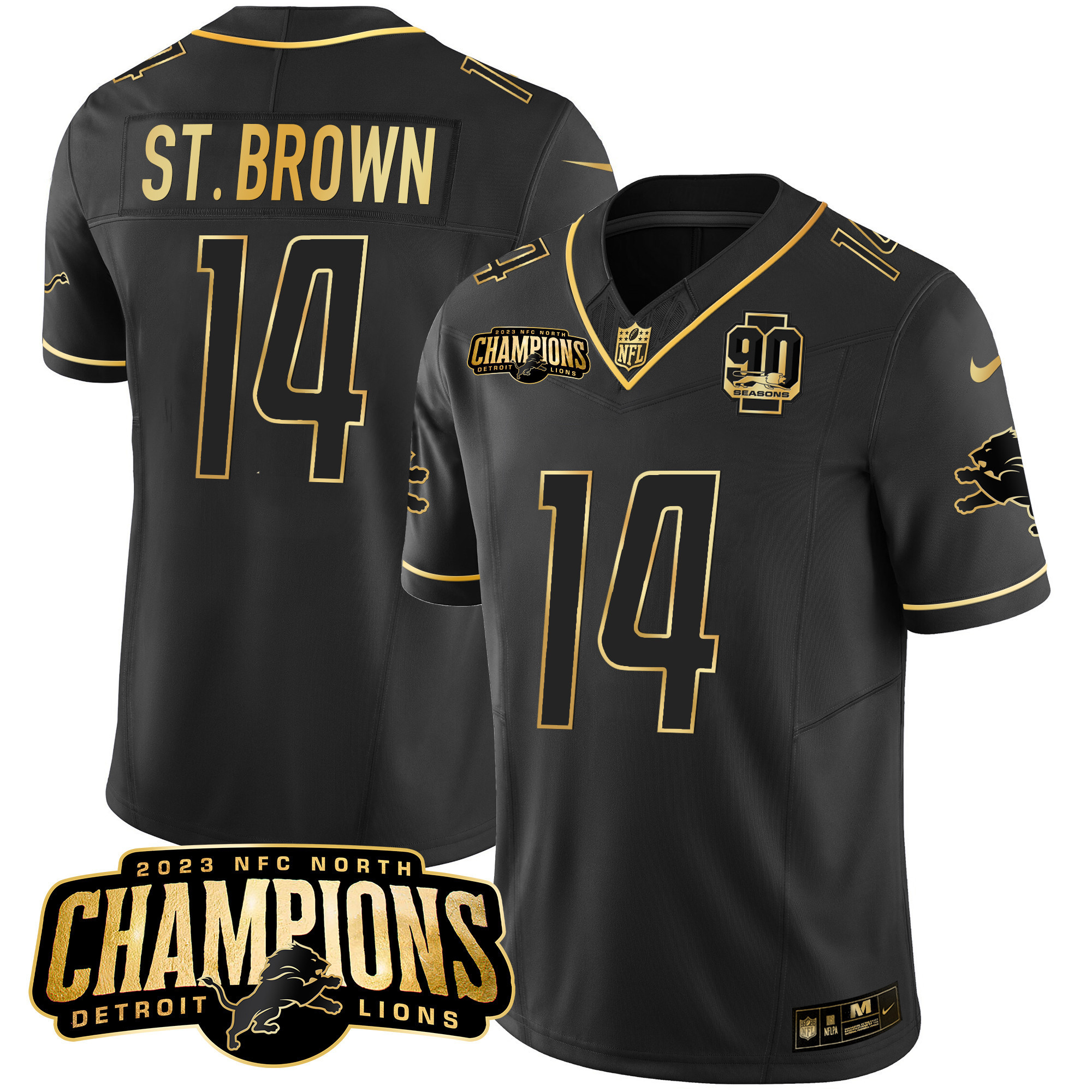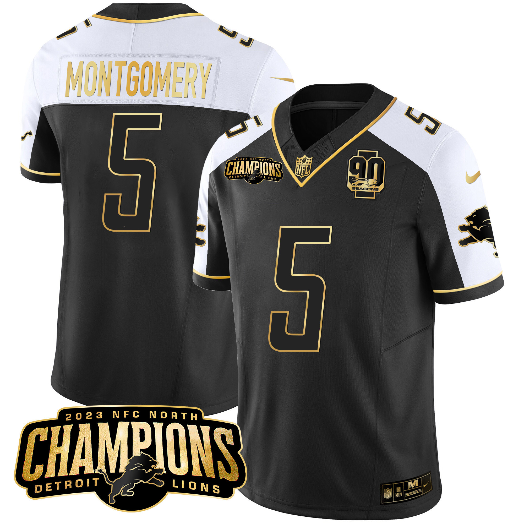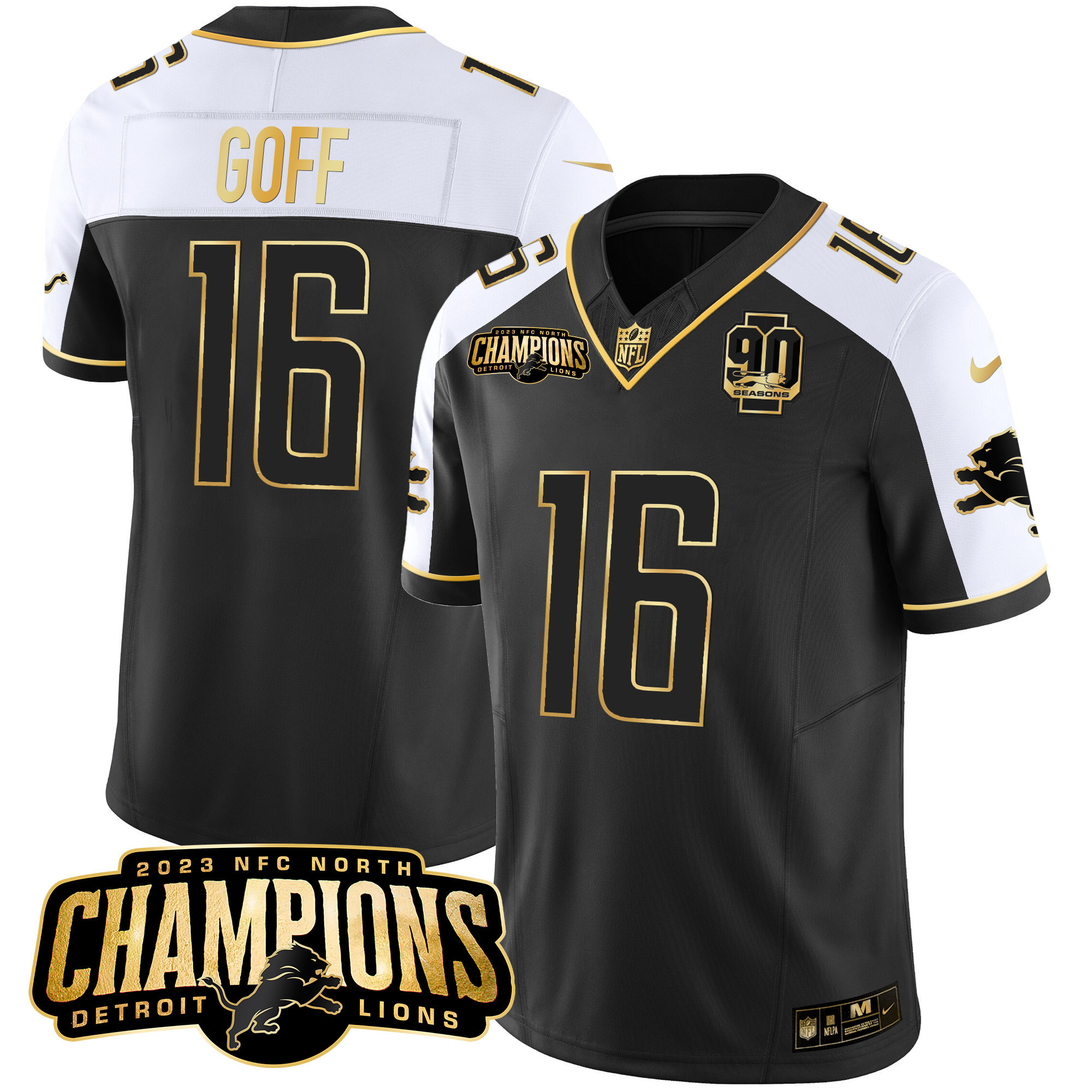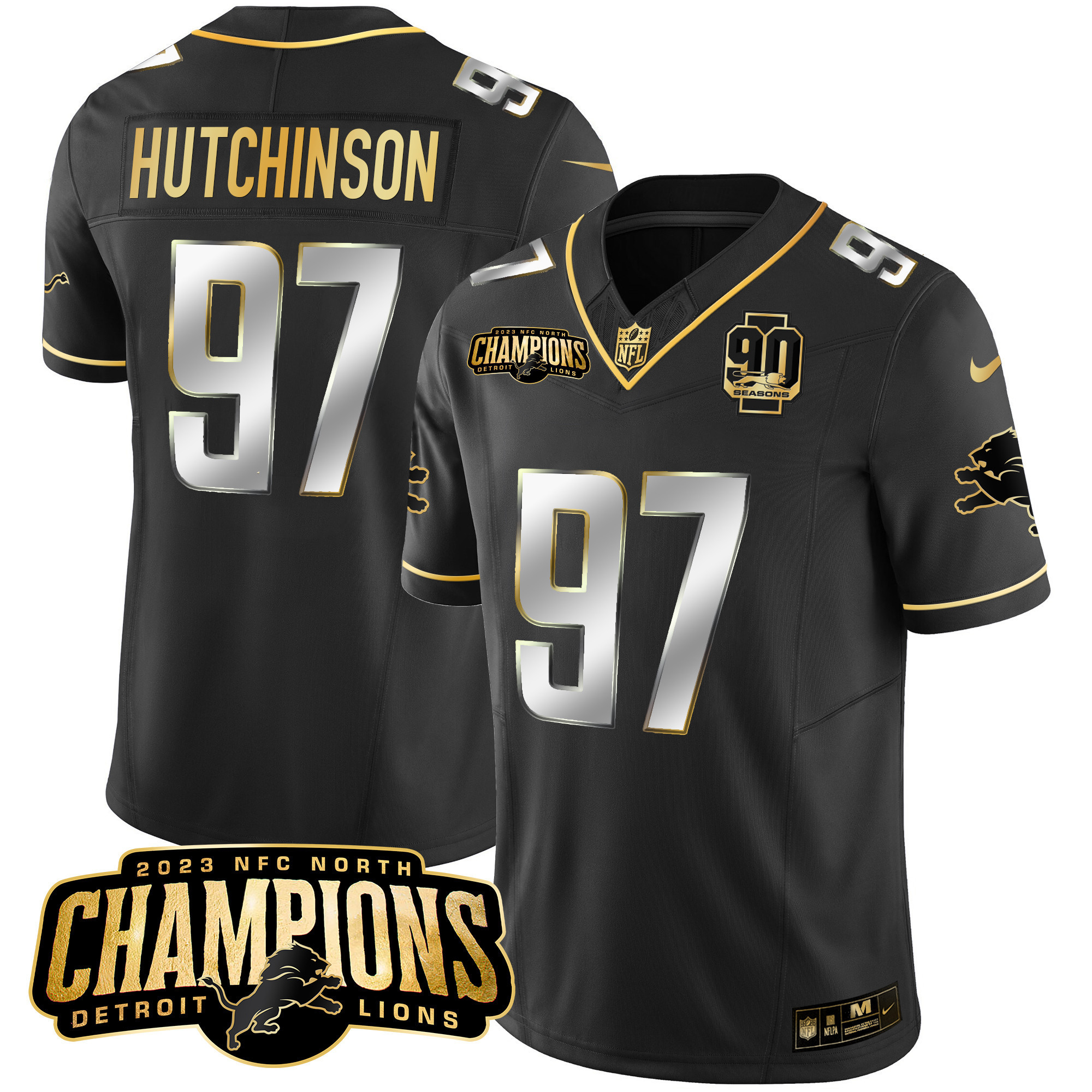Men’s Detroit Lions 2023 NFC North Champions Patch Gold Vapor Jersey V2 – All Stitched
