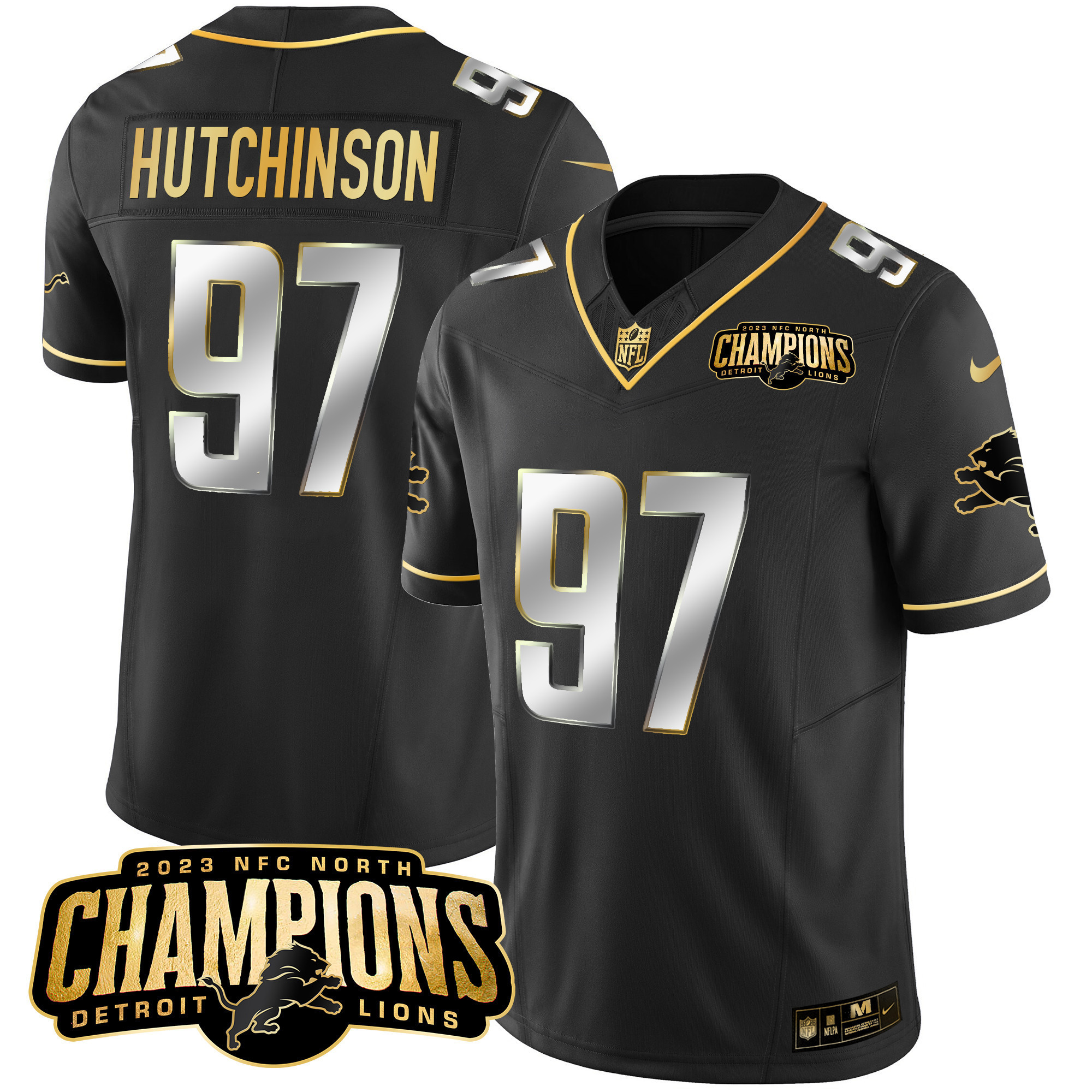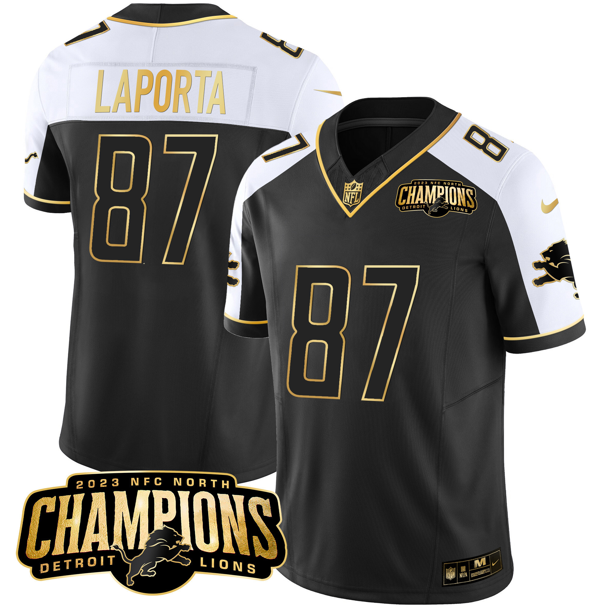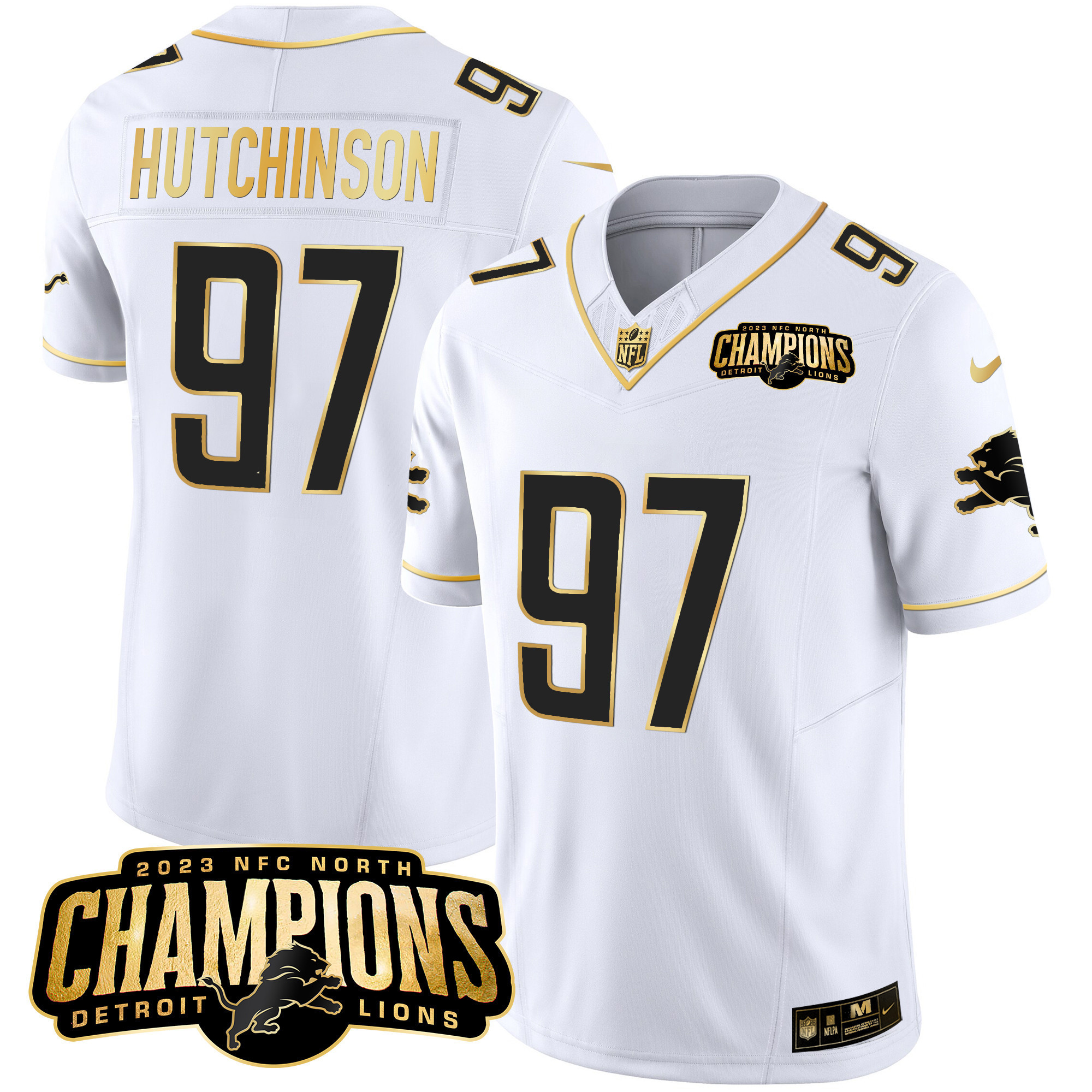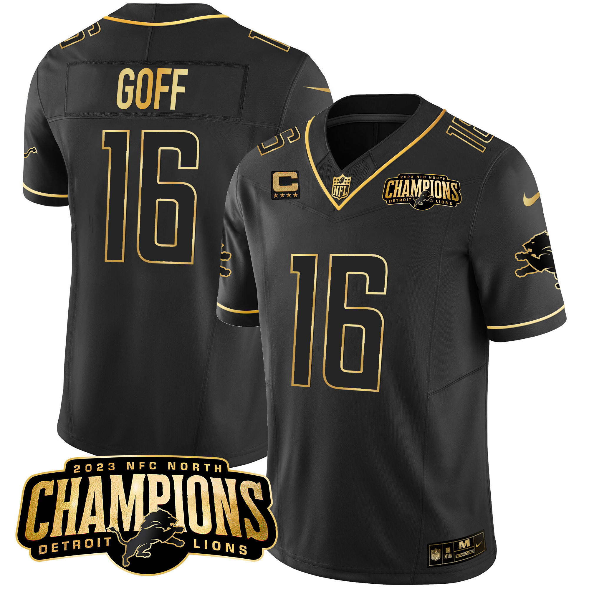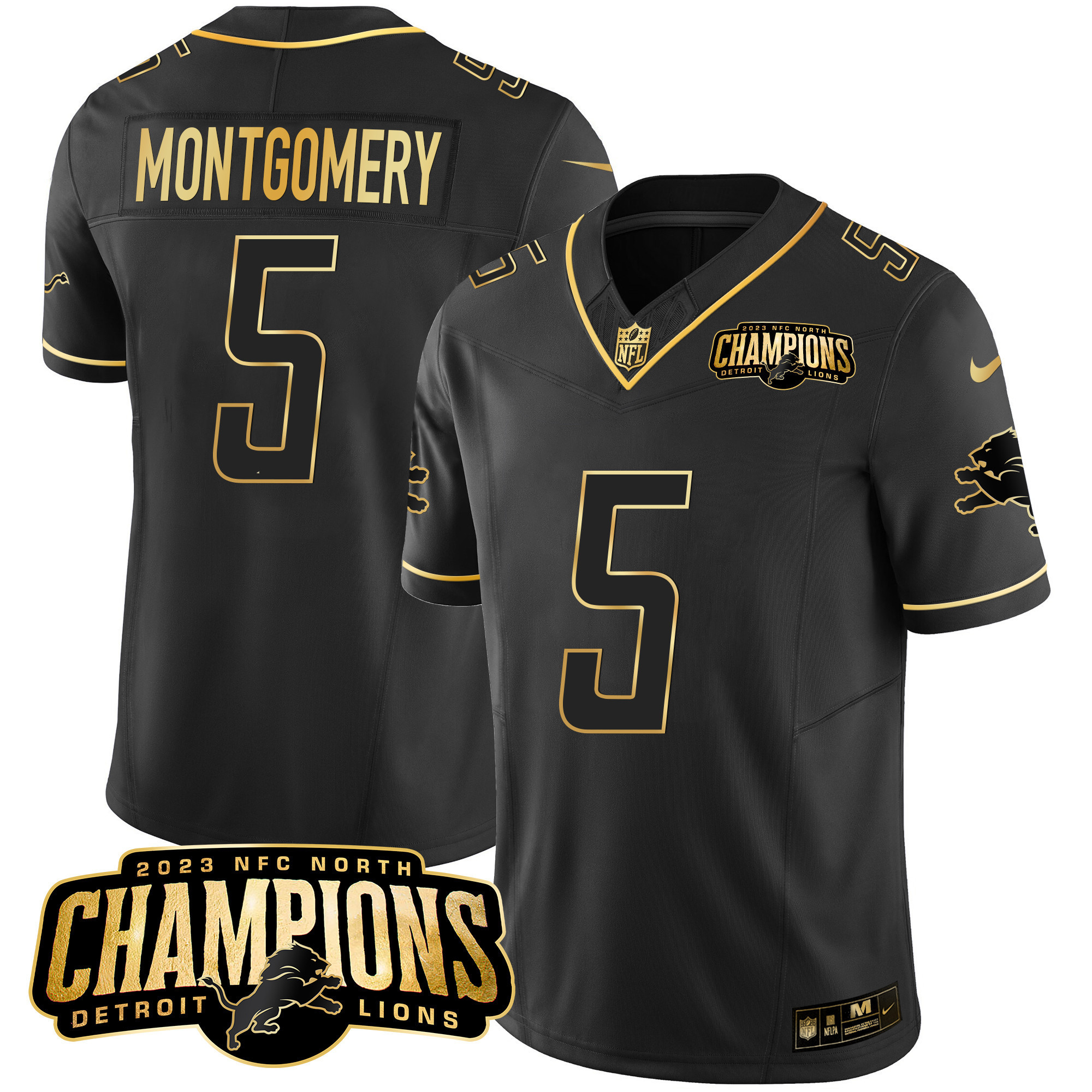 Men’s Detroit Lions 2023 NFC North Champions Patch Gold Vapor Jersey – All Stitched