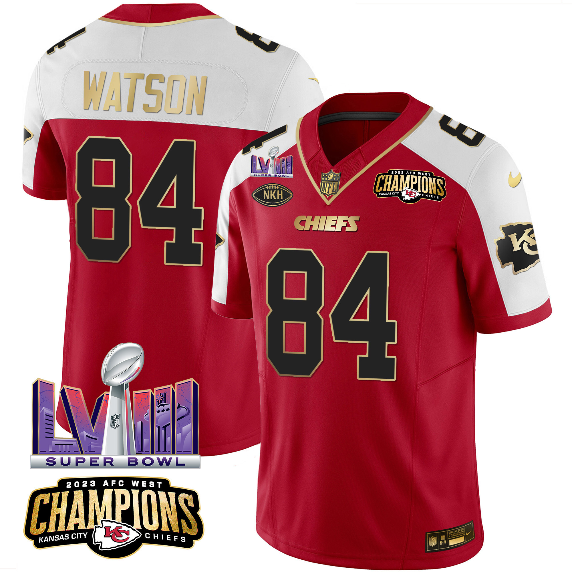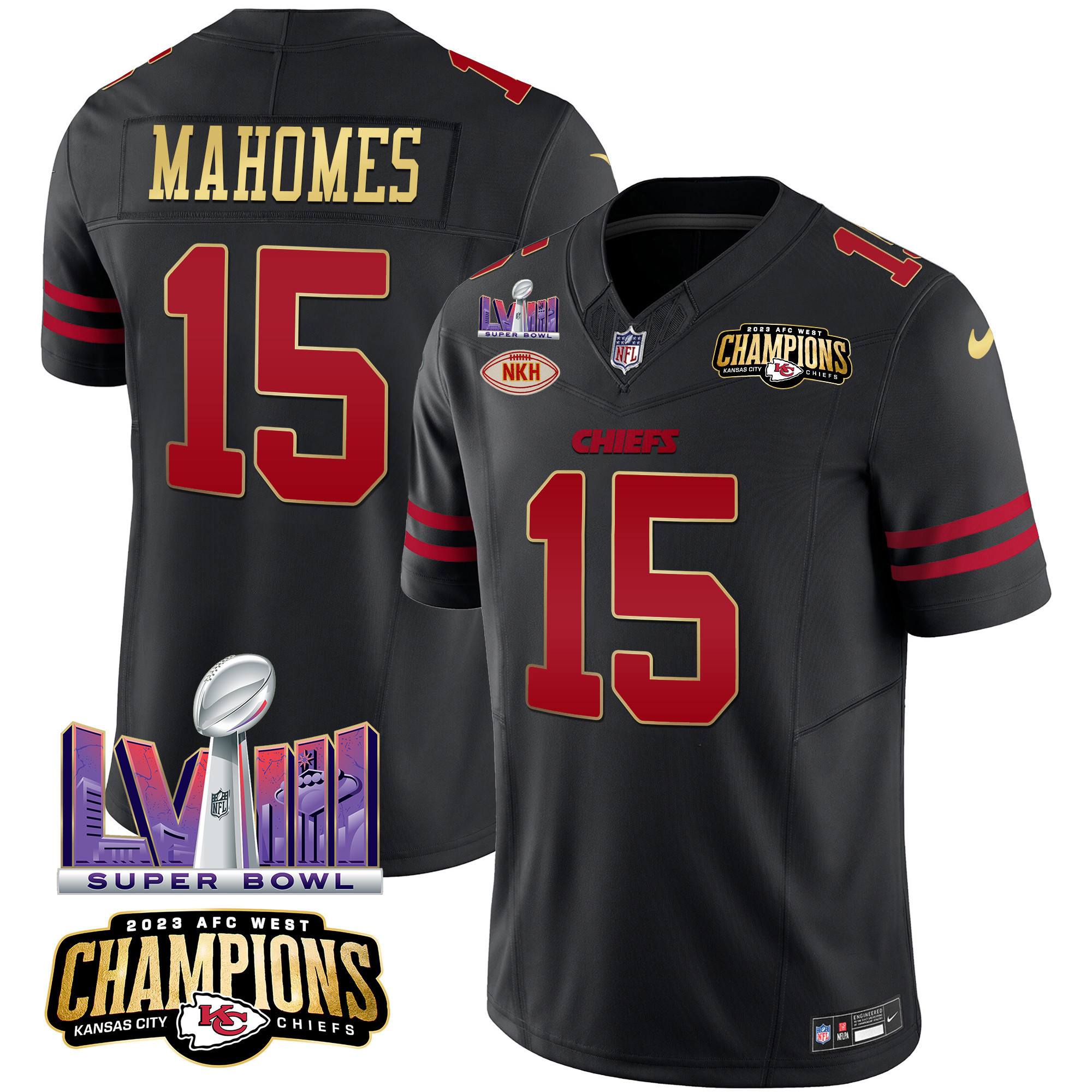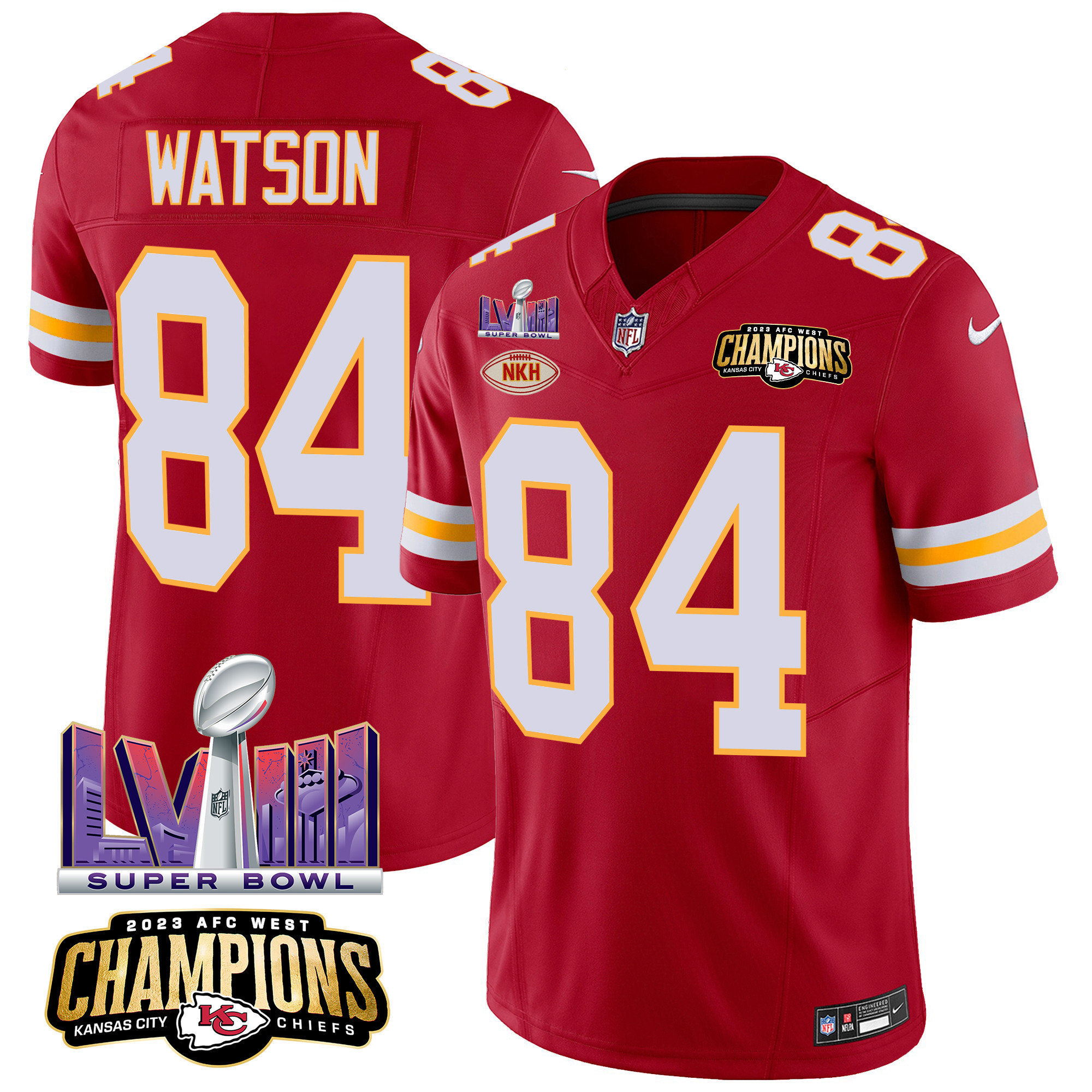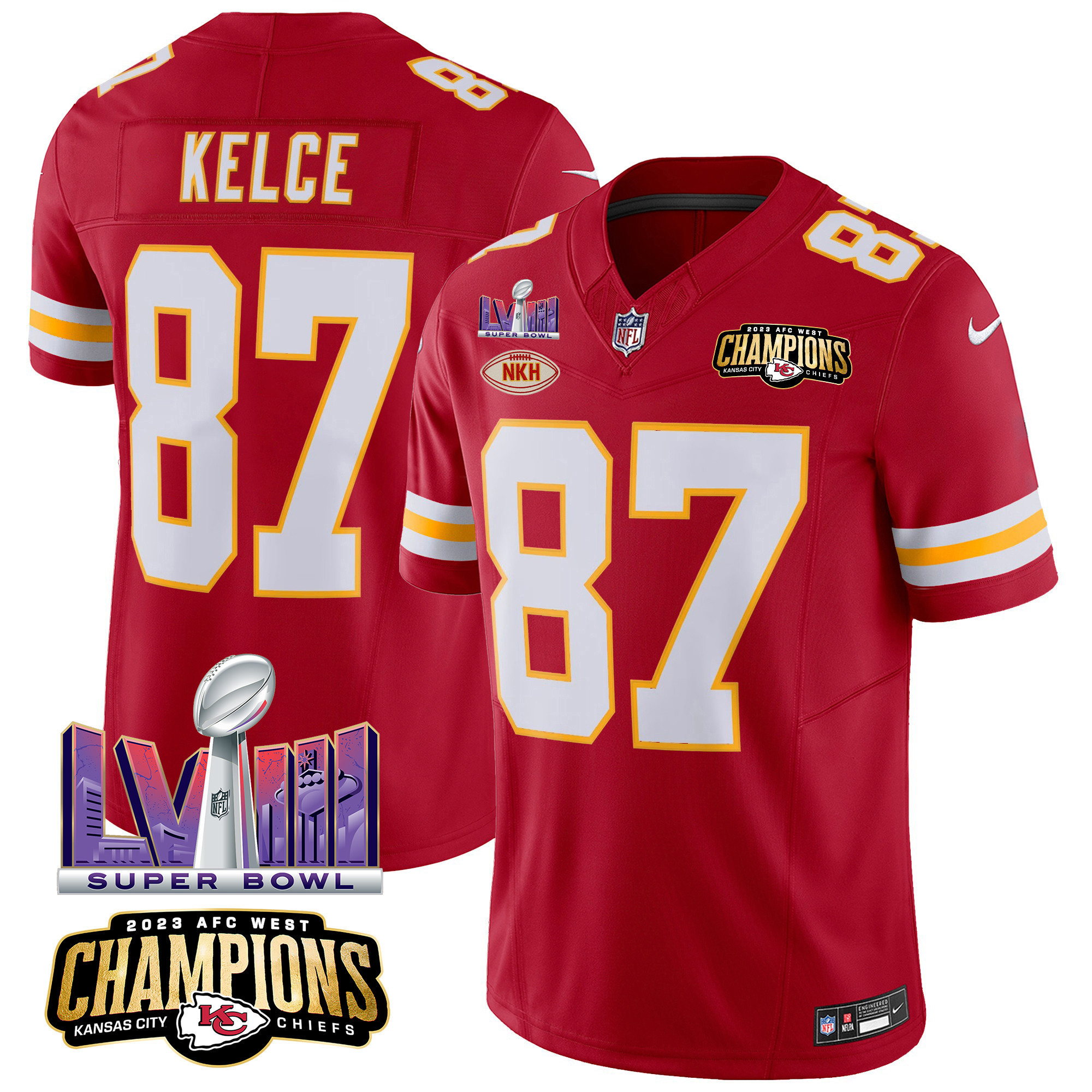 Men’s Kansas City Chiefs AFC West Champions & Super Bowl LVIII Patch Vapor Jersey – All Stitched