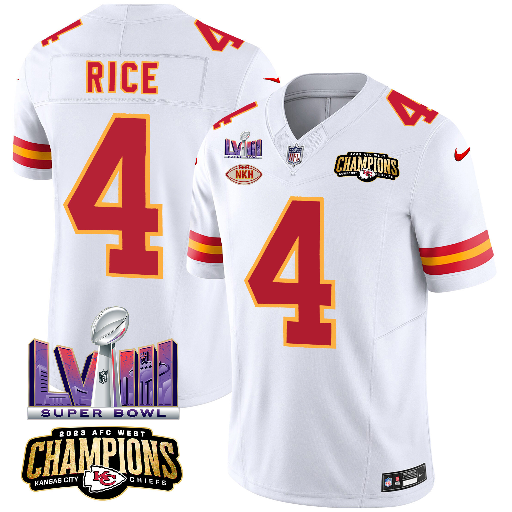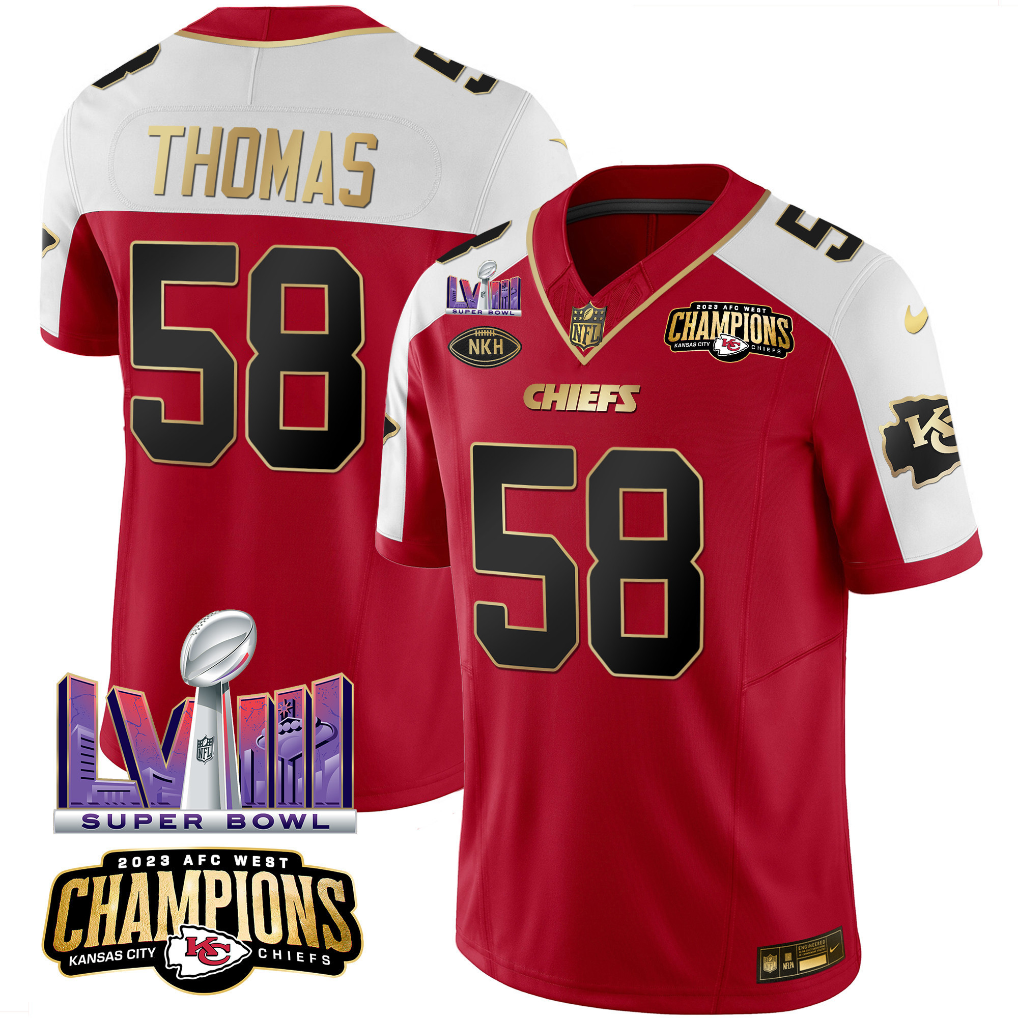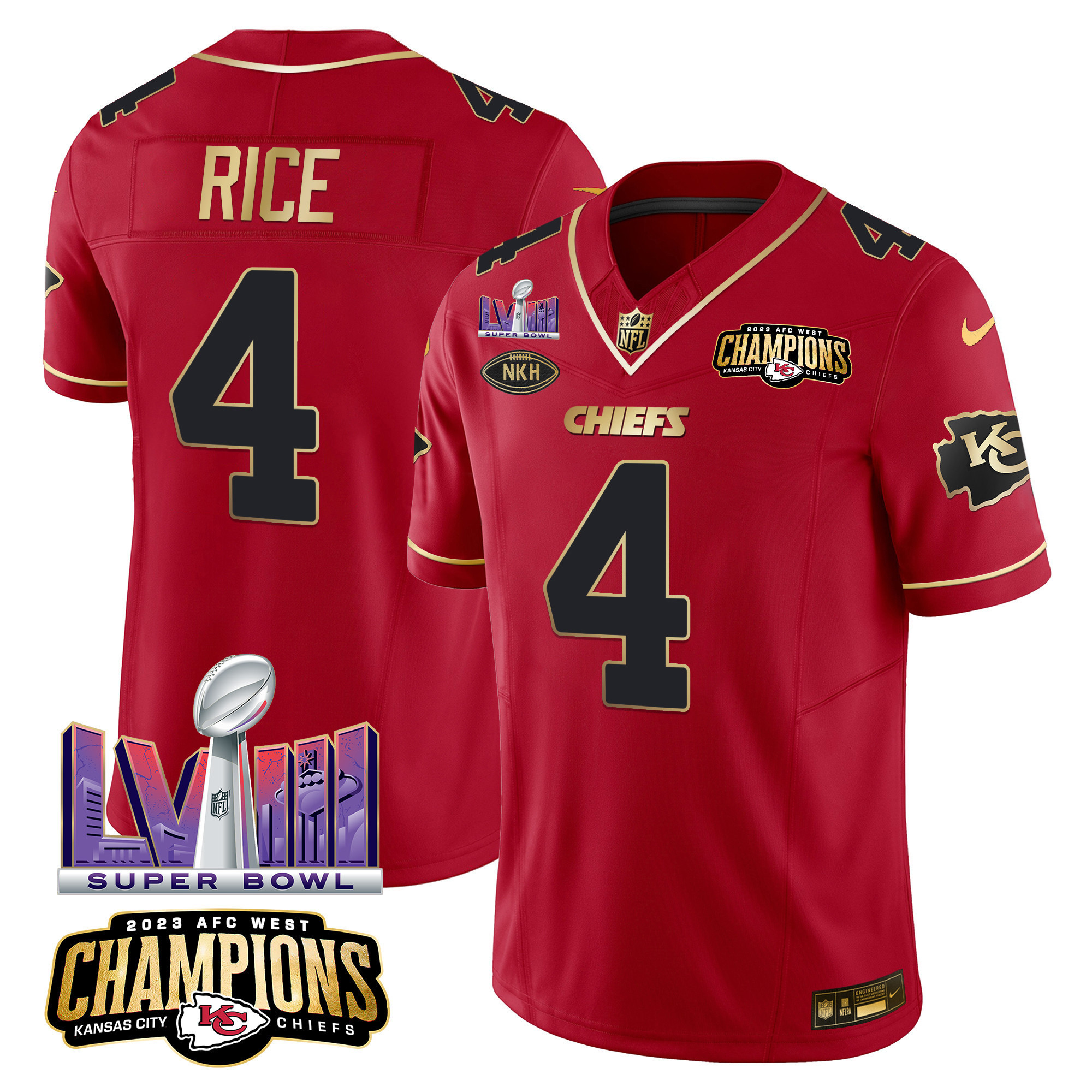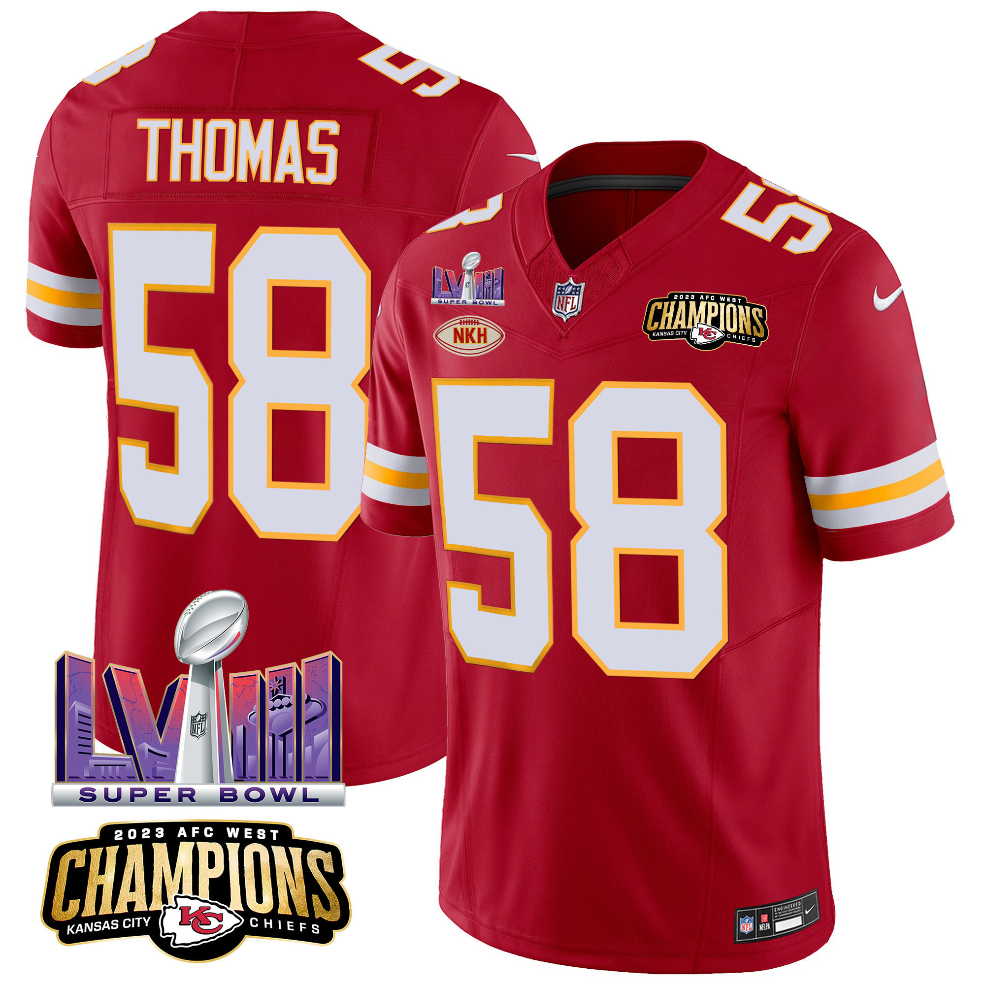 Men’s Kansas City Chiefs AFC West Champions & Super Bowl LVIII Patch Vapor Jersey – All Stitched