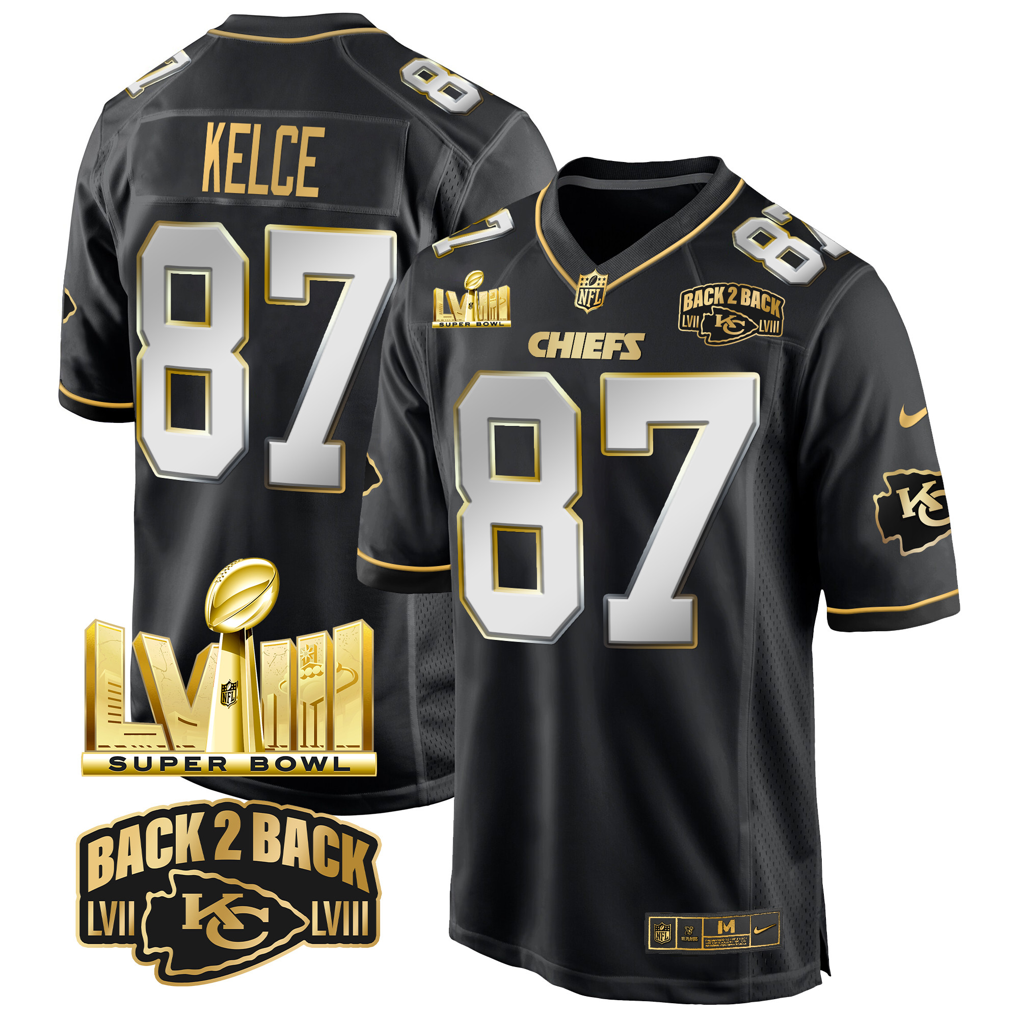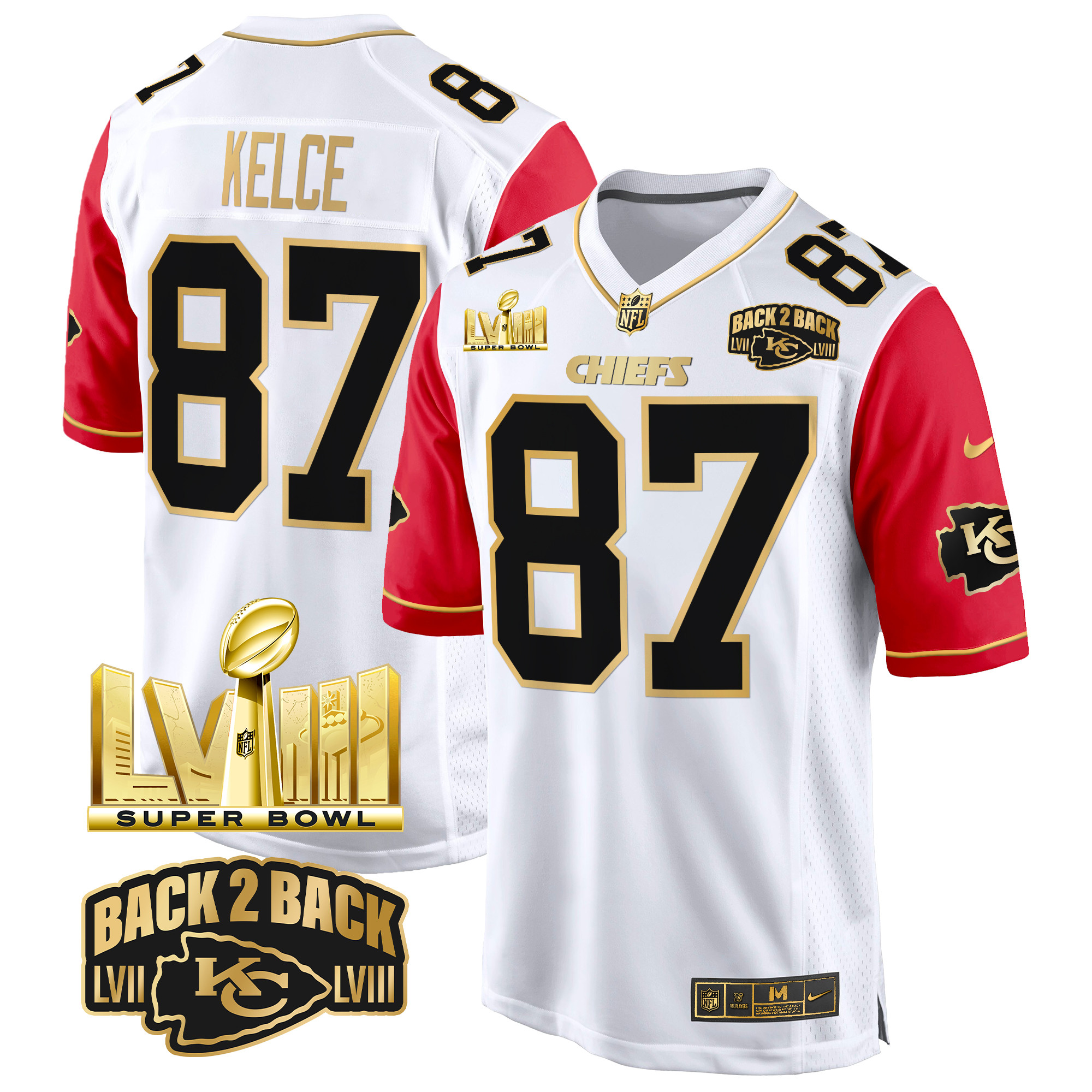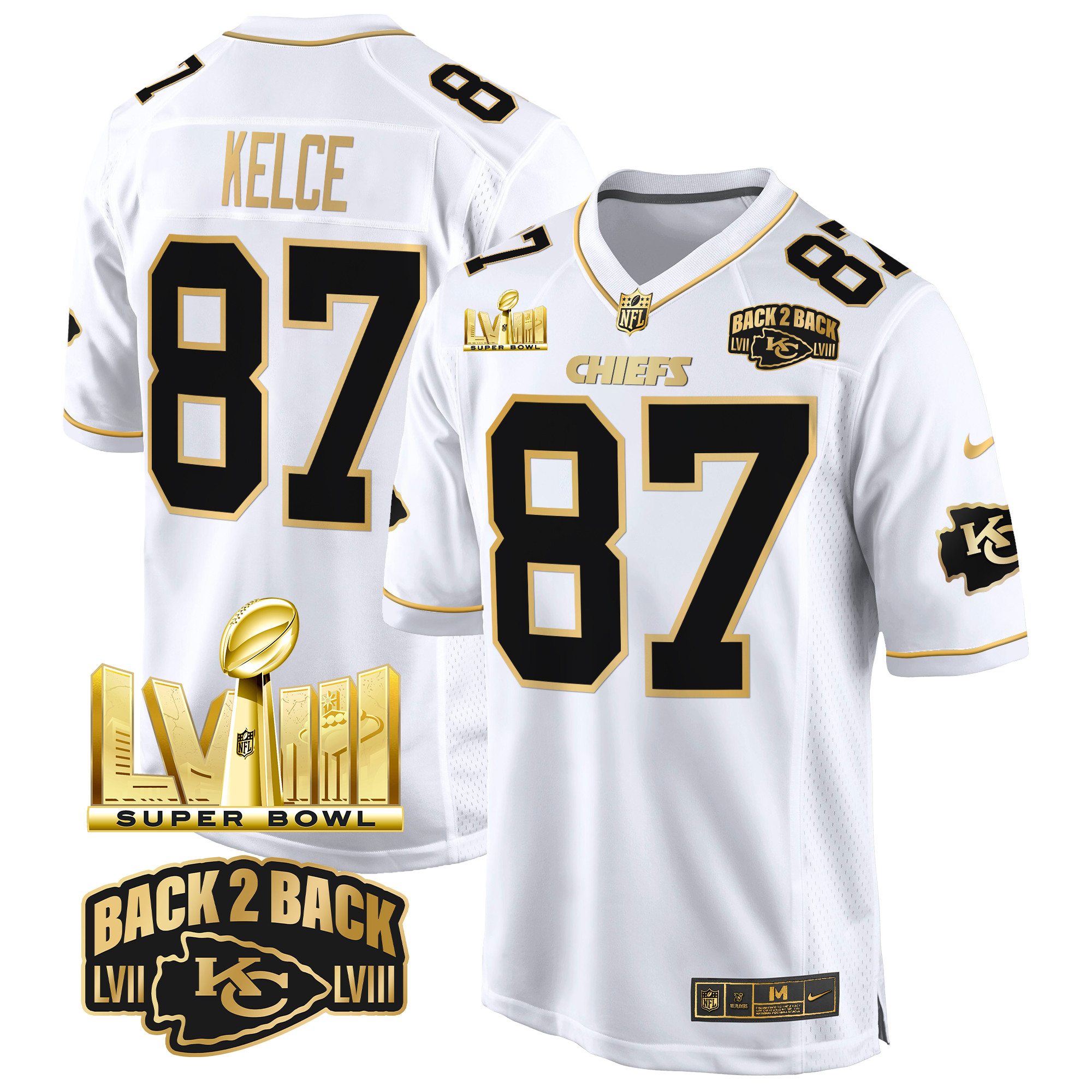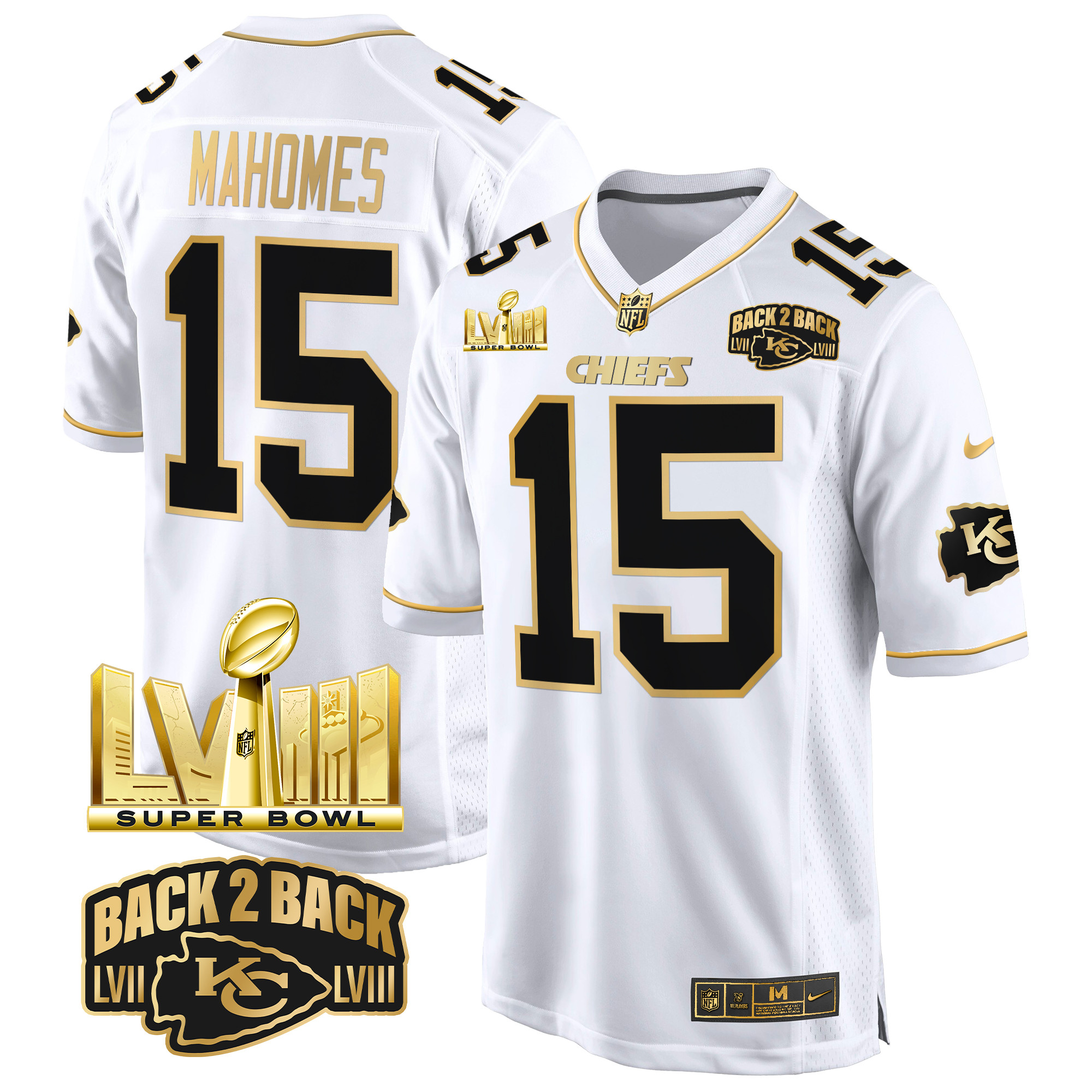 Men’s Kansas City Chiefs Super Bowl LVIII & Back 2 Back Gold Game Jersey – All Stitched