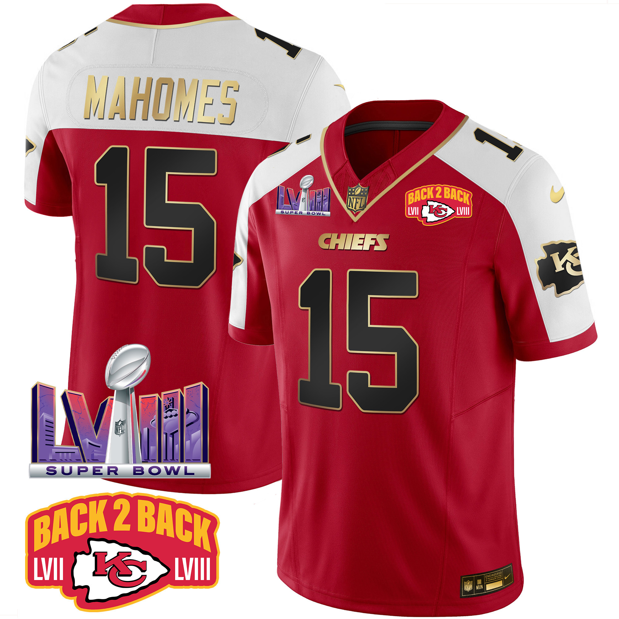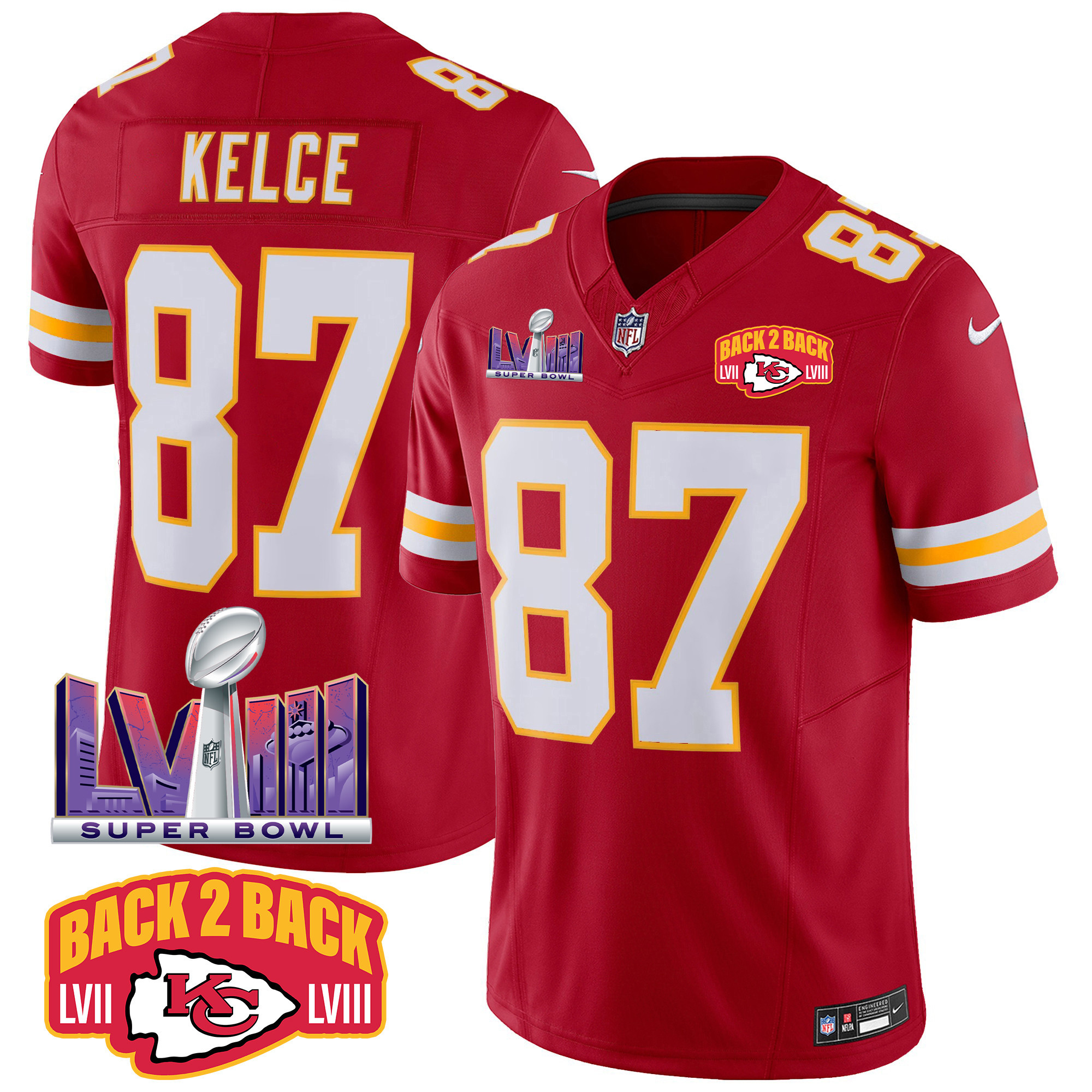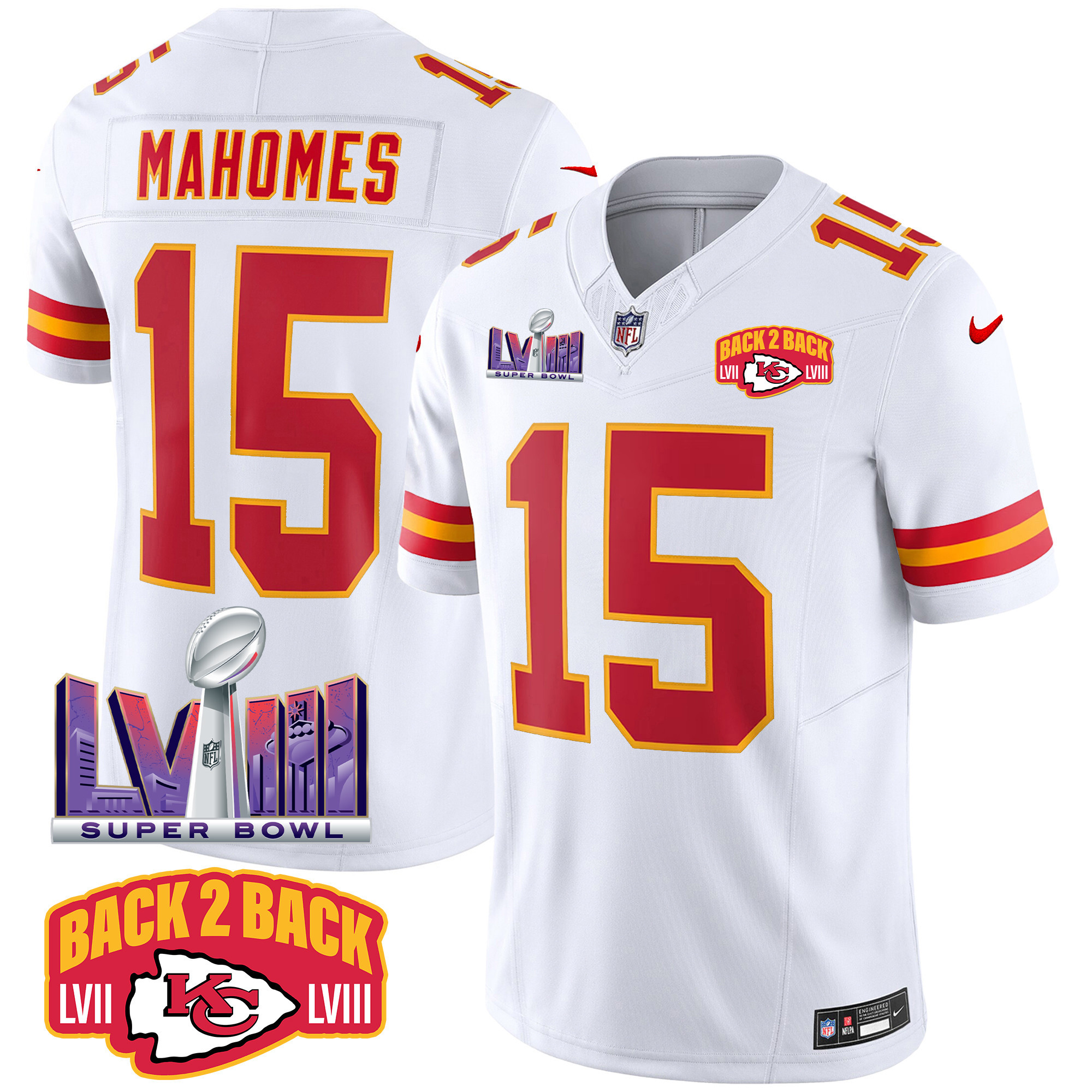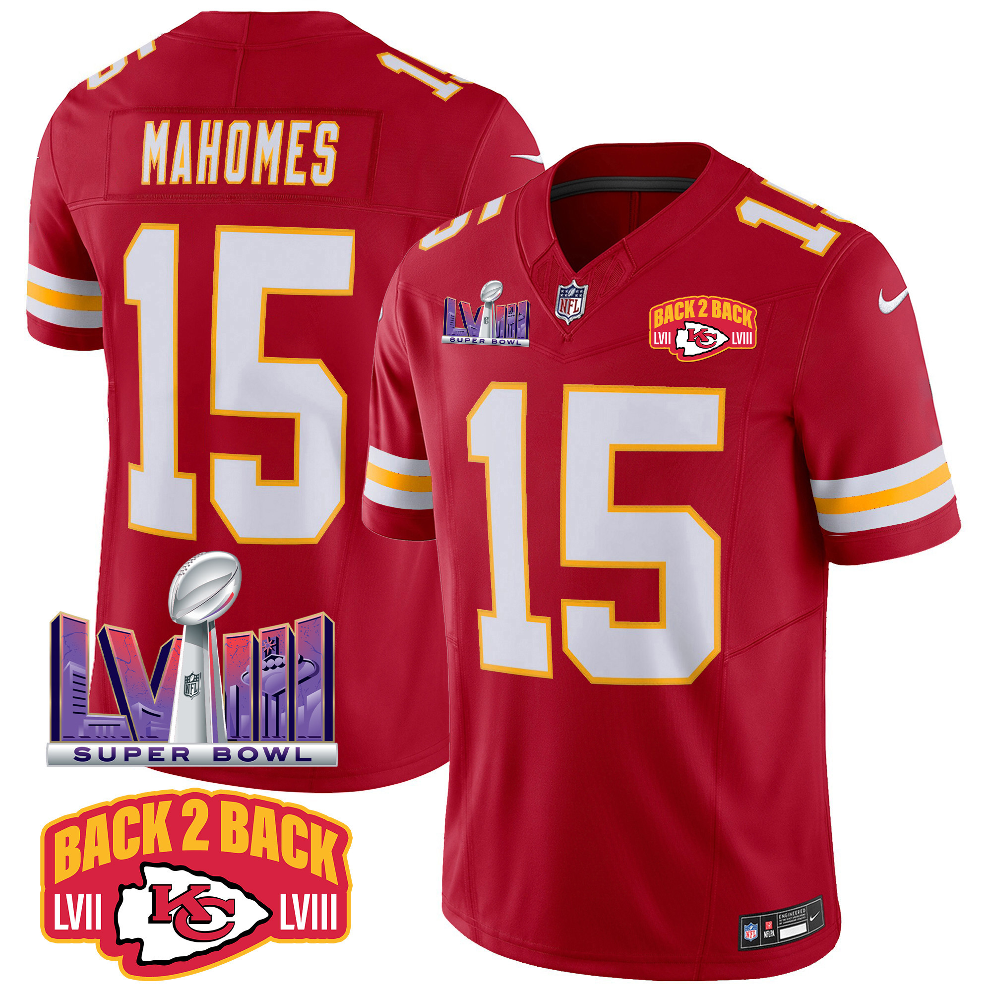 Men’s Kansas City Chiefs Super Bowl LVIII & Back 2 Back Patch Vapor Jersey – All Stitched