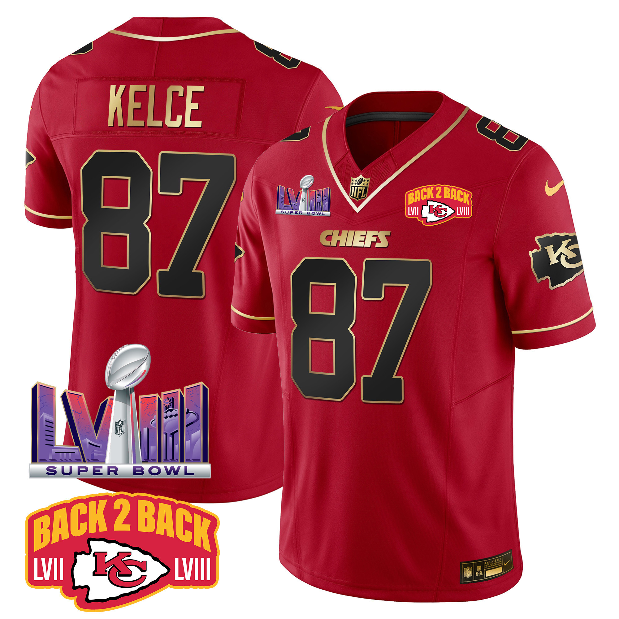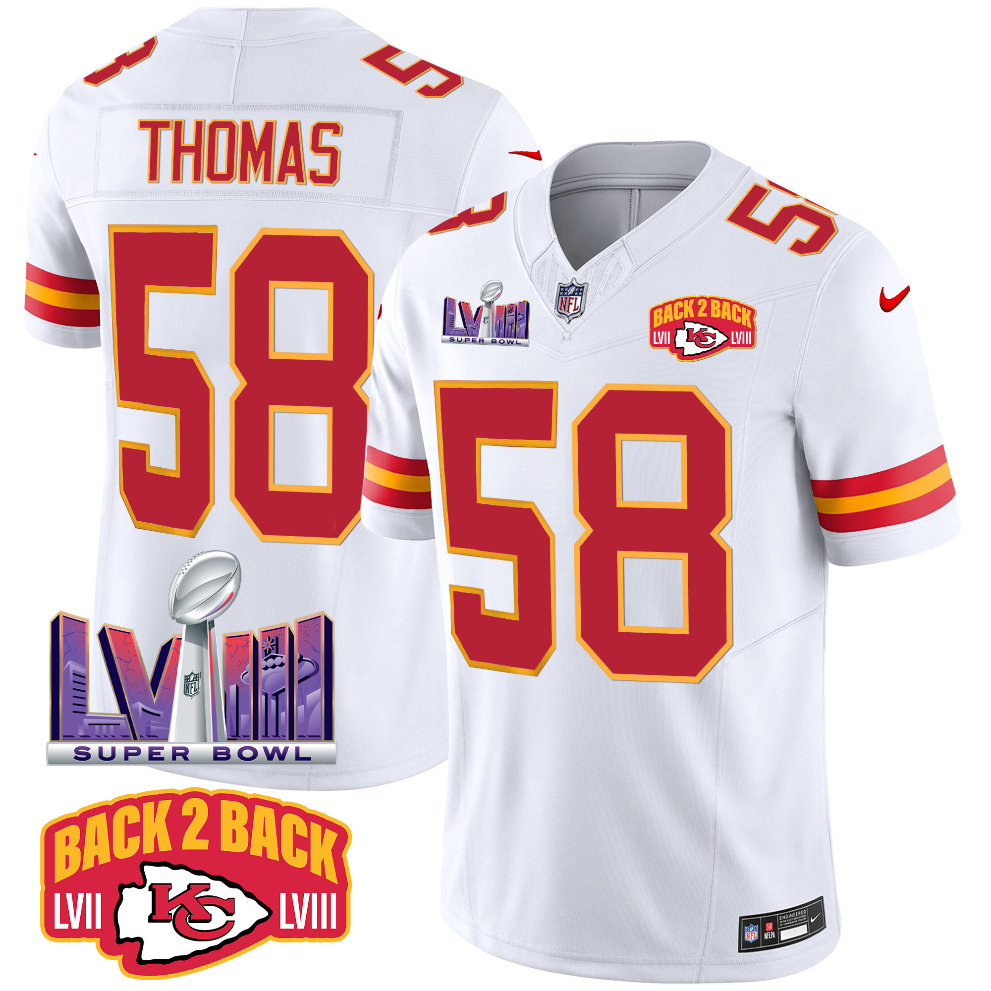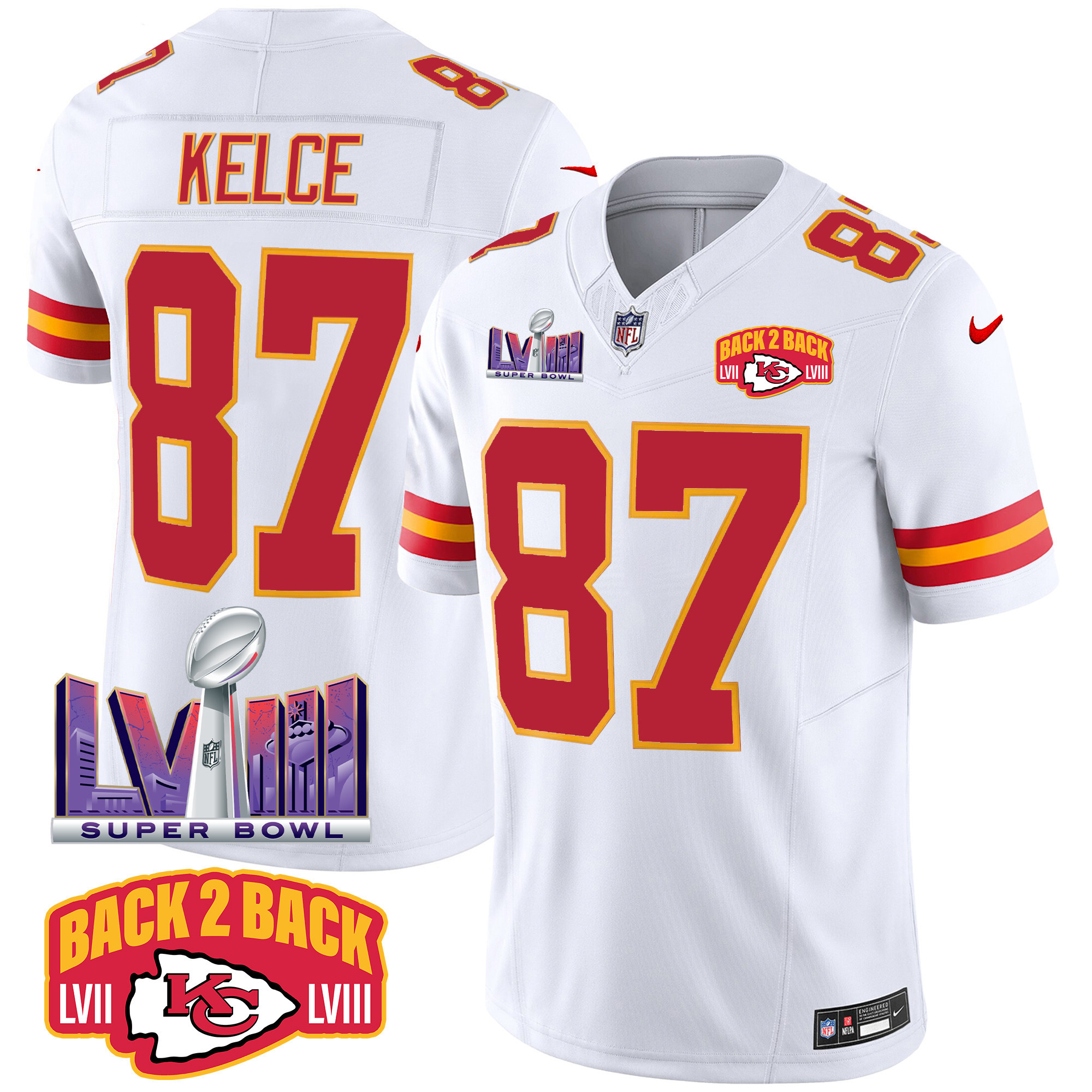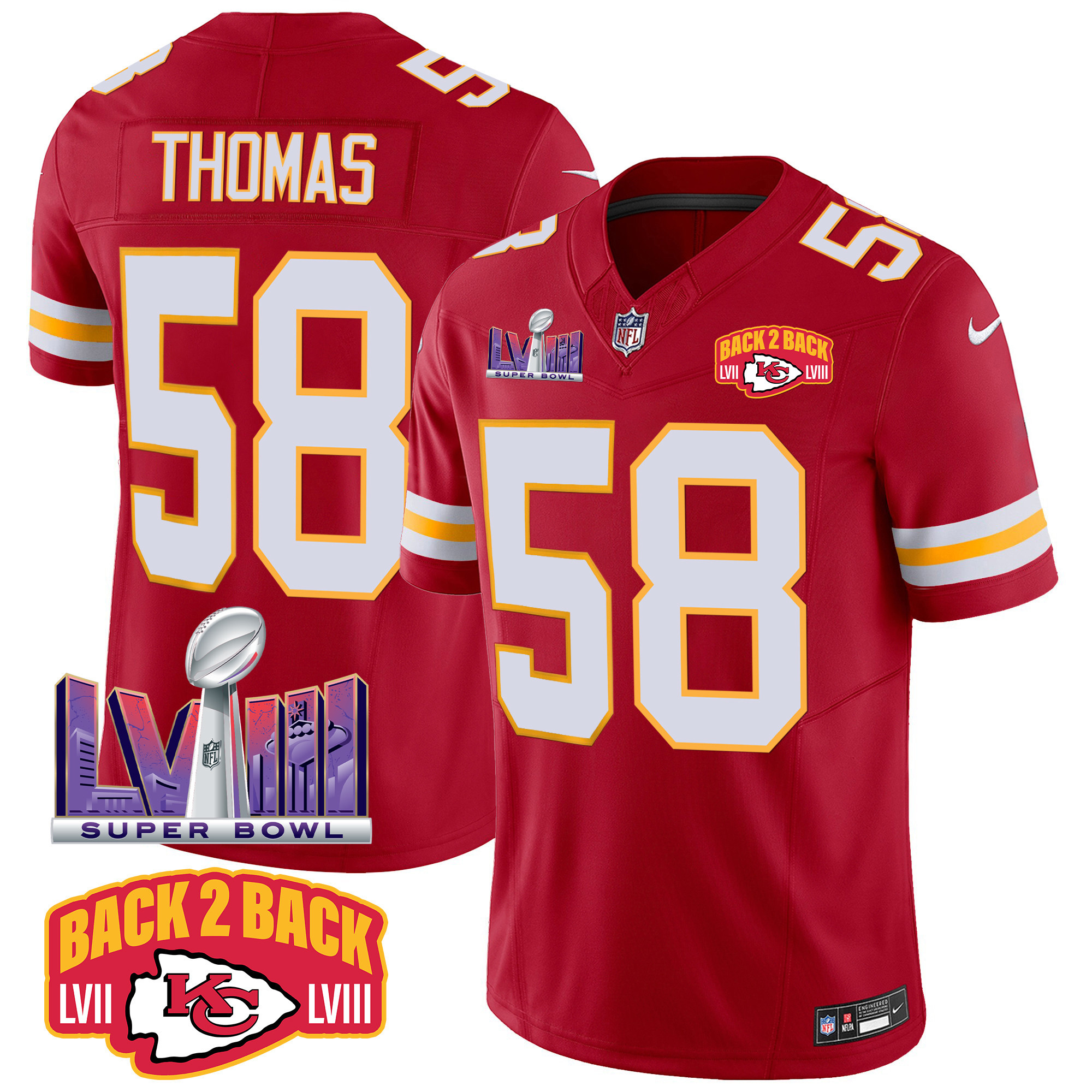 Men’s Kansas City Chiefs Super Bowl LVIII & Back 2 Back Patch Vapor Jersey – All Stitched