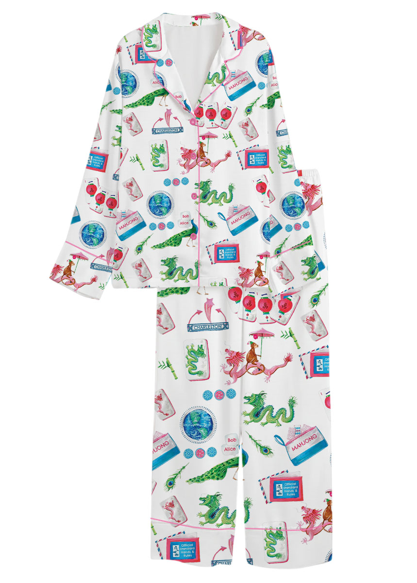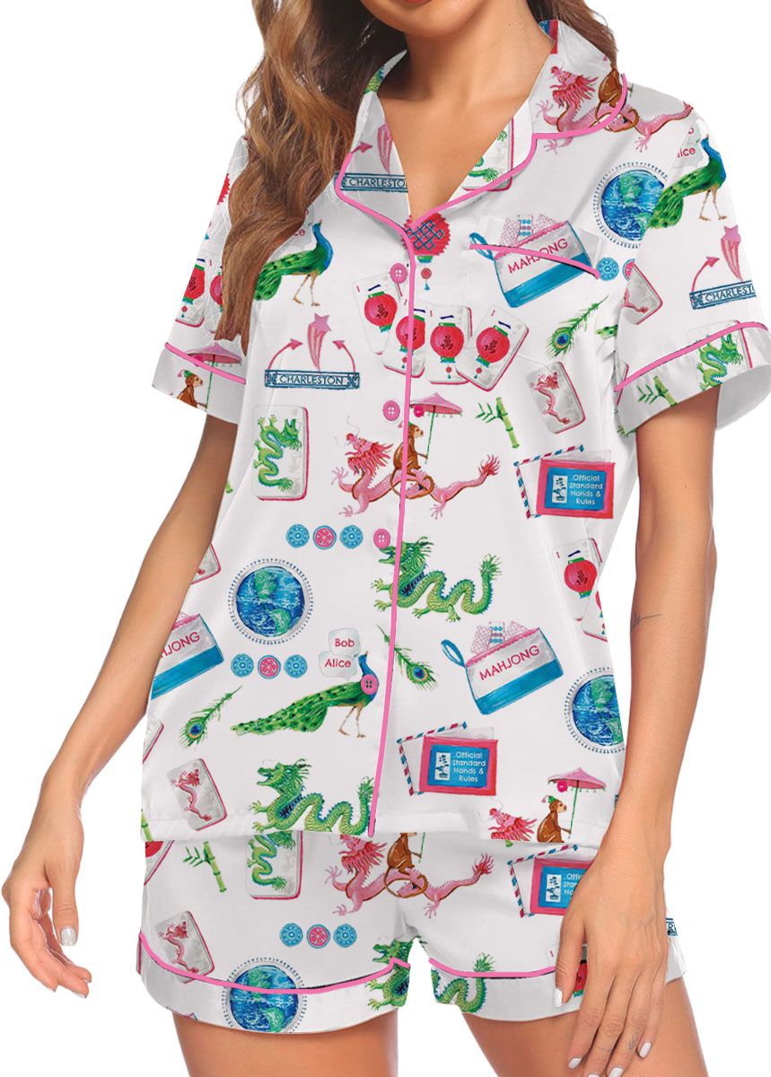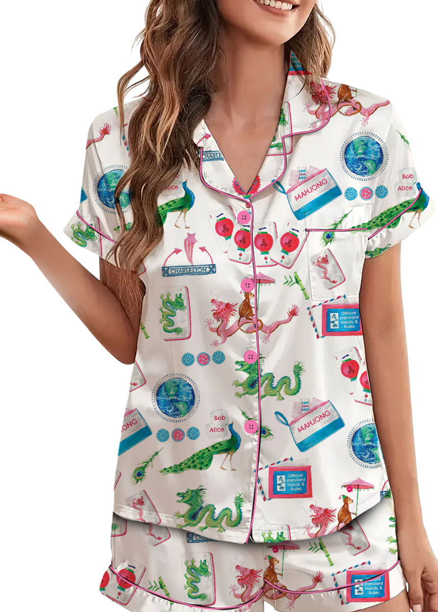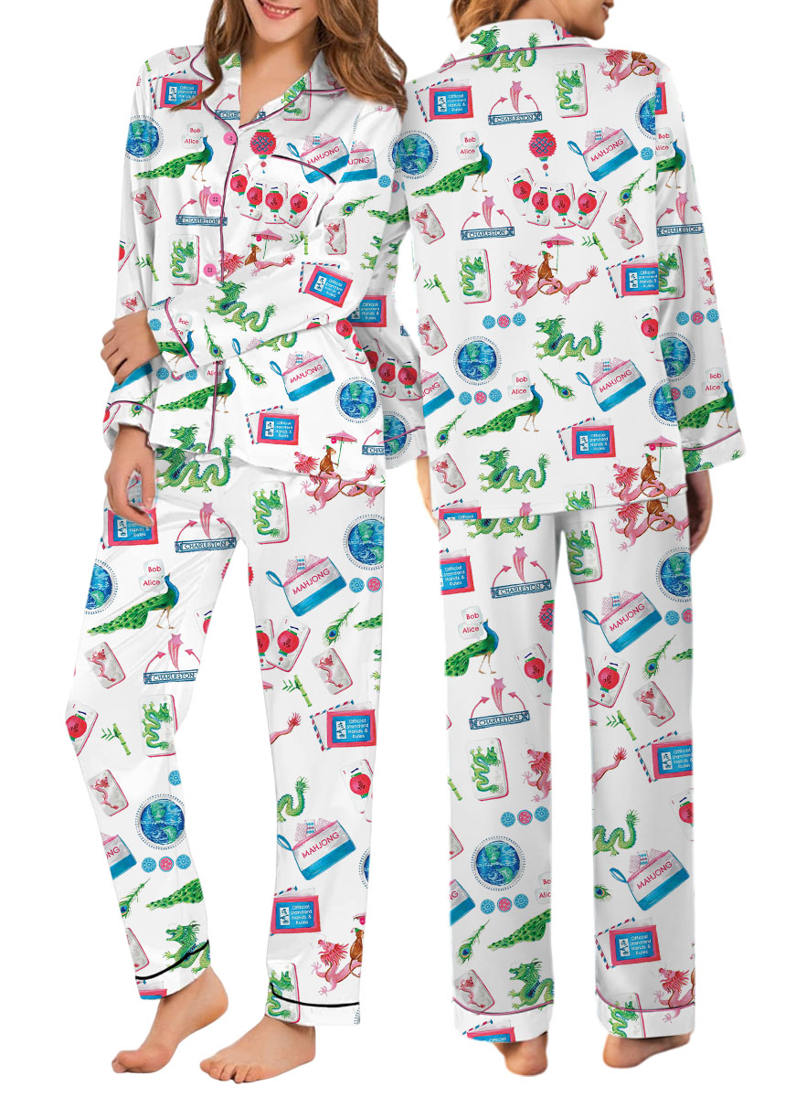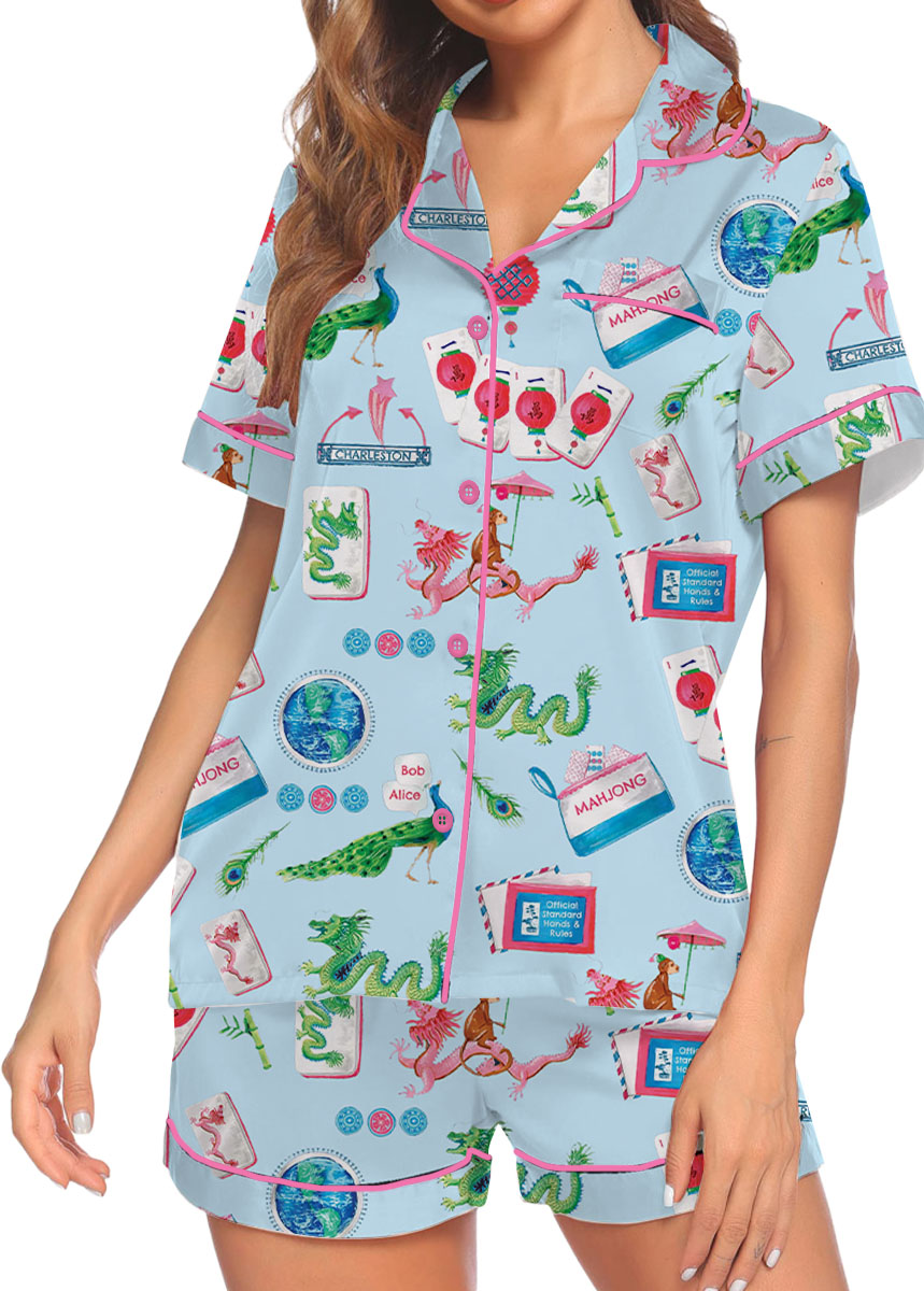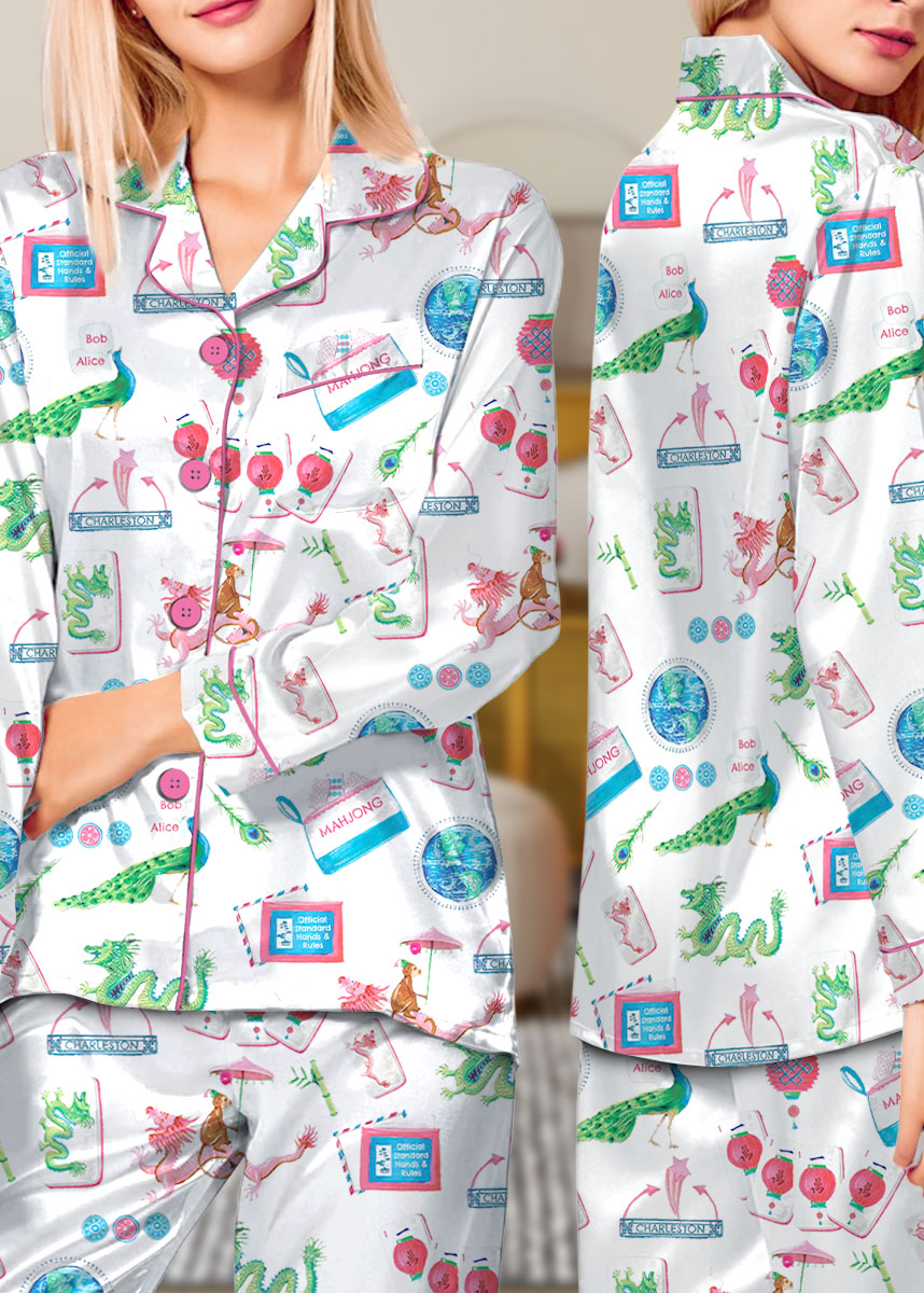 Women’s Chinoiserie Mahjong Satin Pajamas Set For Women, White And Light Blue Color, US Size S-5XL