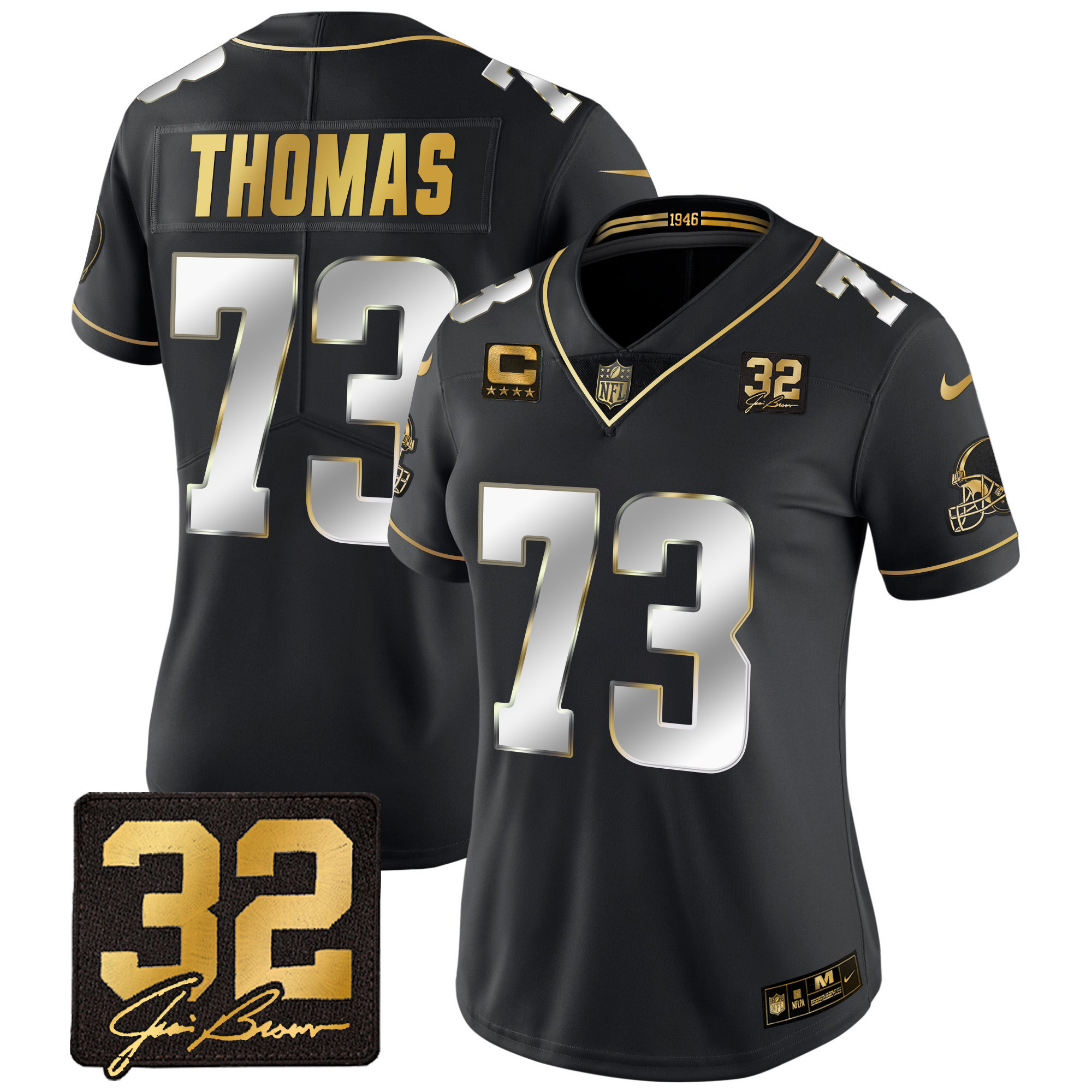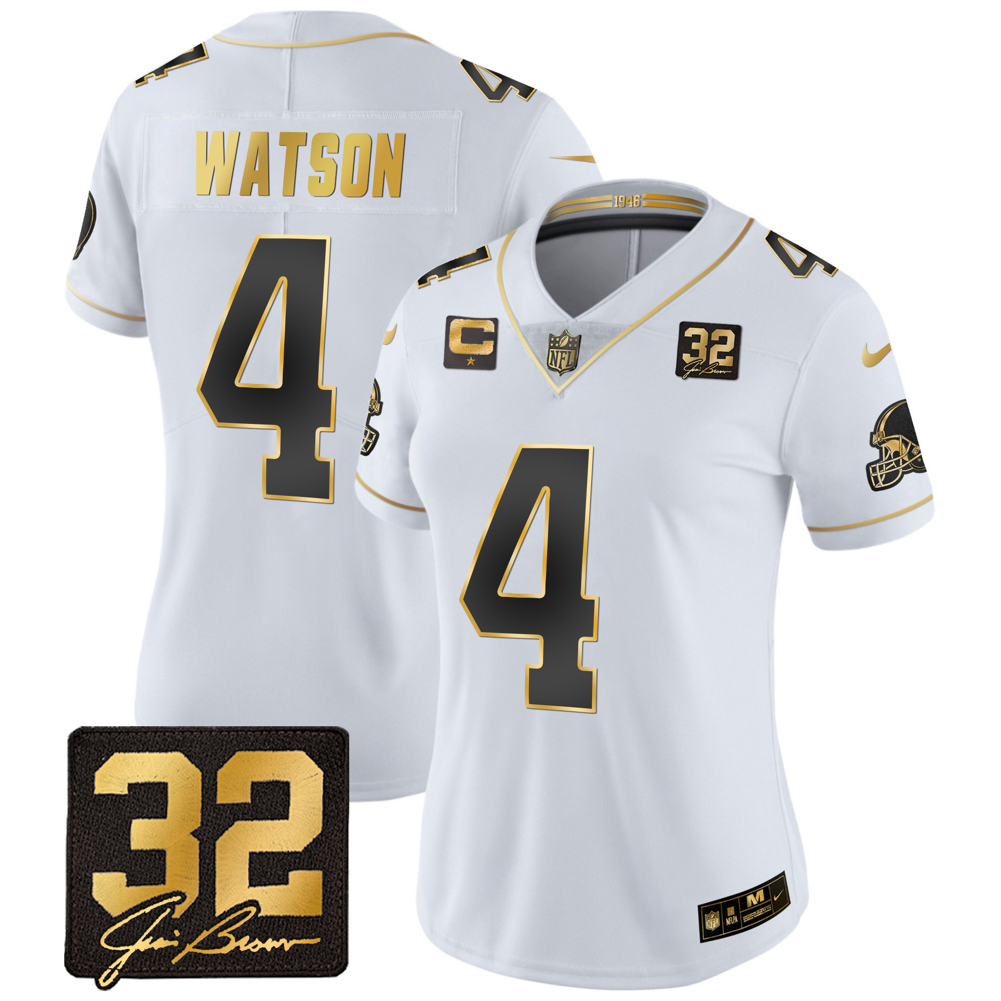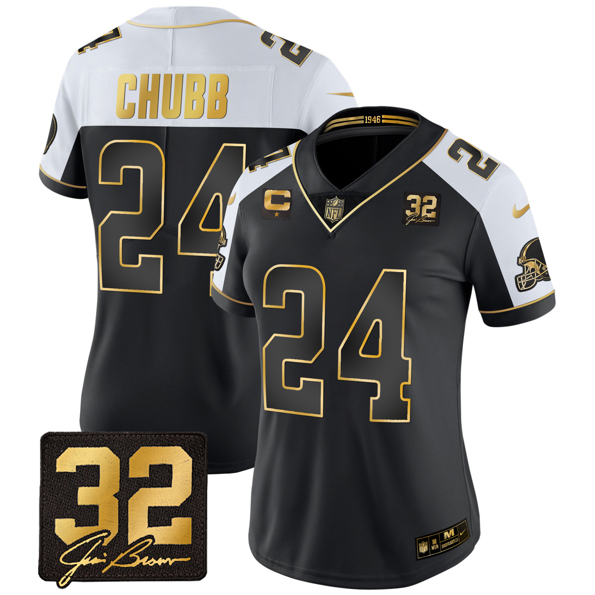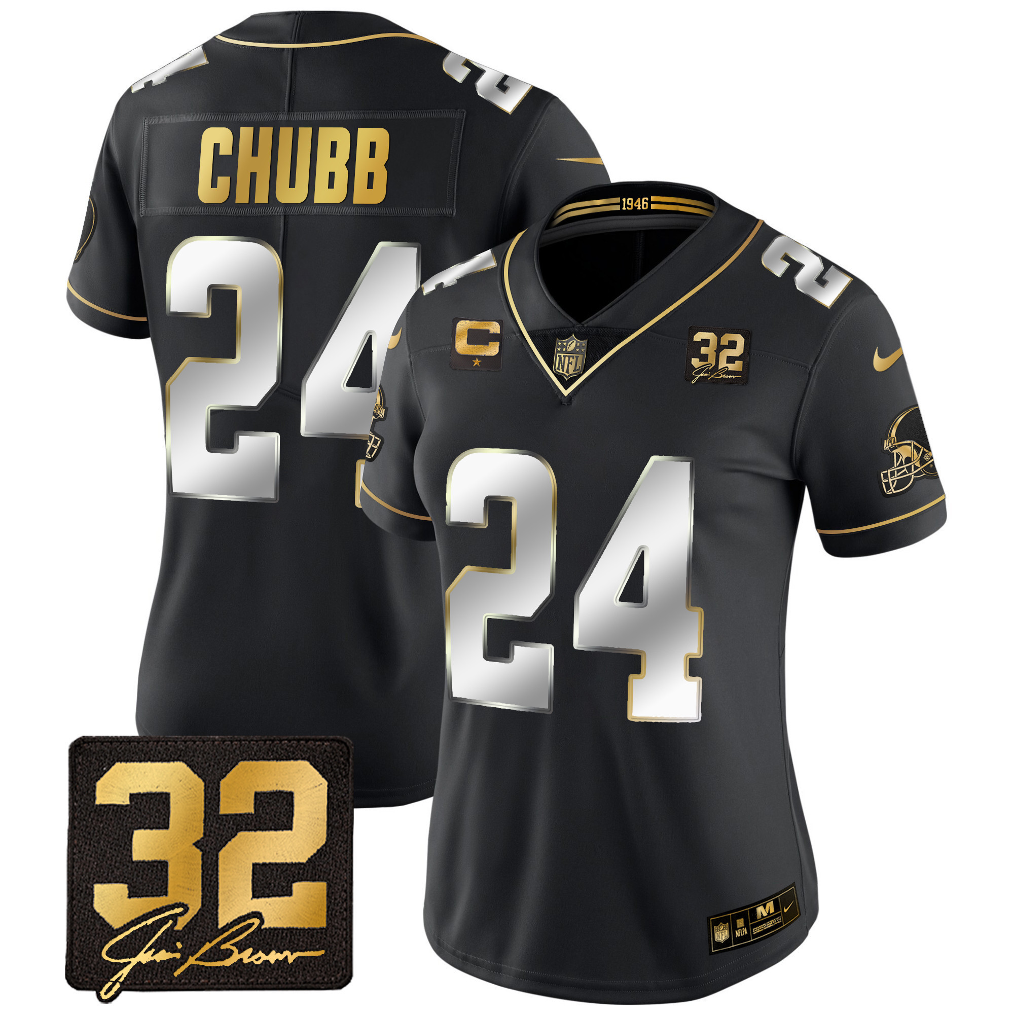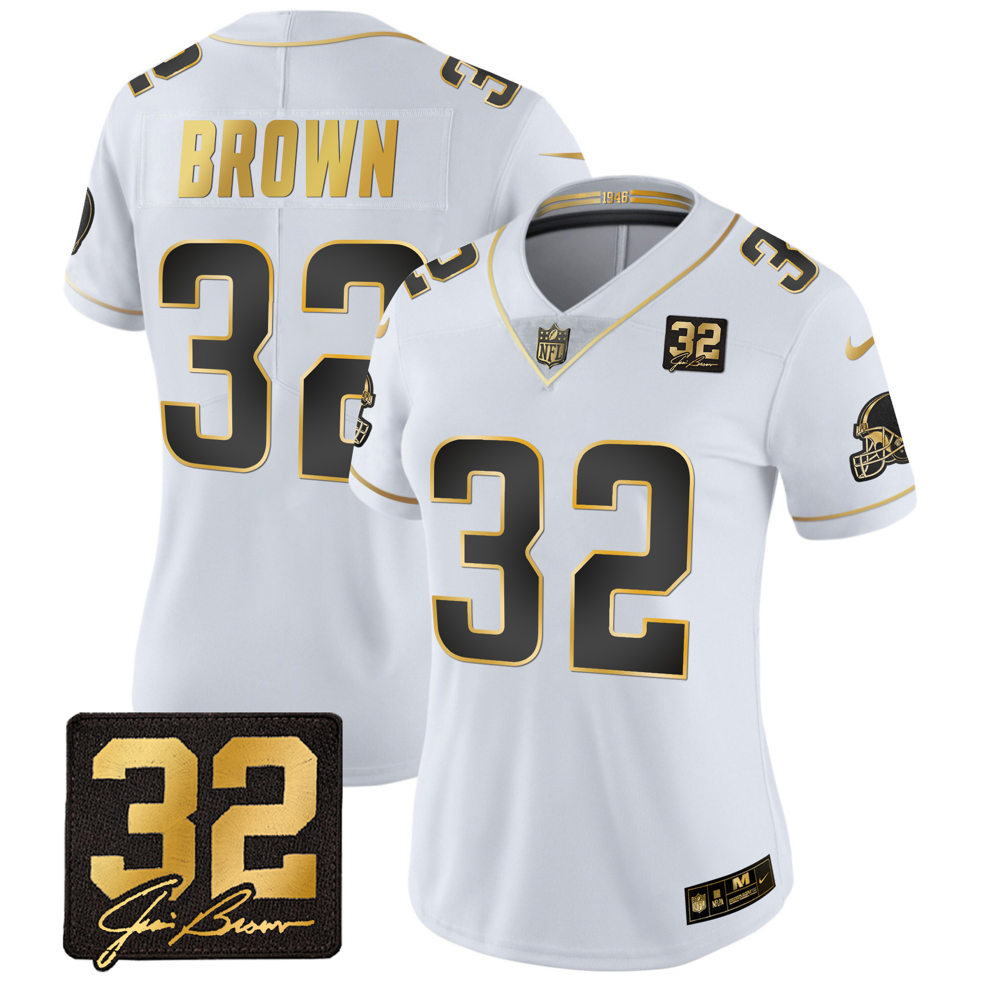Women’s Cleveland Browns #32 Jim Brown Memorial Patch Gold Jersey – All Stitched