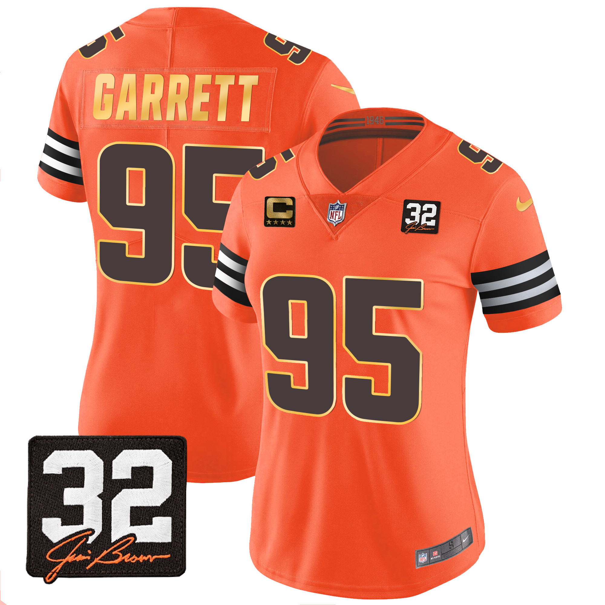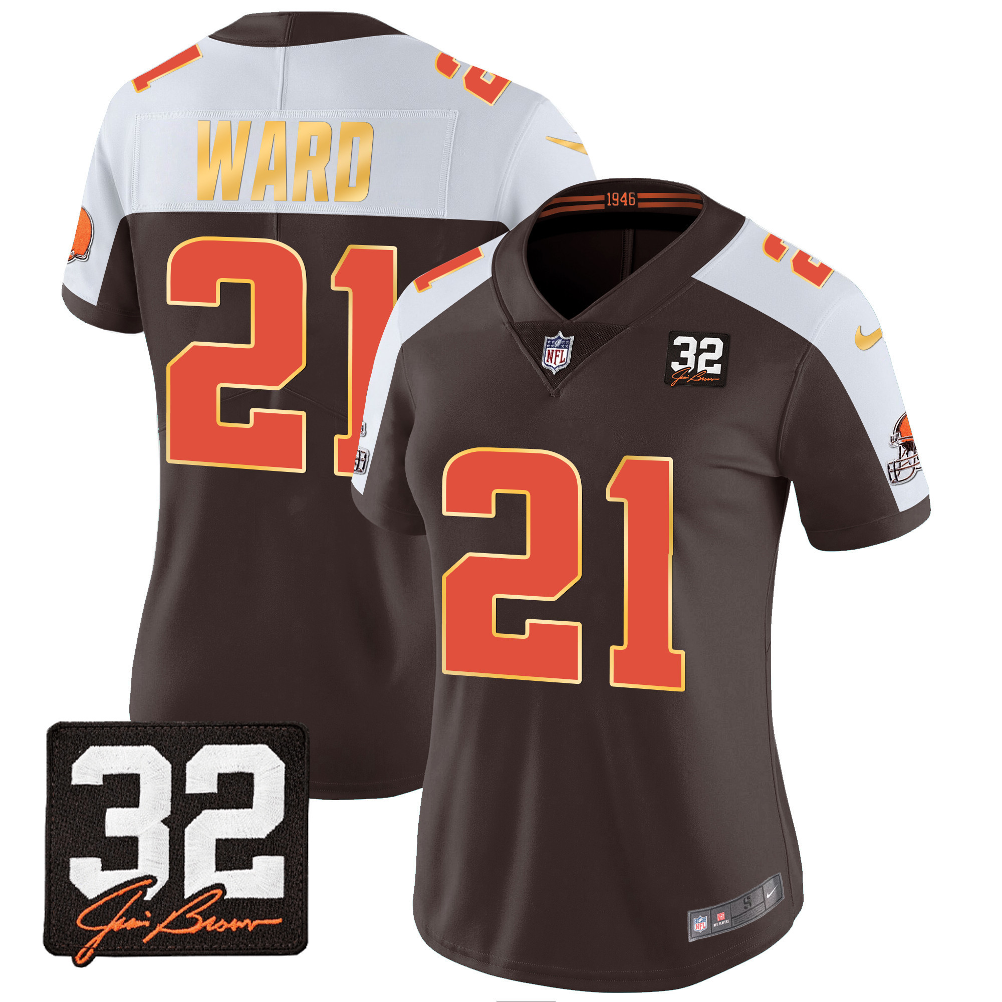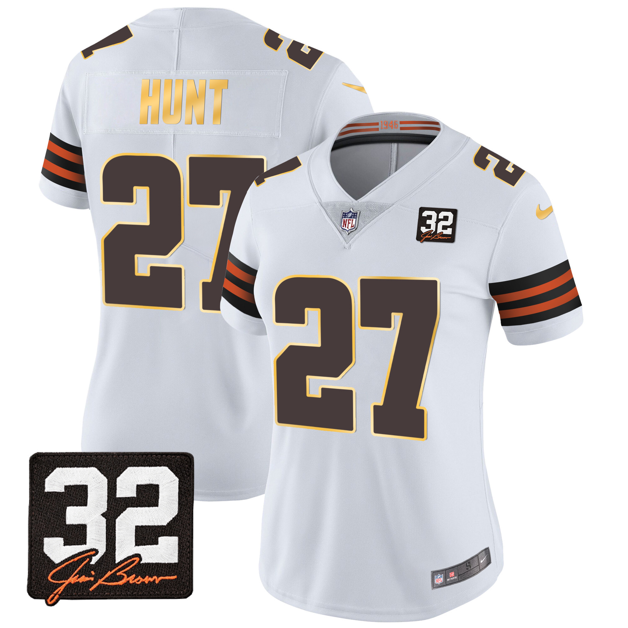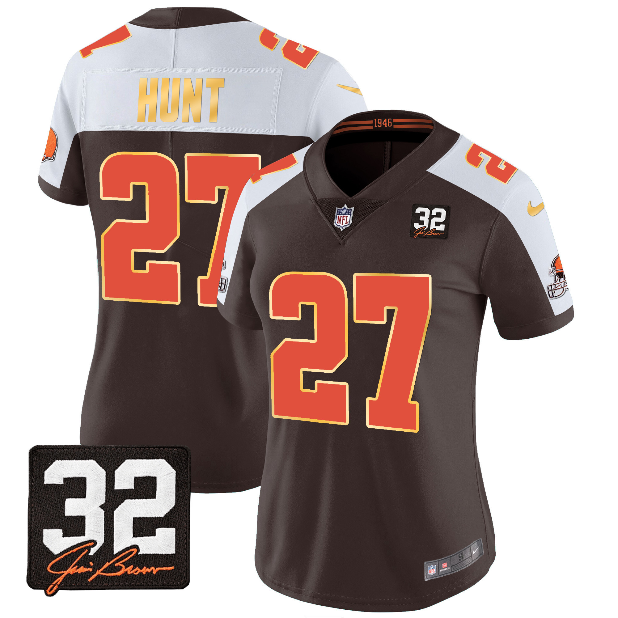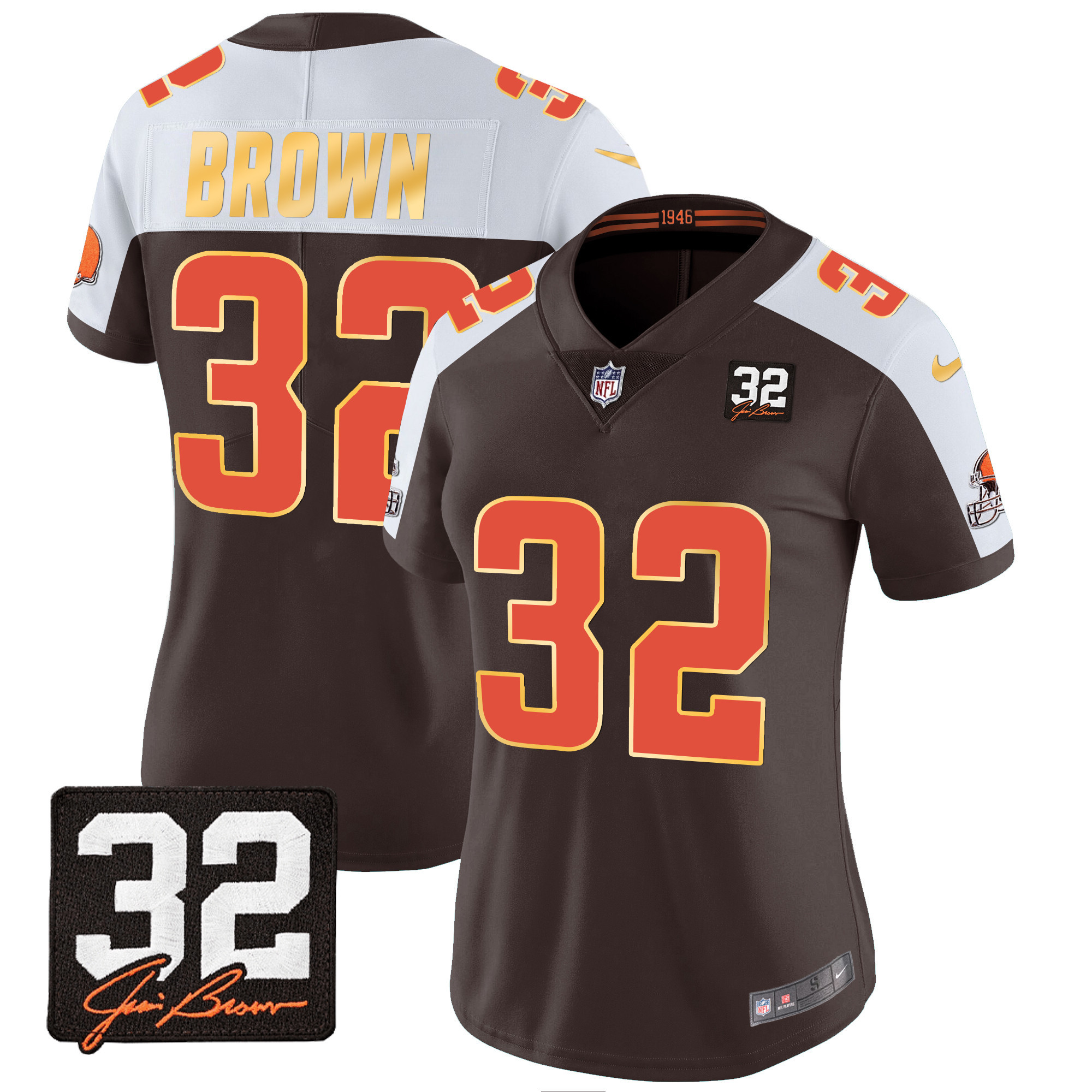Women’s Cleveland Browns #32 Jim Brown Memorial Patch Gold Trim Jersey – All Stitched