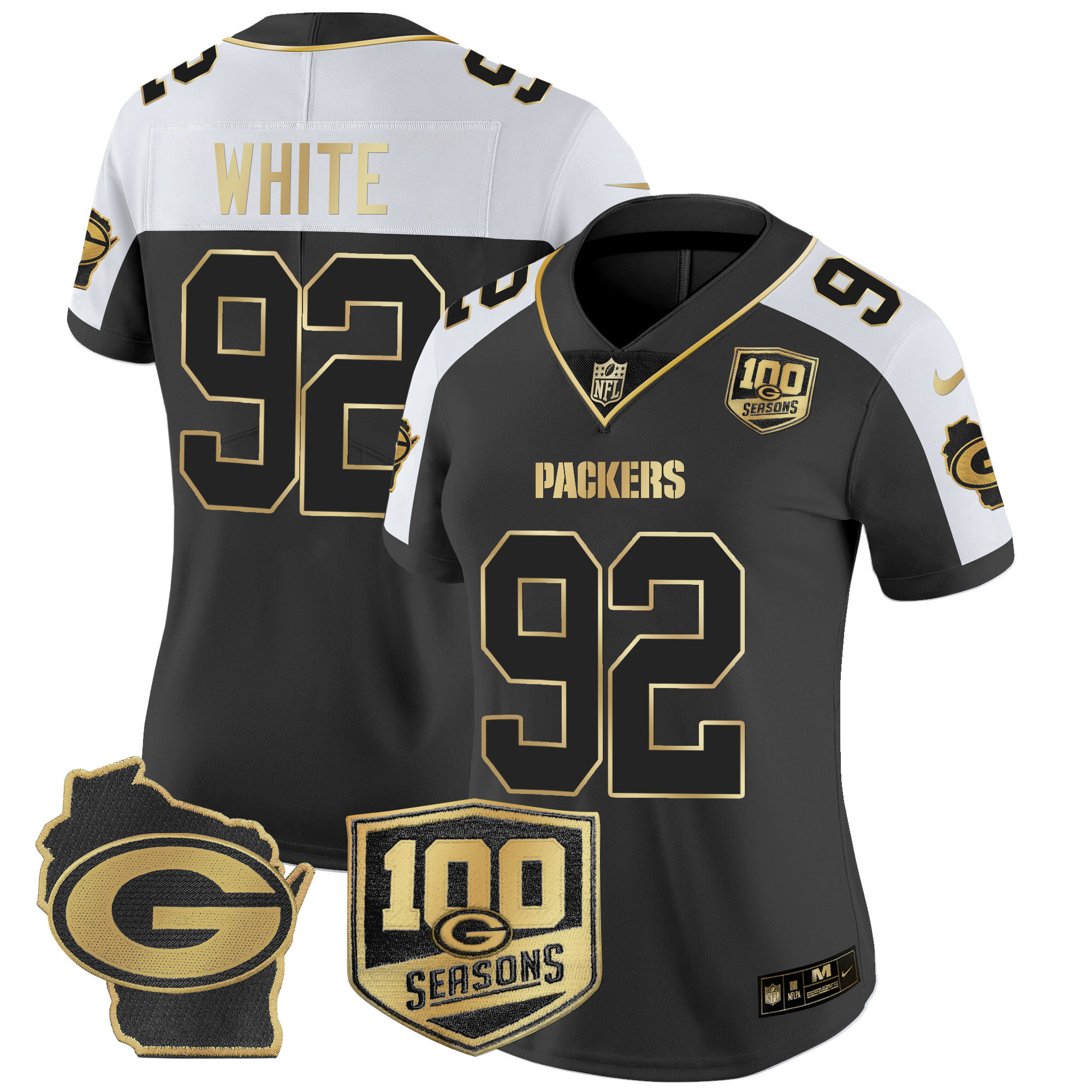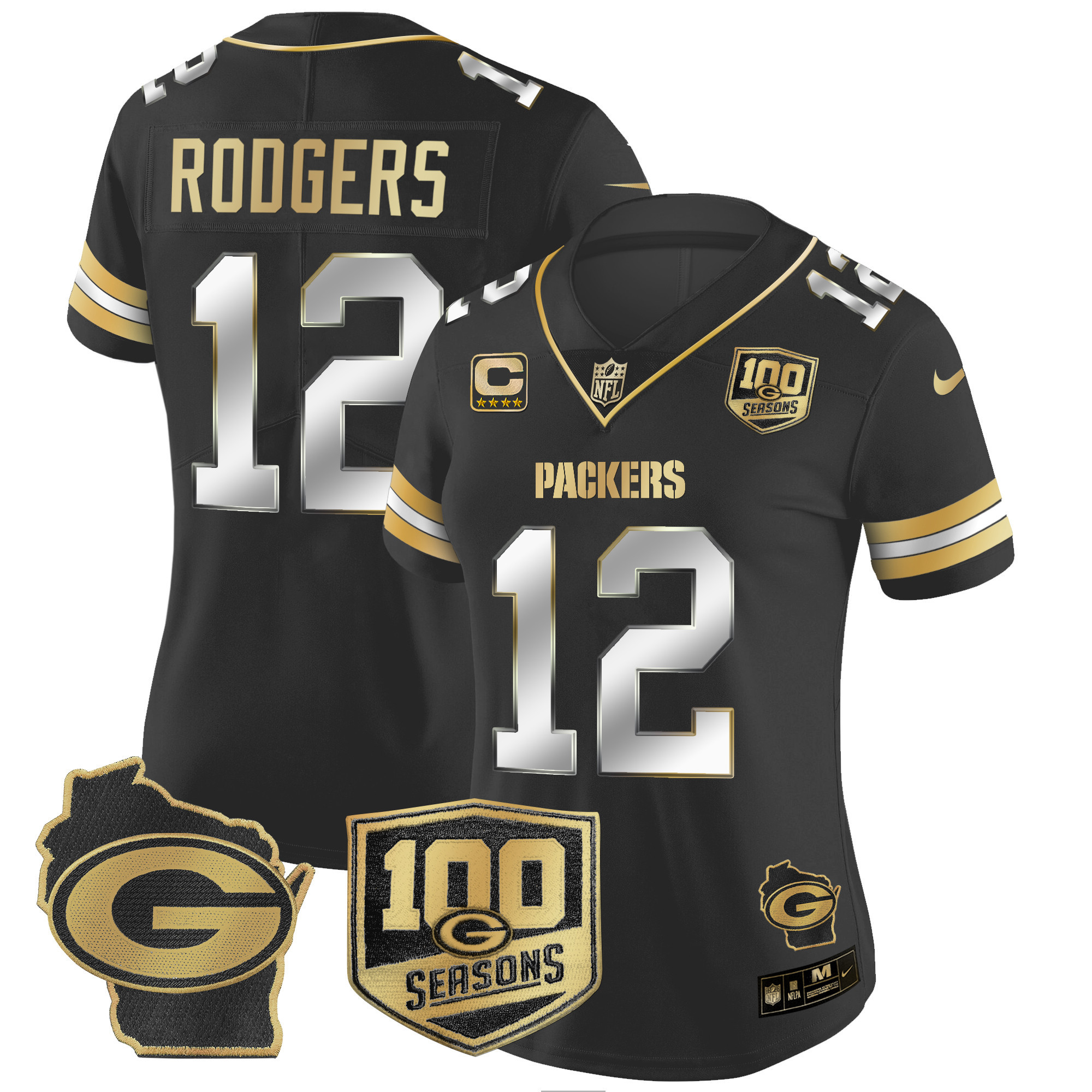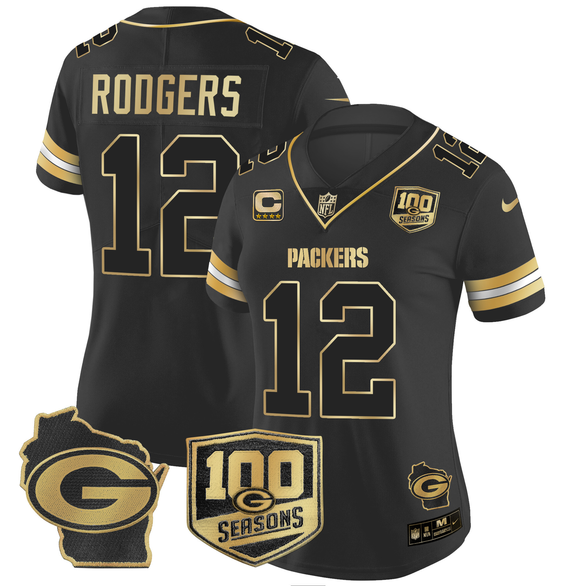 Women’s Green Bay Packers 100th Season & Home Patch Gold Vapor Limited Jersey – All Stitched