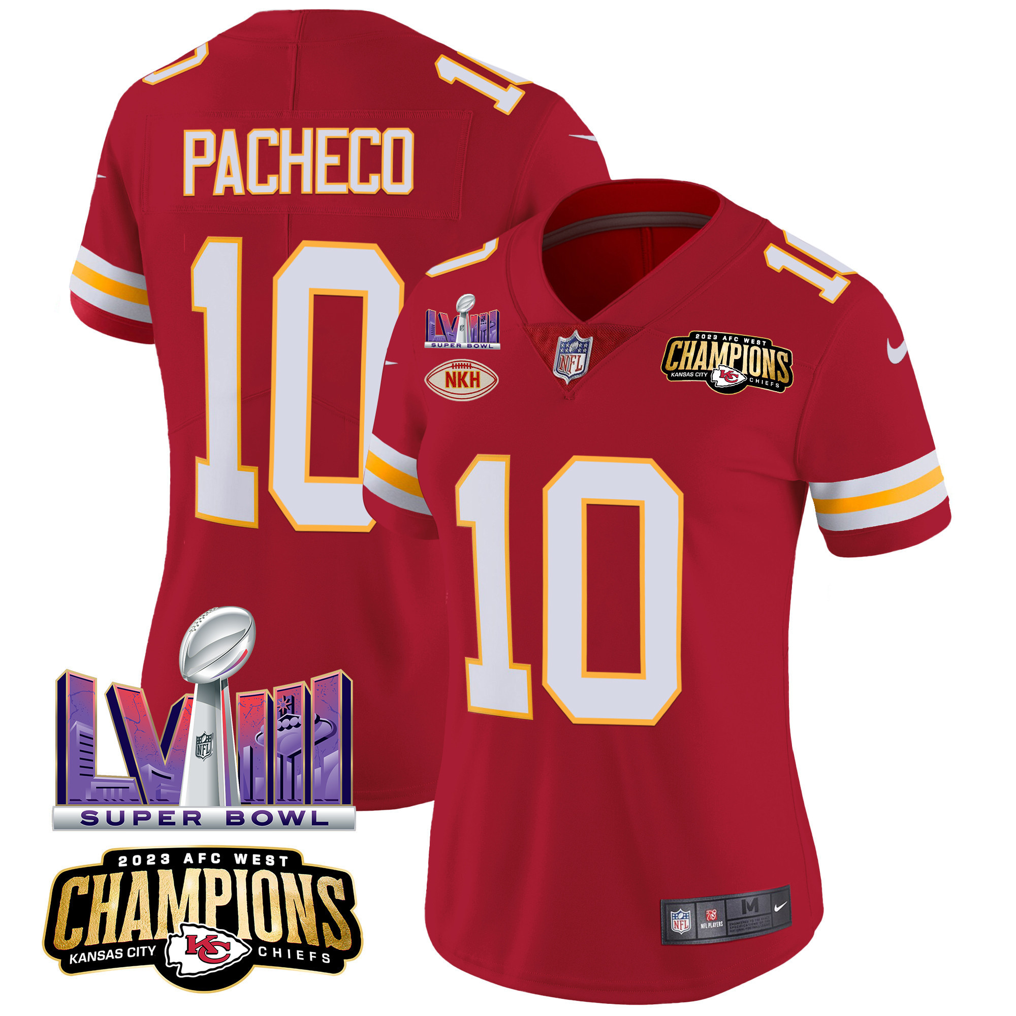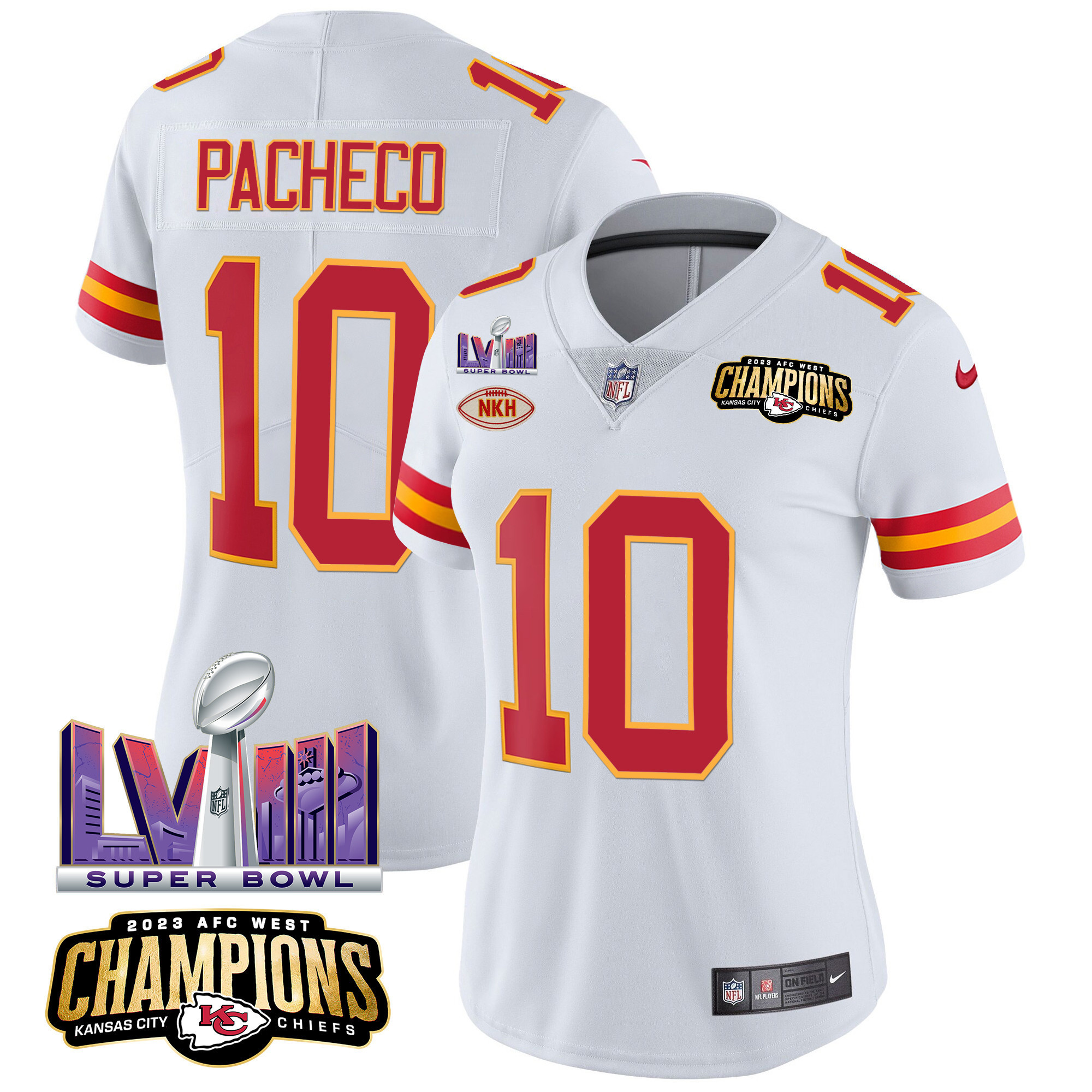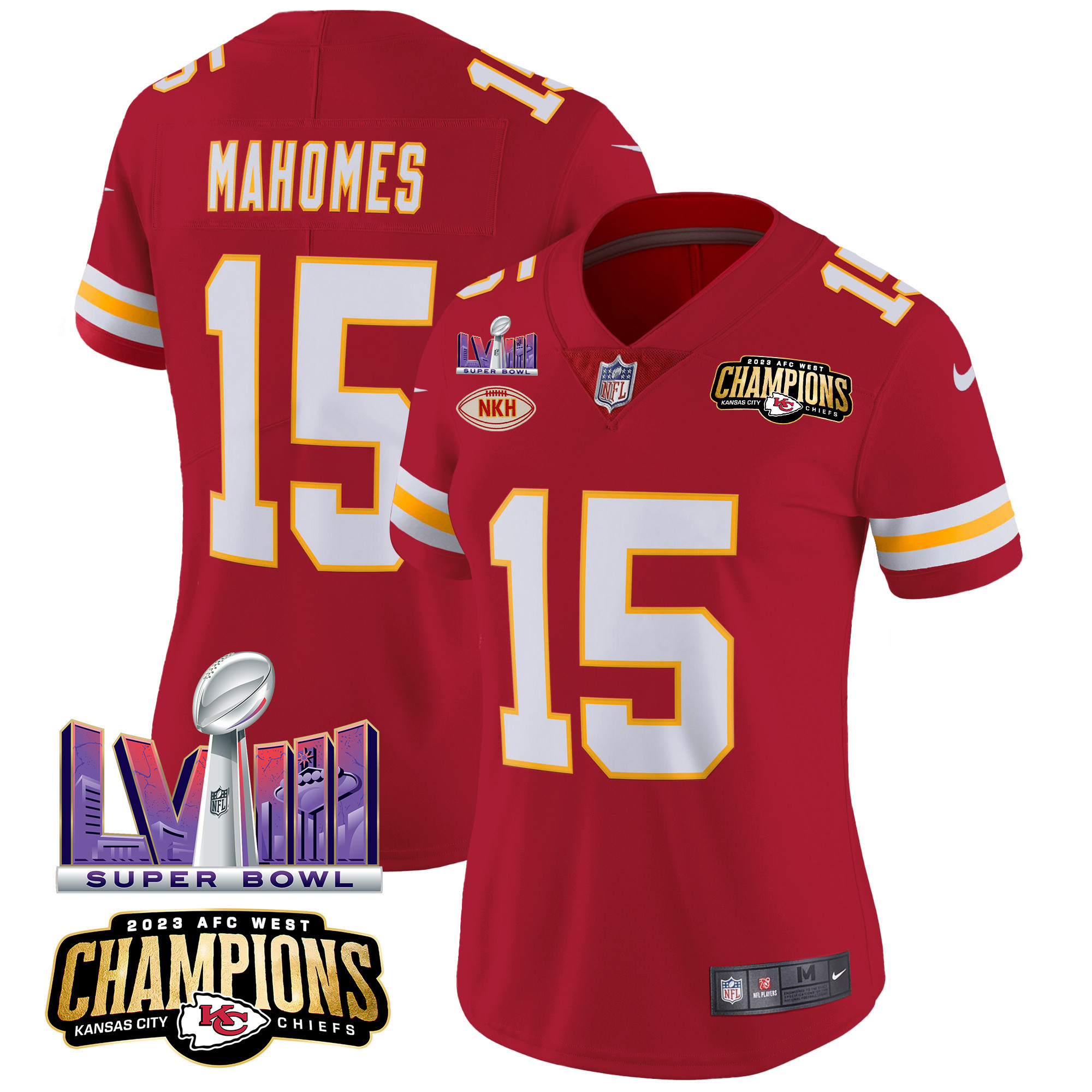 Women’s Kansas City Chiefs AFC West Champions & Super Bowl LVIII Patch Vapor Jersey – All Stitched