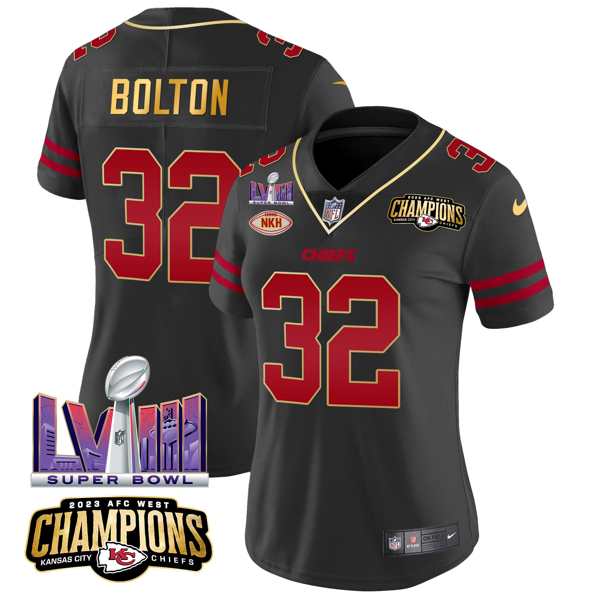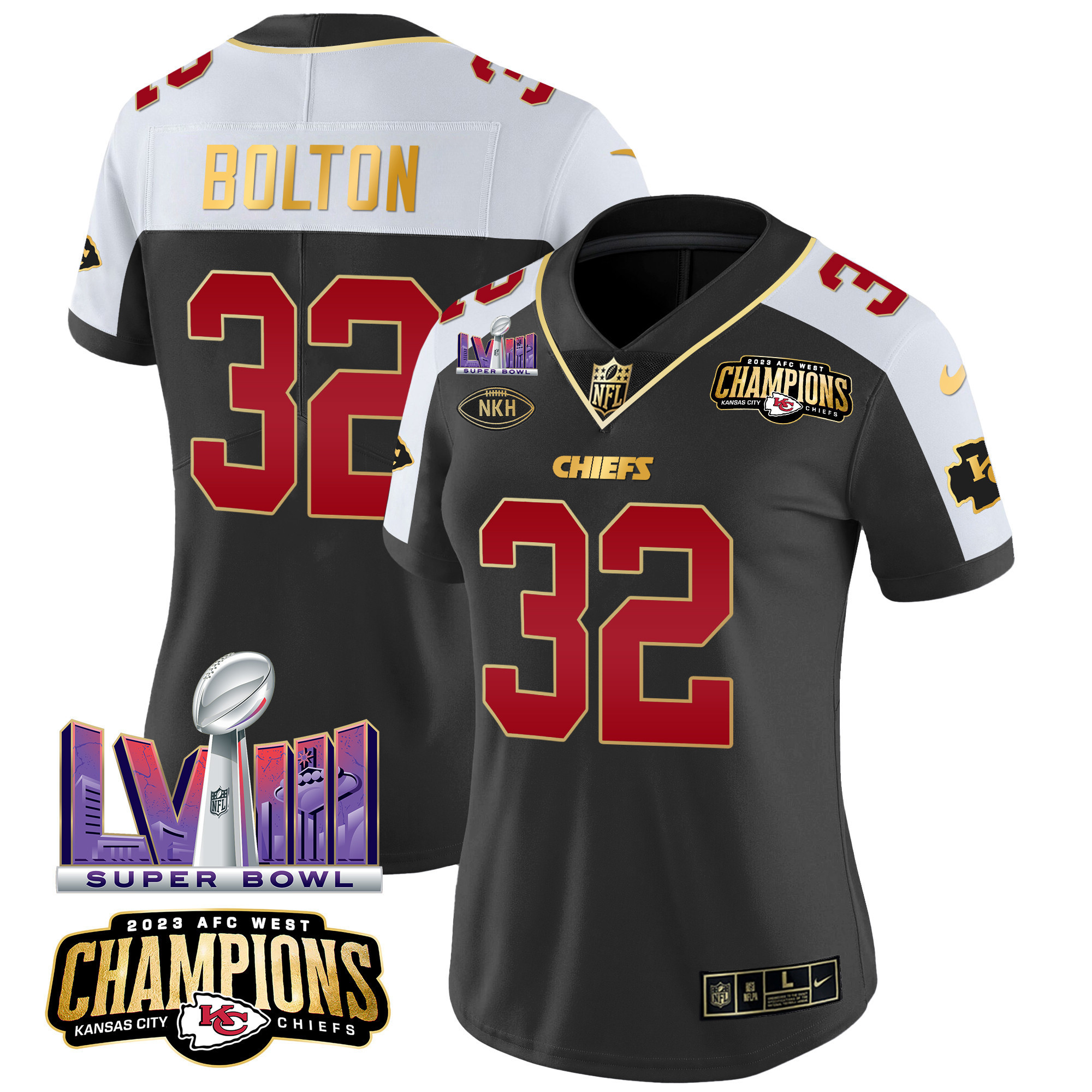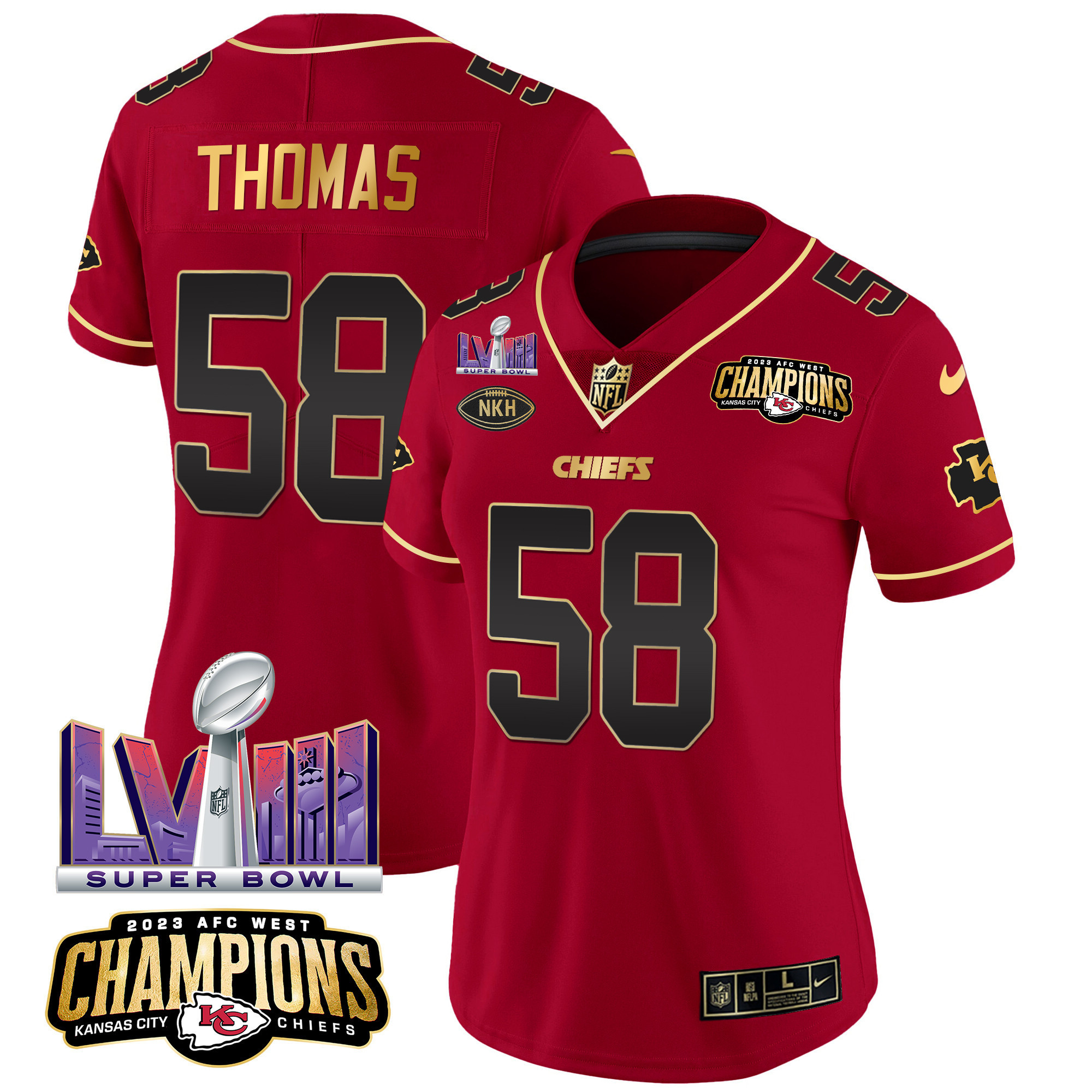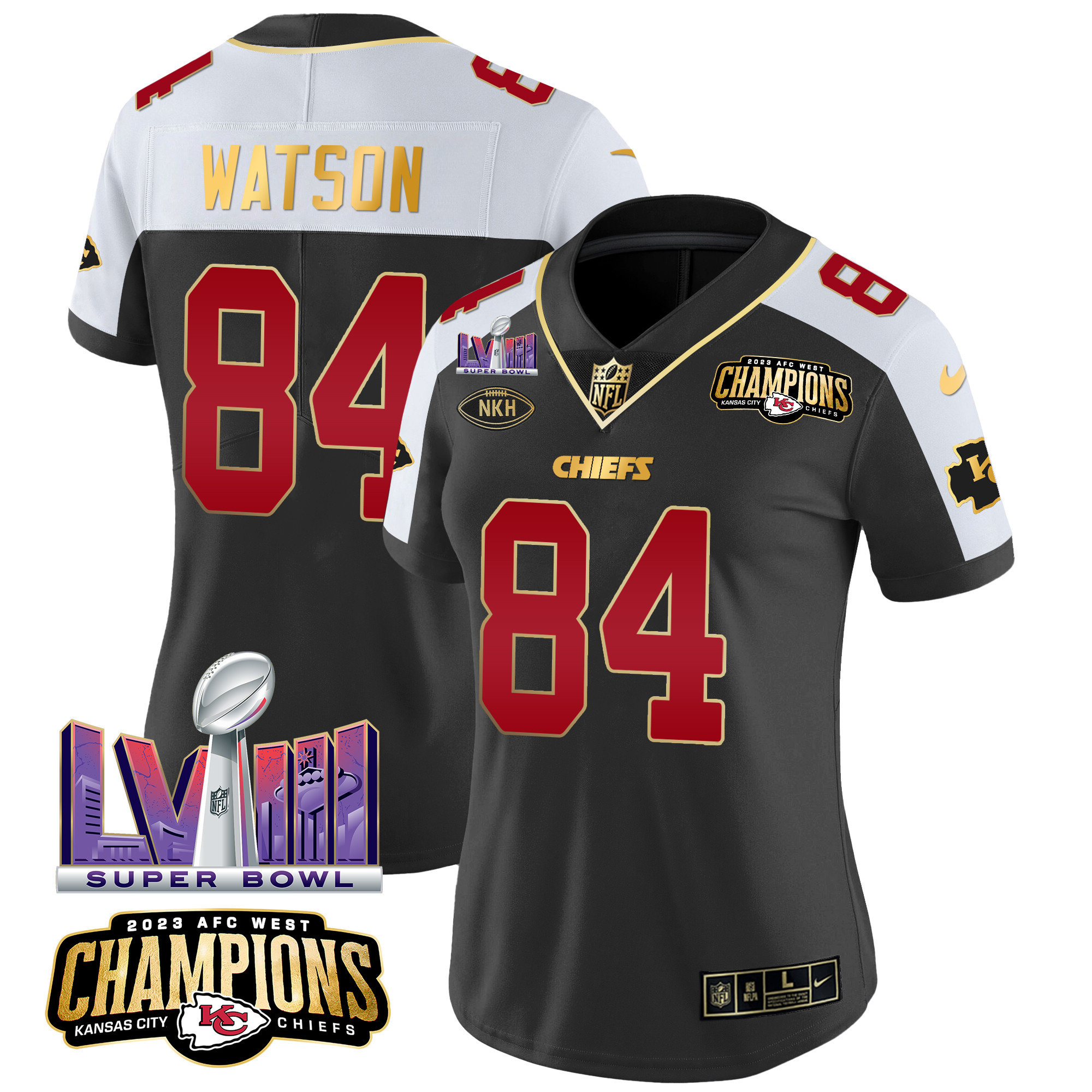 Women’s Kansas City Chiefs AFC West Champions & Super Bowl LVIII Patch Vapor Jersey – All Stitched