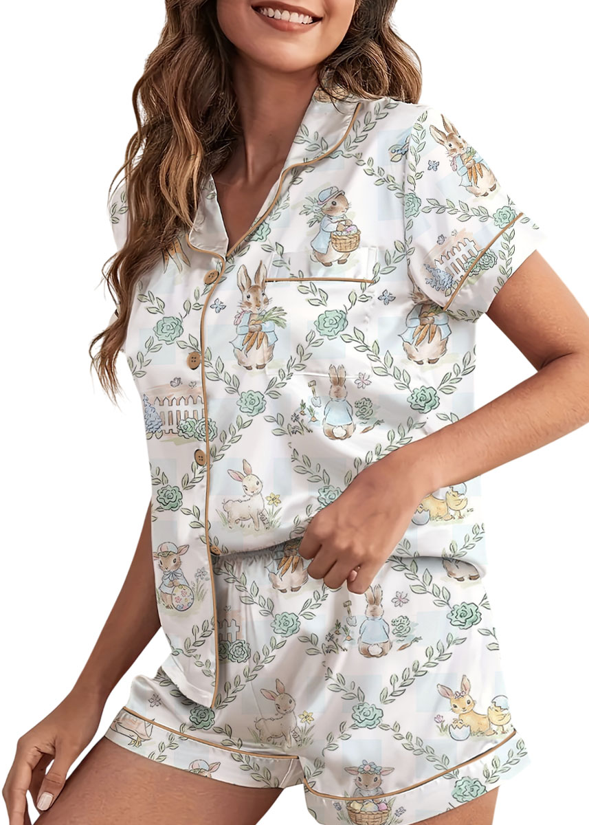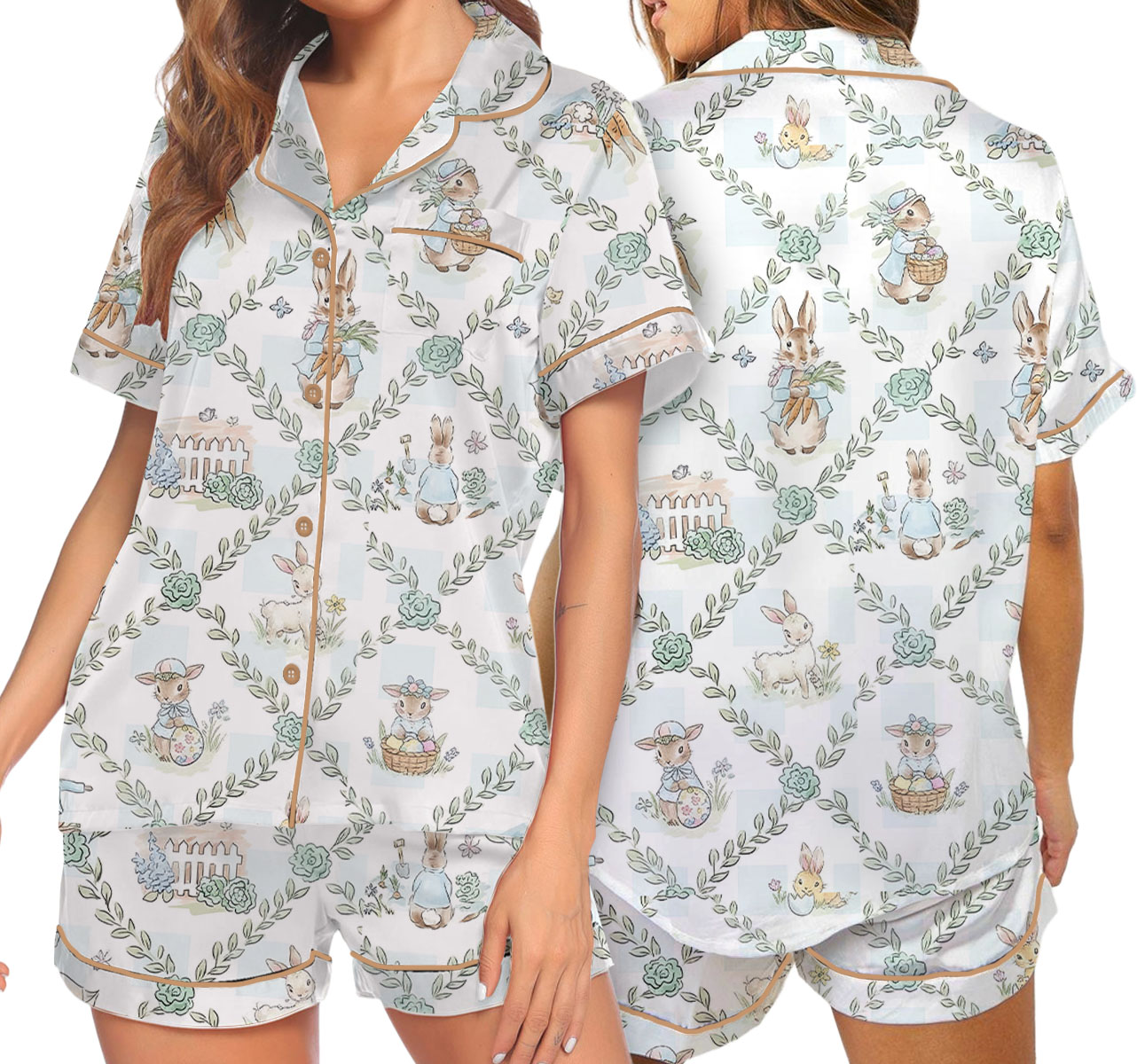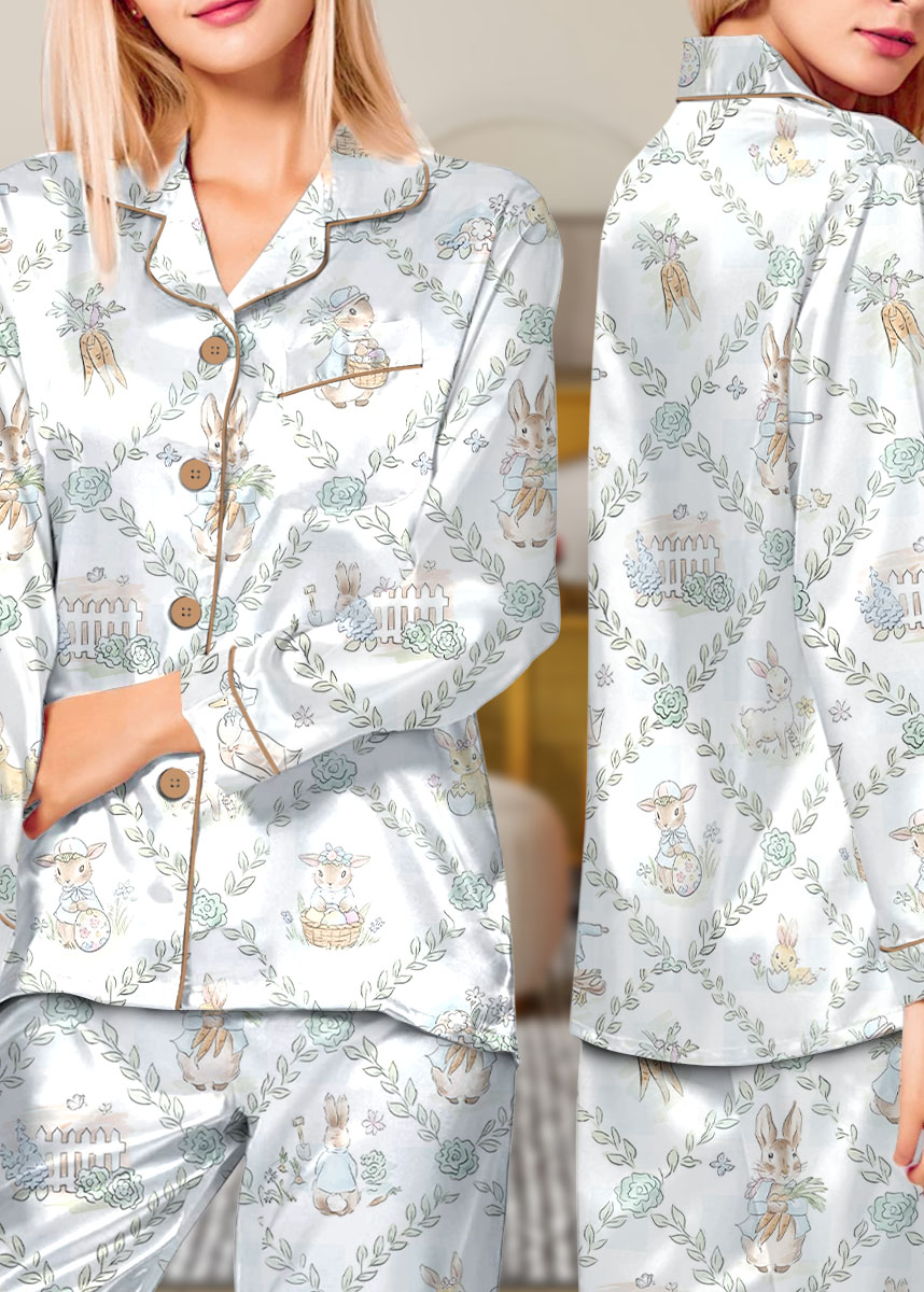 Women’s Peter Rabbit And Friends Satin Pajamas Set For Women, White Color, US Size S-5XL