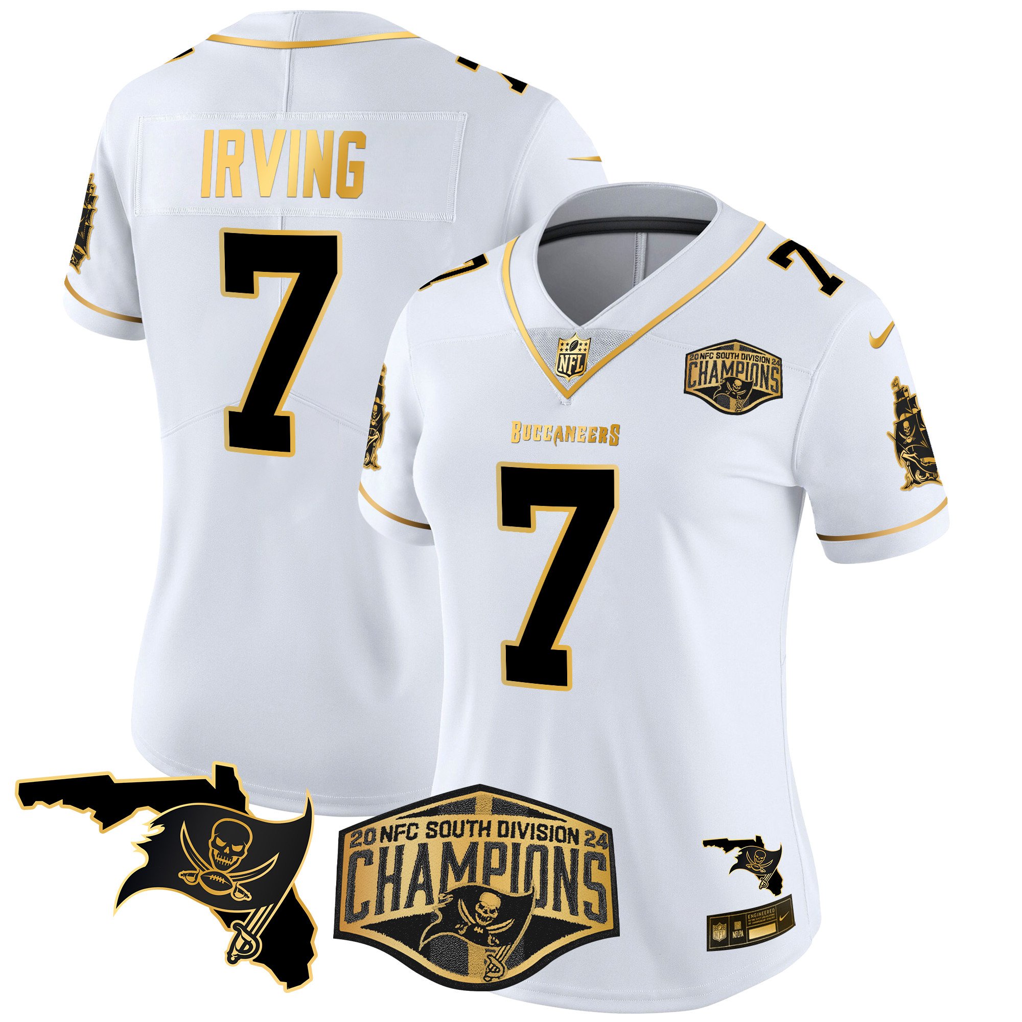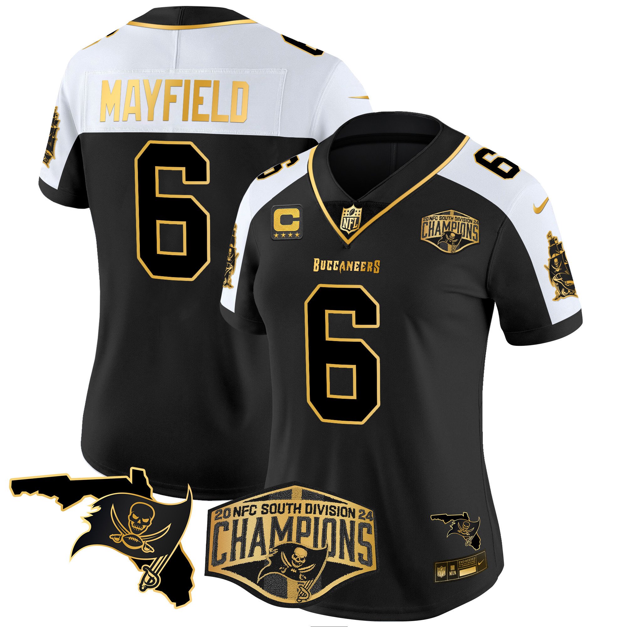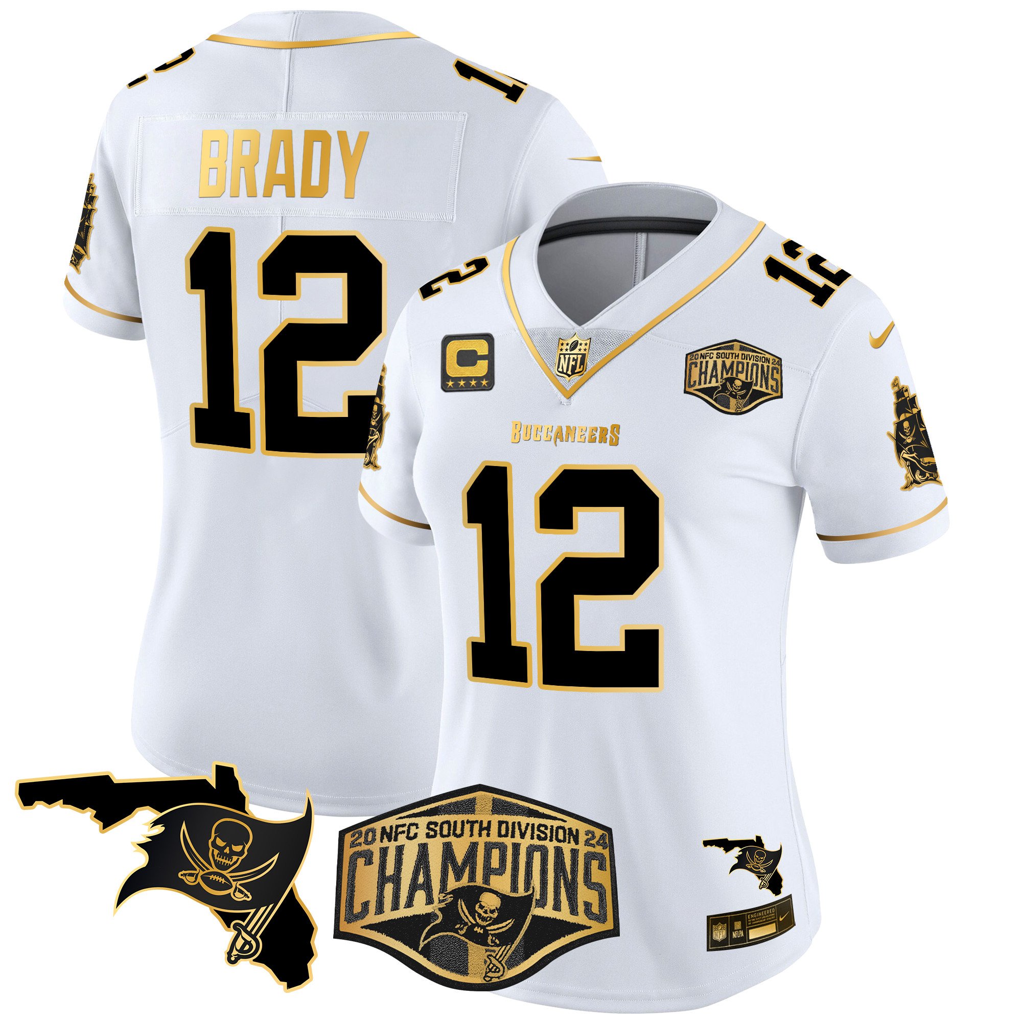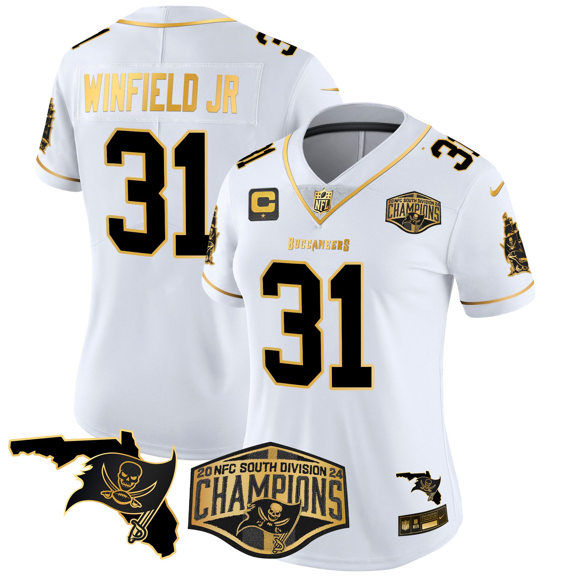 Women’s Tampa Bay Buccaneers 2024 NFC South Division Champions Patch Gold Vapor Limited Jersey – All Stitched