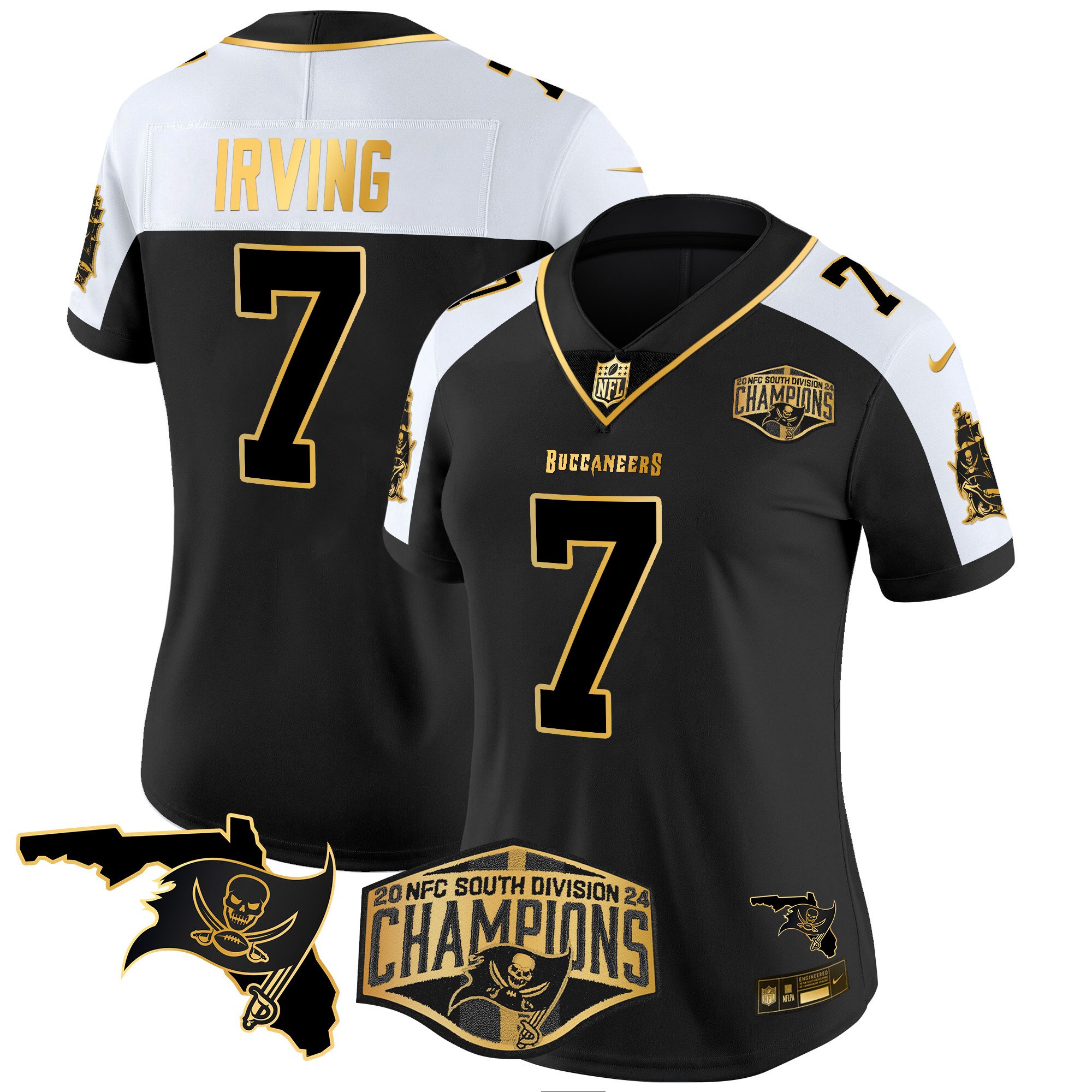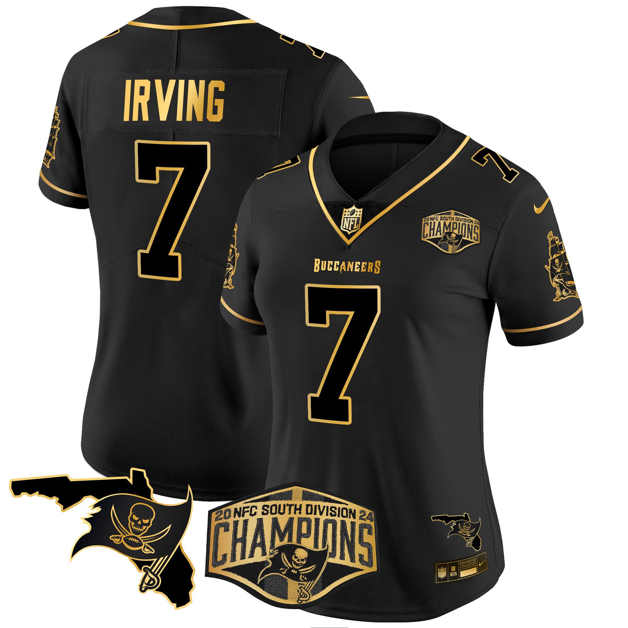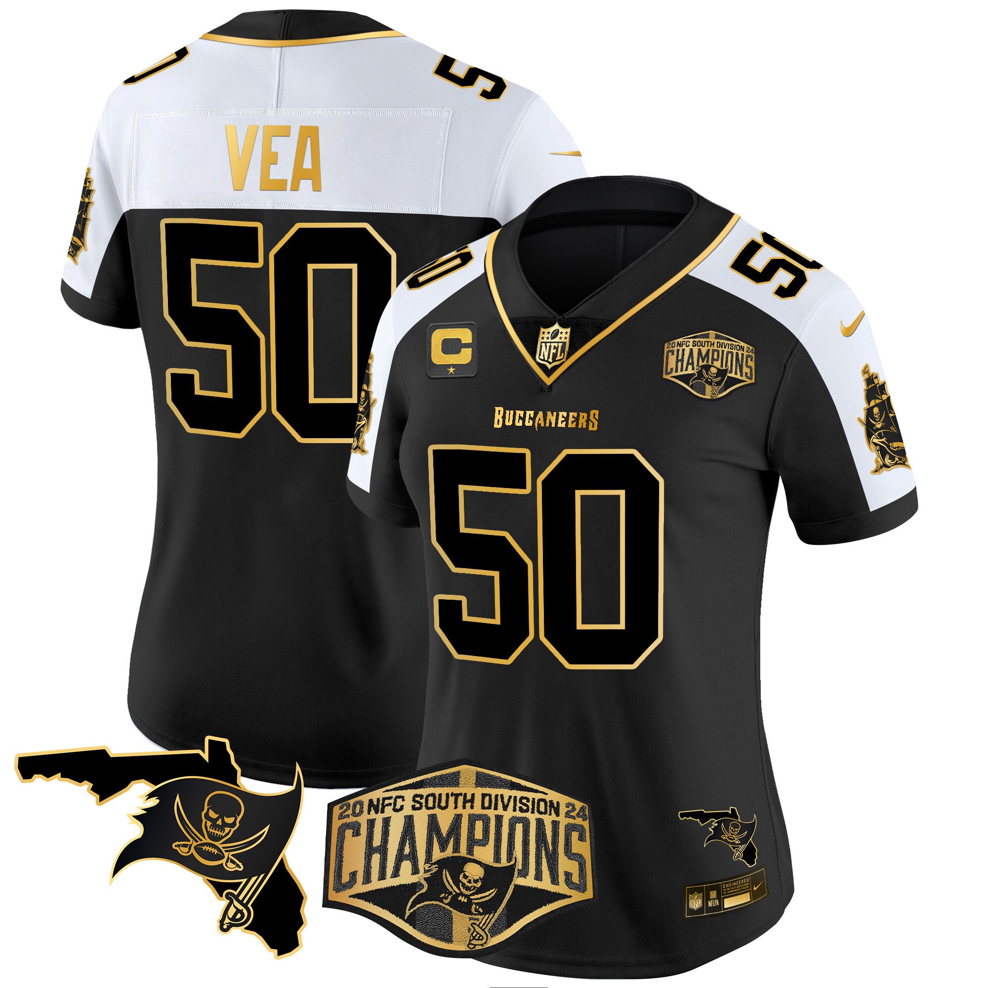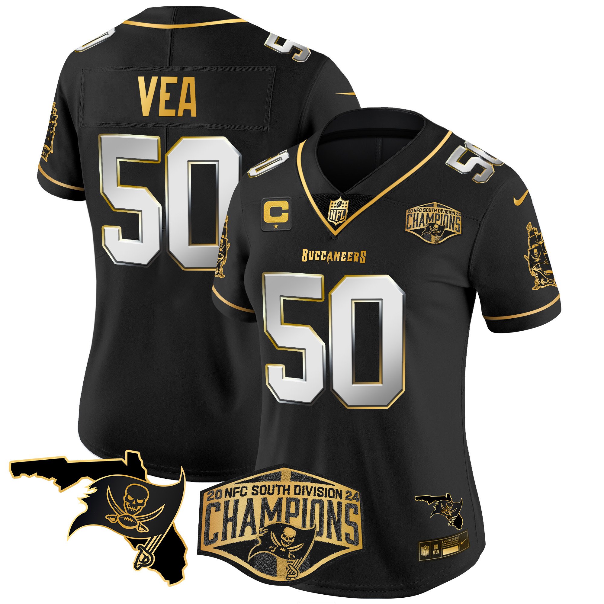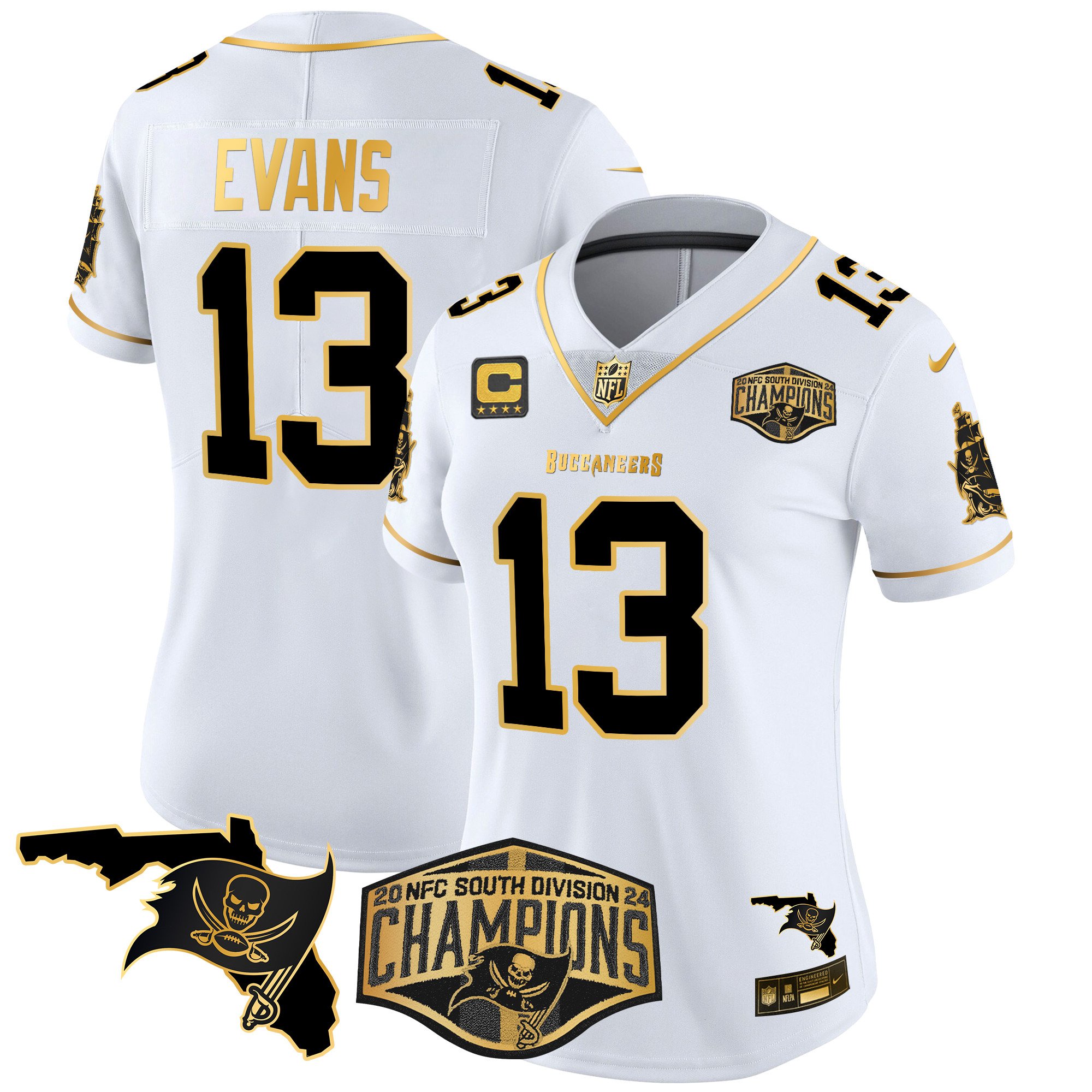 Women’s Tampa Bay Buccaneers 2024 NFC South Division Champions Patch Gold Vapor Limited Jersey – All Stitched